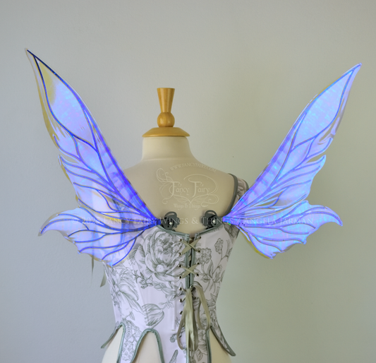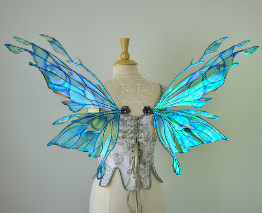 Hand made Iridescent fairy wings with convertible & poseable wing panels, with a vein framework cut from aluminum sheet that's been powder coated & laminated with shimmering iridescent vinyl