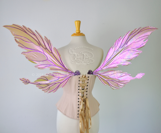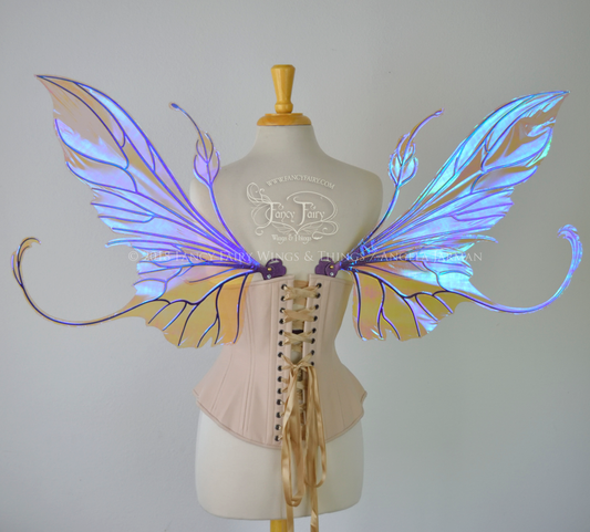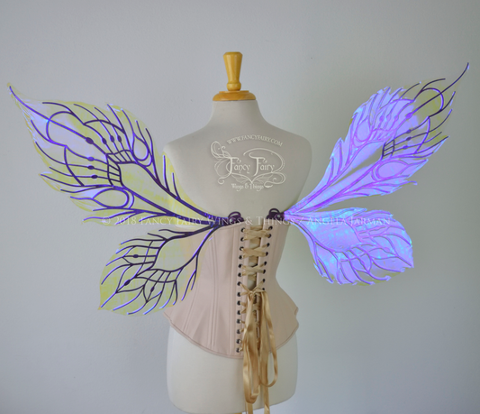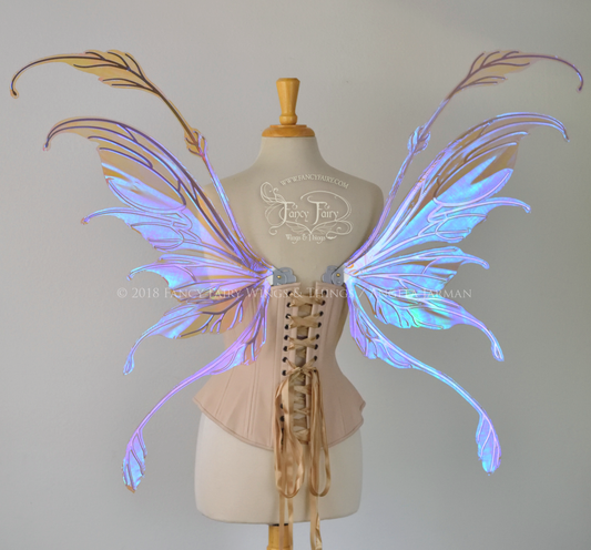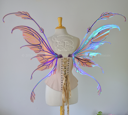 Hand made Iridescent fairy wings with convertible & poseable wing panels, with a vein framework cut from aluminum sheet that's been powder coated & laminated with shimmering iridescent vinyl
