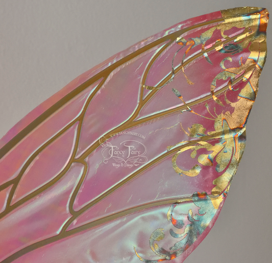 Ellette Painted Iridescent Fairy Wings in Rose Satin with Metallic Filigree Foil