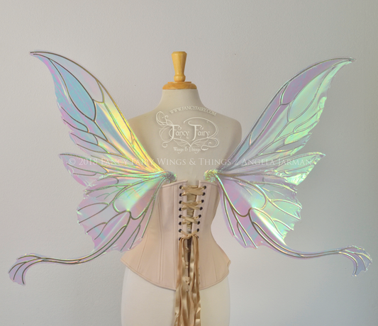 Guinevere Iridescent Fairy Wings in White Satin with Candy Coat Gold veins