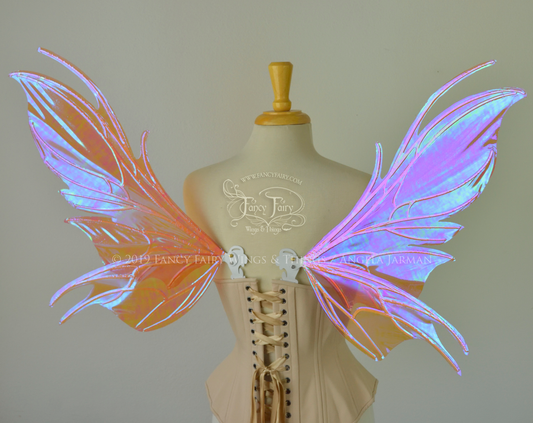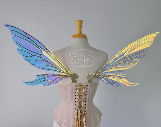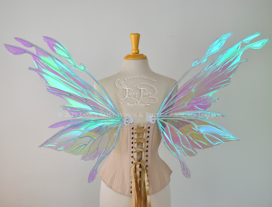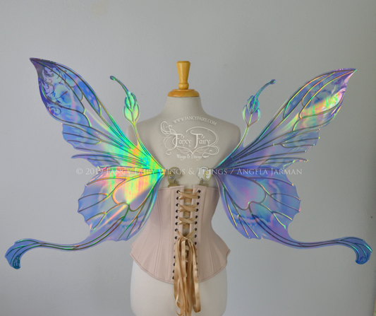 Hand made Iridescent fairy wings with convertible & poseable wing panels, with a vein framework cut from aluminum sheet that's been powder coated & laminated with shimmering iridescent vinyl