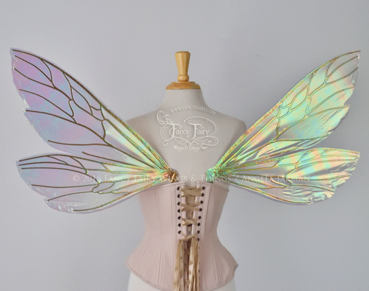 Hand made Iridescent fairy wings with convertible & poseable wing panels, with a vein framework cut from aluminum sheet that's been powder coated & laminated with shimmering iridescent vinyl
