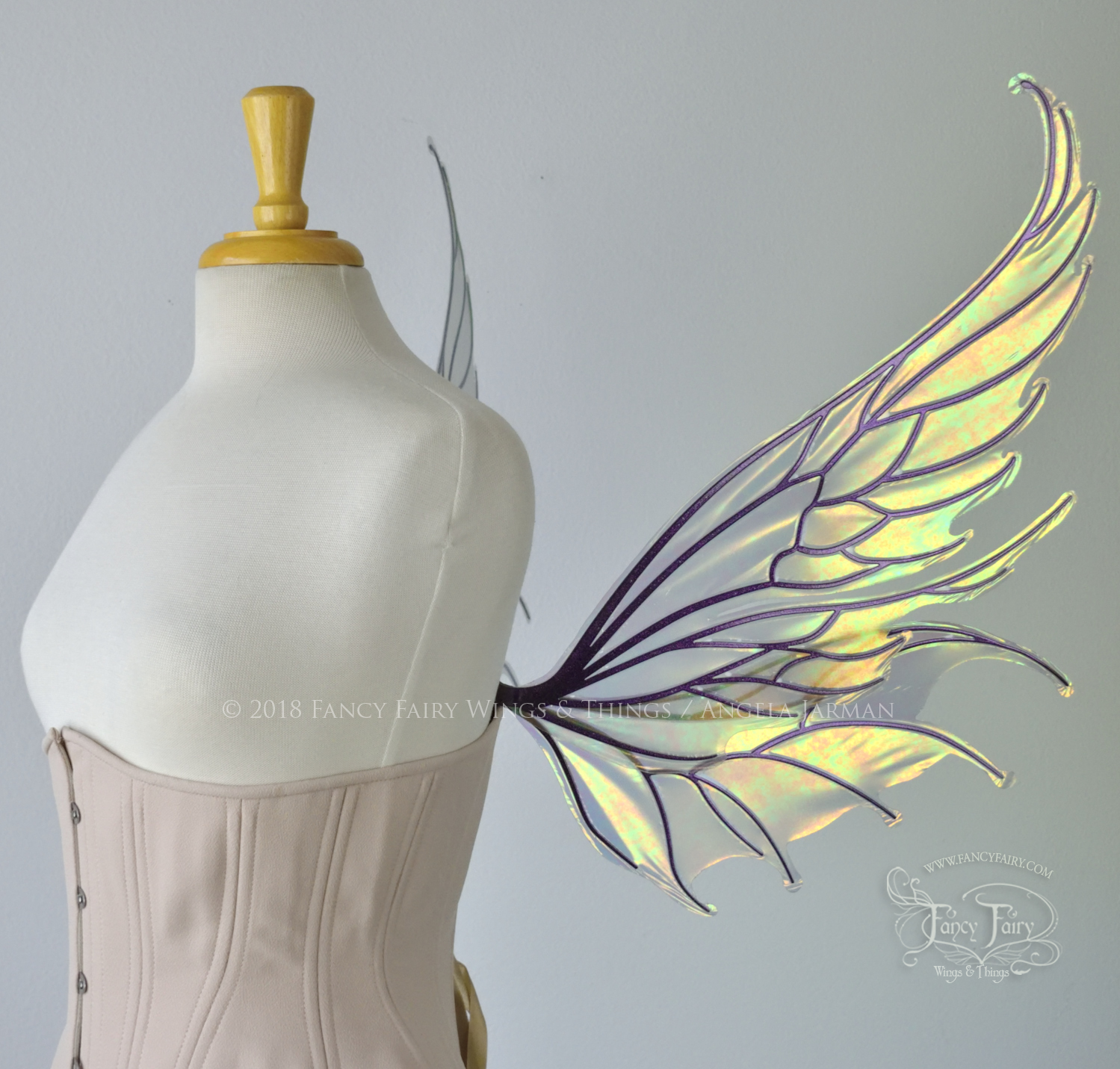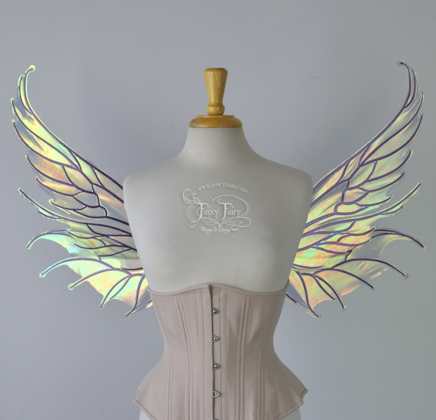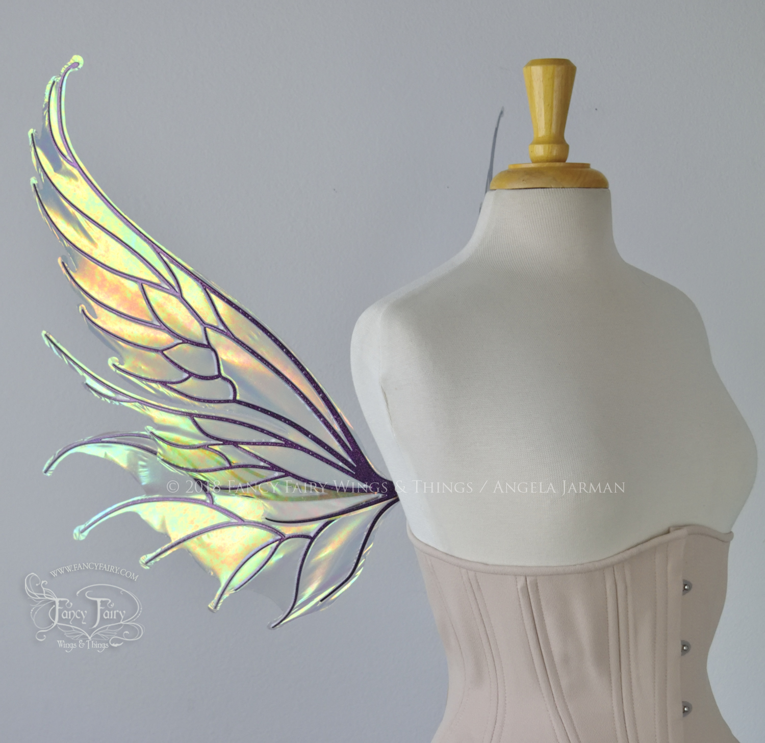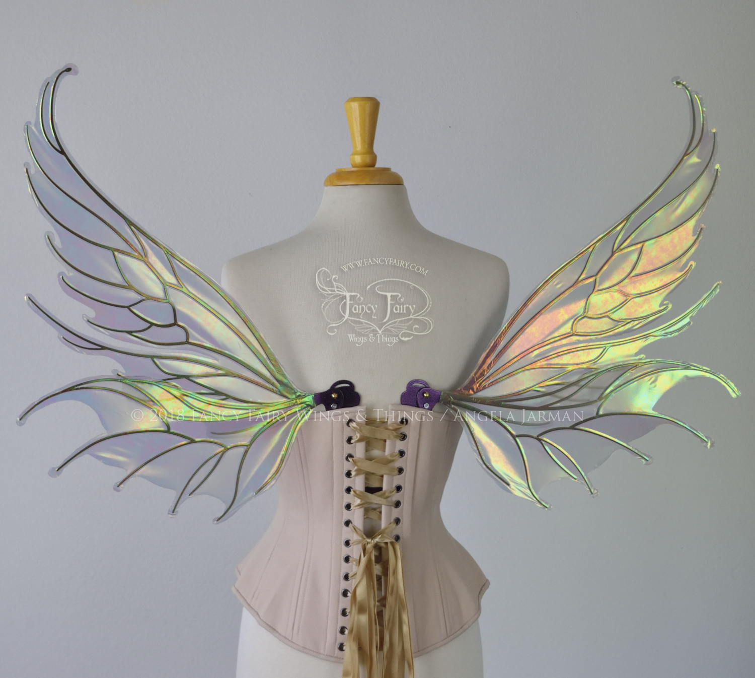 All Fancy Fairy wings are cut from a .040" thick lightweight yet sturdy aluminum sheet frame that's been powder coated and encased in iridescent film and vinyl laminate. They can be worn with the included clear elastic straps although ribbon or stronger elastic is recommended, or tucked into any snug bodice, bra strap or corset for even more comfort. They can be gently bent and posed to give them an even more life-like appearance!