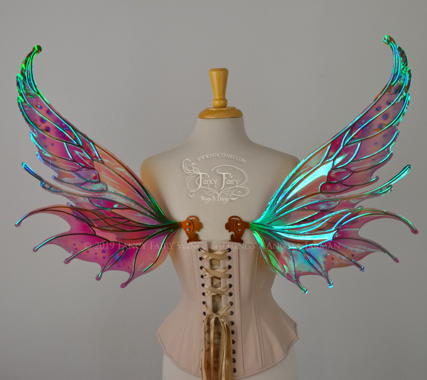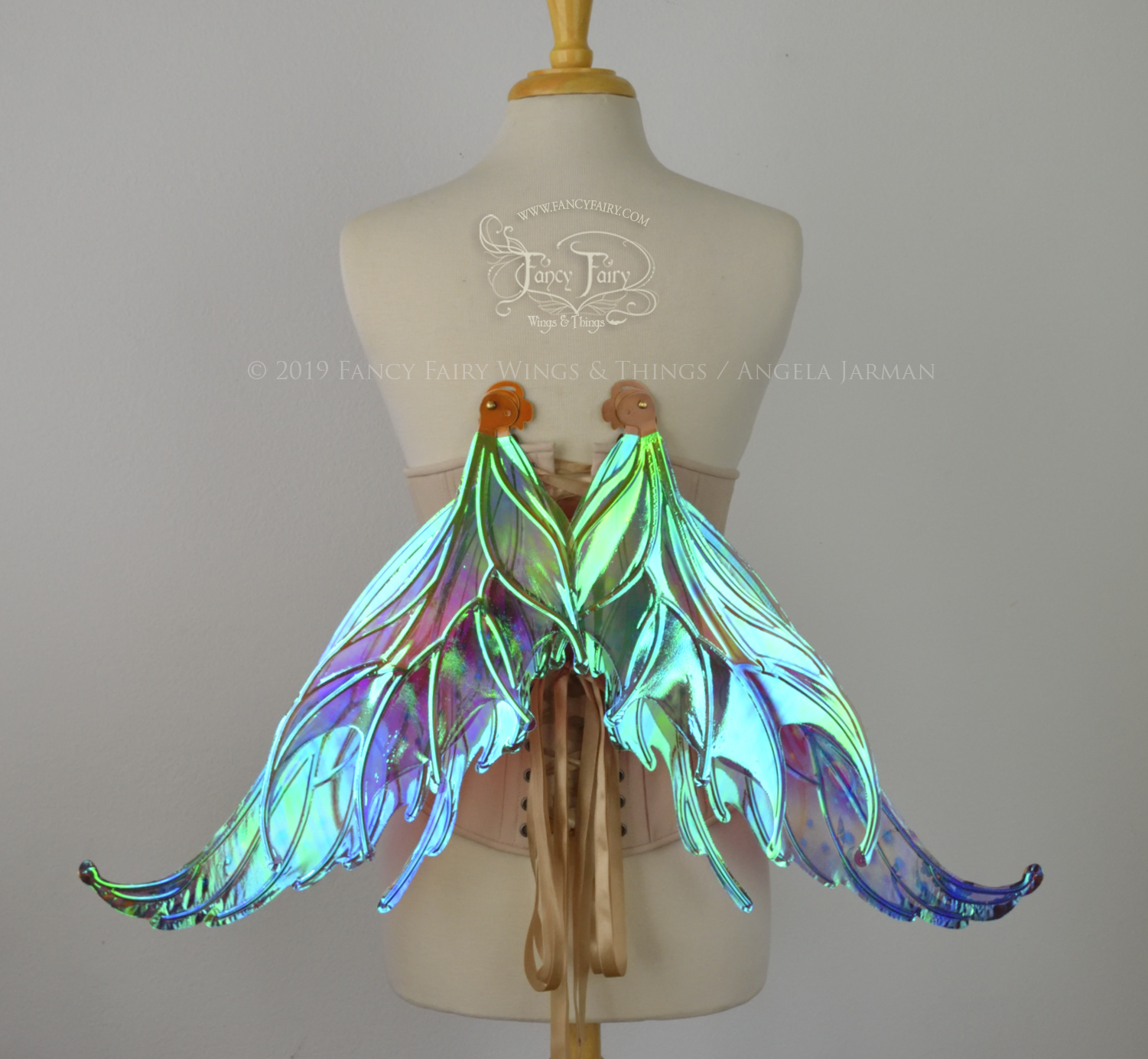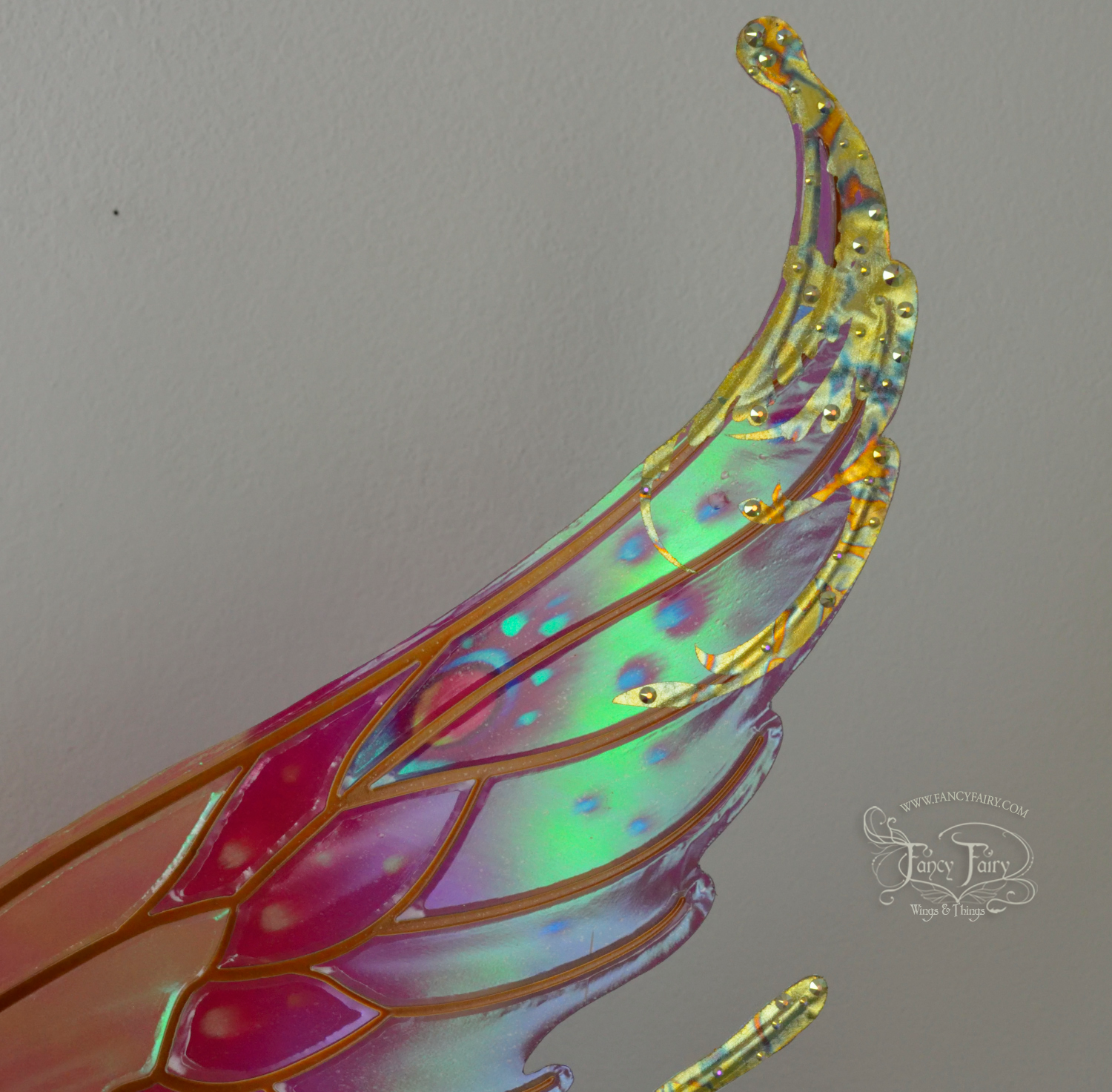All Fancy Fairy wings are cut from a .040" thick lightweight yet sturdy aluminum sheet frame that's been powder coated and encased in iridescent film and vinyl laminate. They can be worn with the included clear elastic straps although ribbon or stronger elastic is recommended, or tucked into any snug bodice, bra strap or corset for even more comfort. They can be gently bent and posed to give them an even more life-like appearance!
