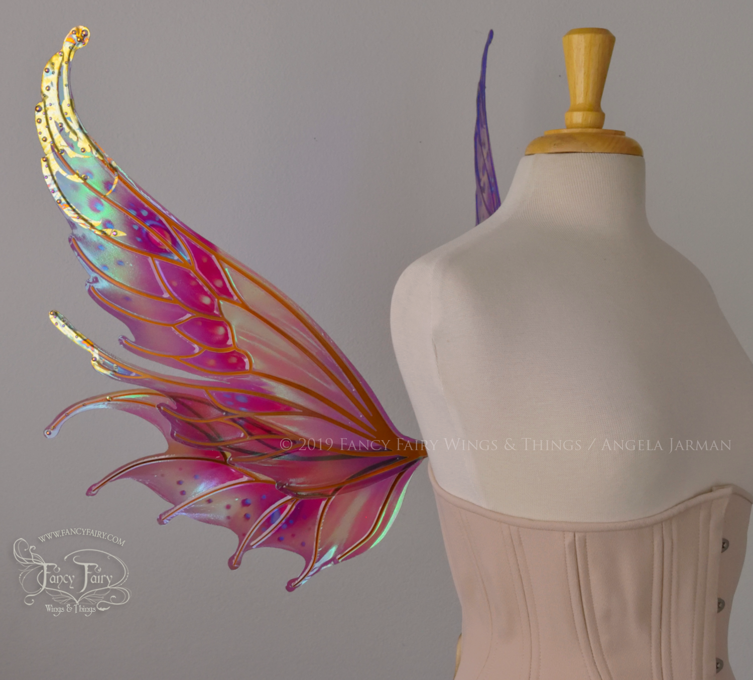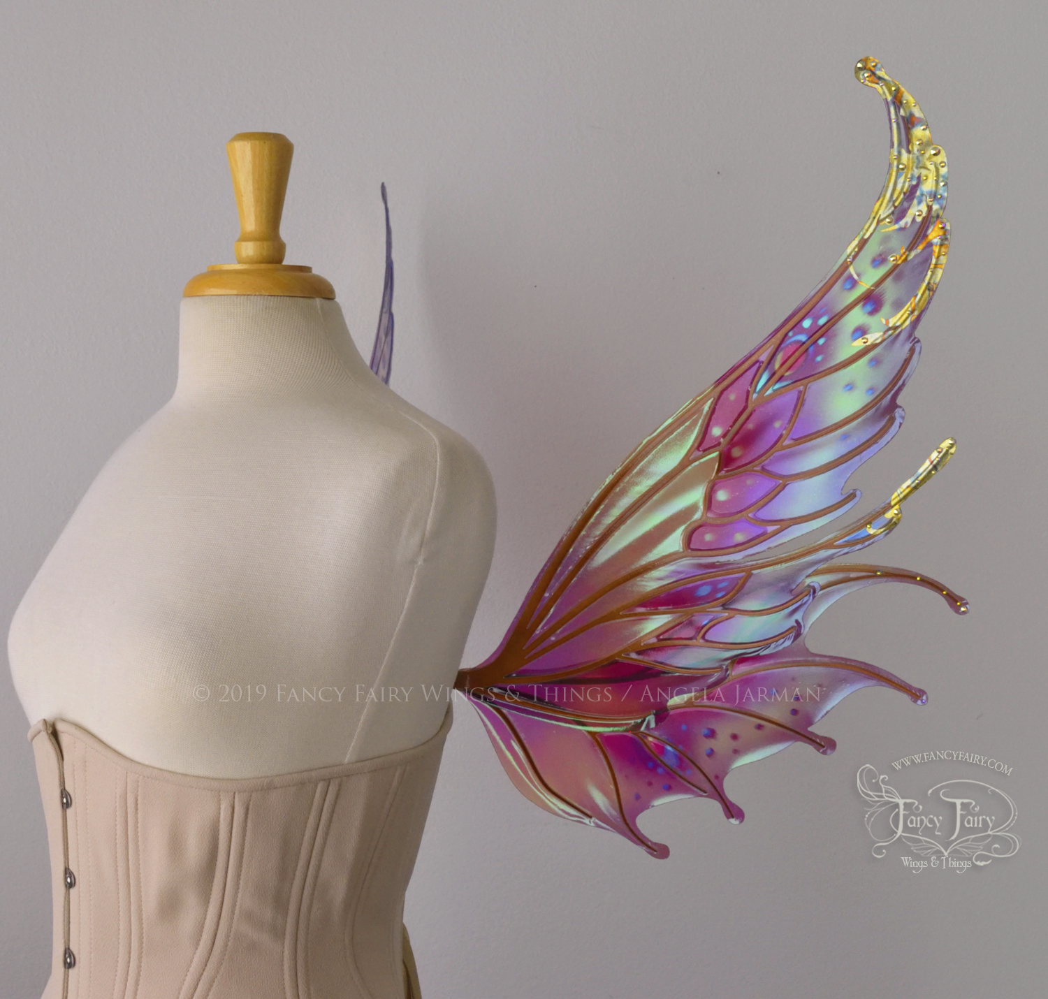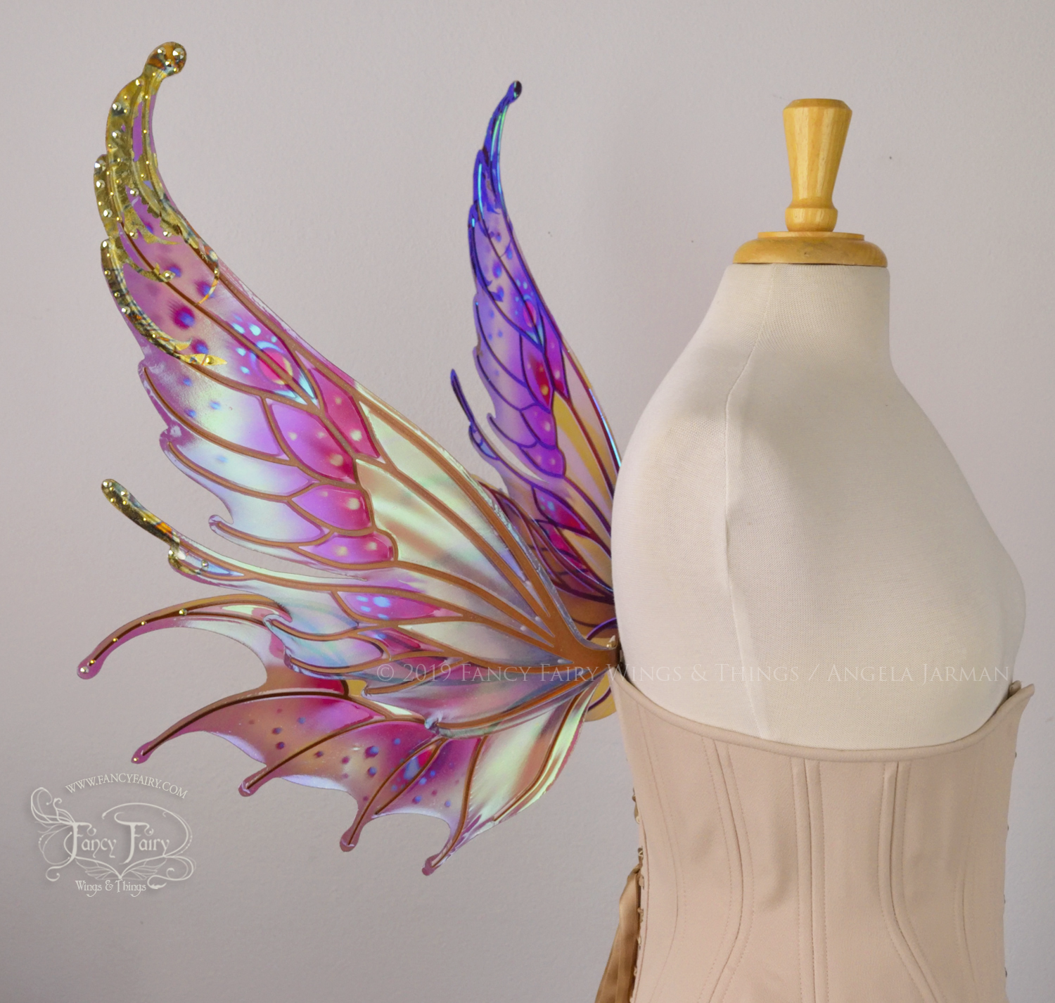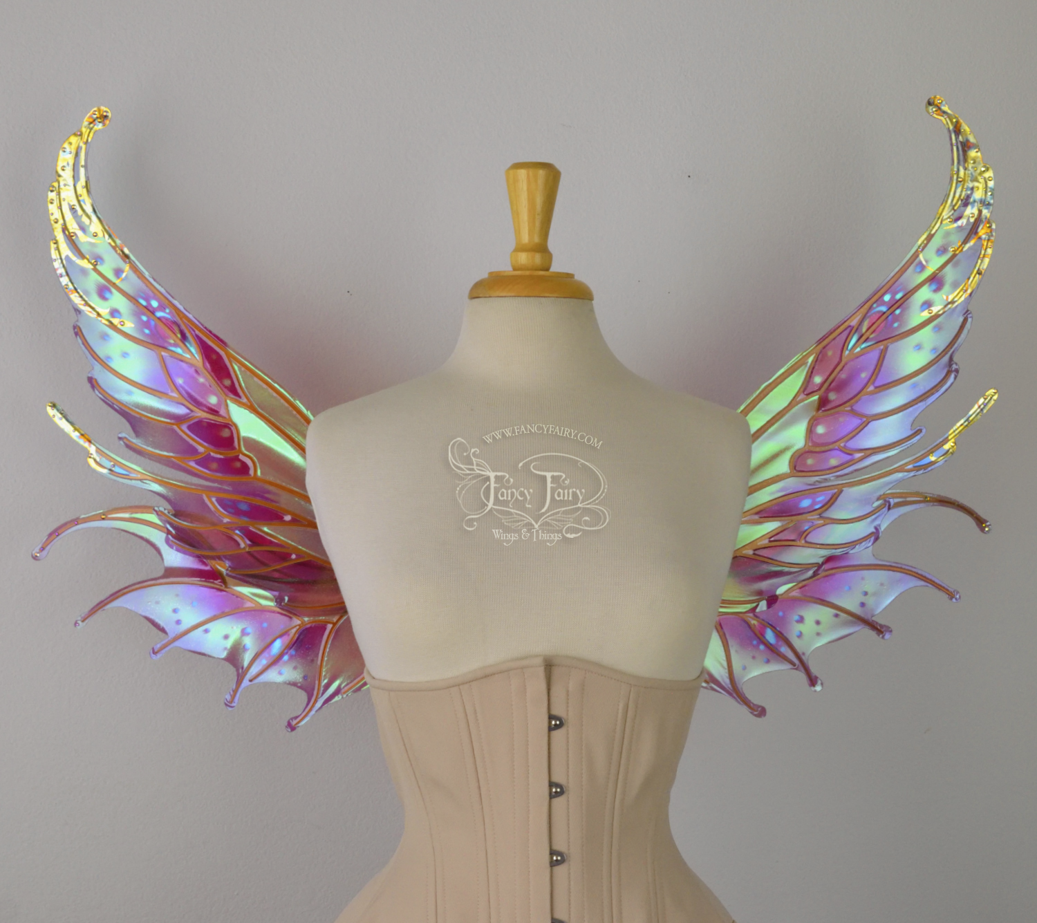 All Fancy Fairy wings are cut from a .040" thick lightweight yet sturdy aluminum sheet frame that's been powder coated and encased in iridescent film and vinyl laminate. They can be worn with the included clear elastic straps although ribbon or stronger elastic is recommended, or tucked into any snug bodice, bra strap or corset for even more comfort. They can be gently bent and posed to give them an even more life-like appearance!