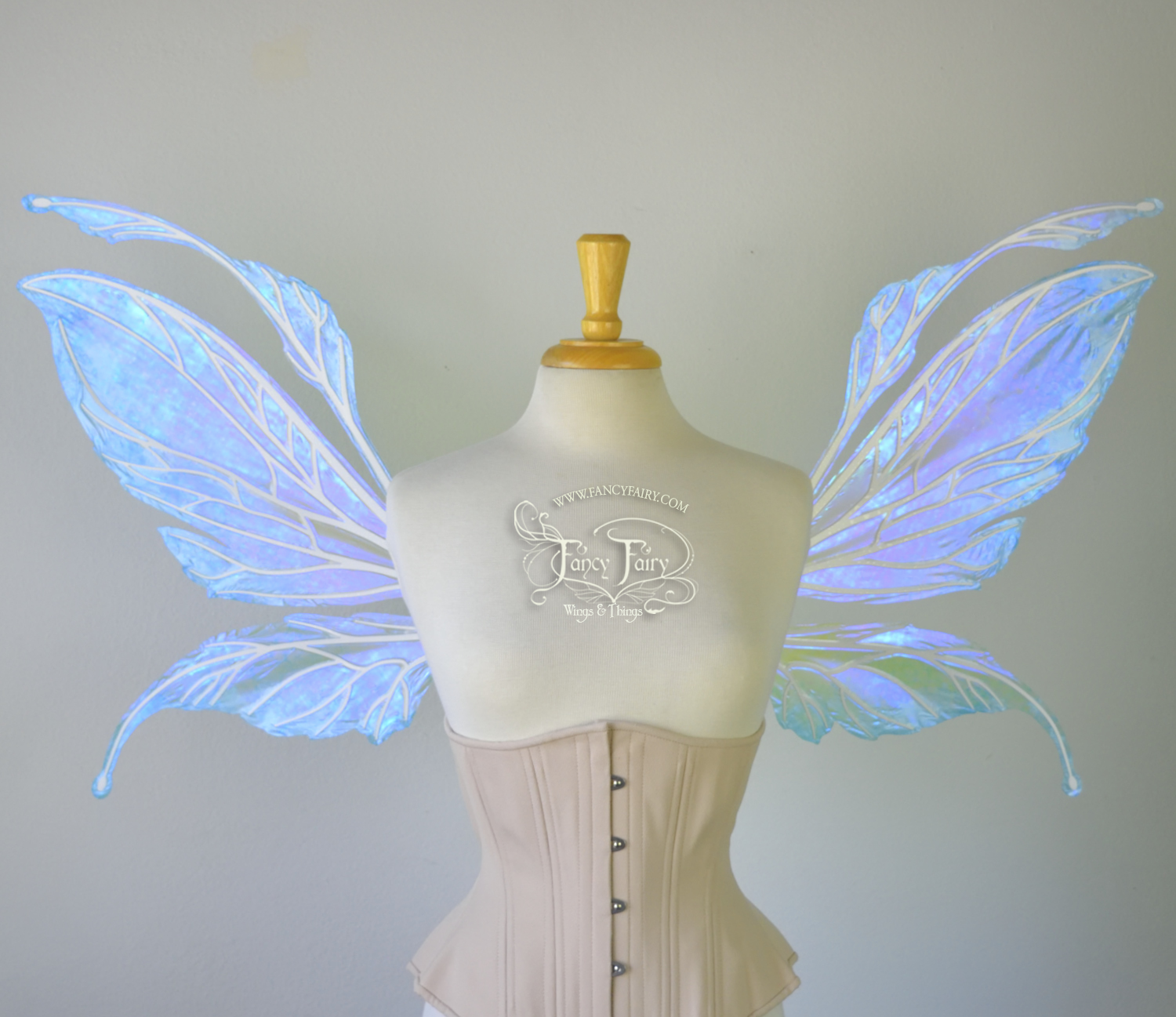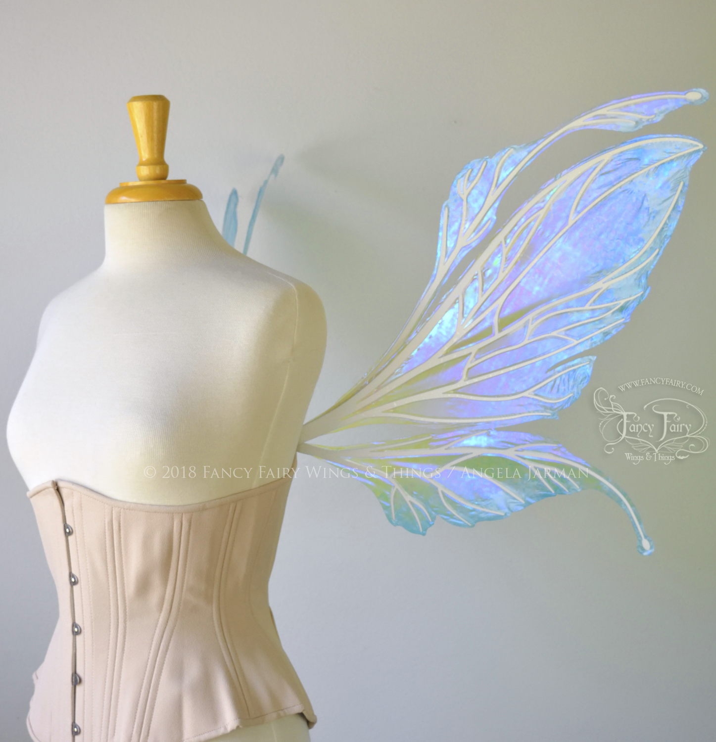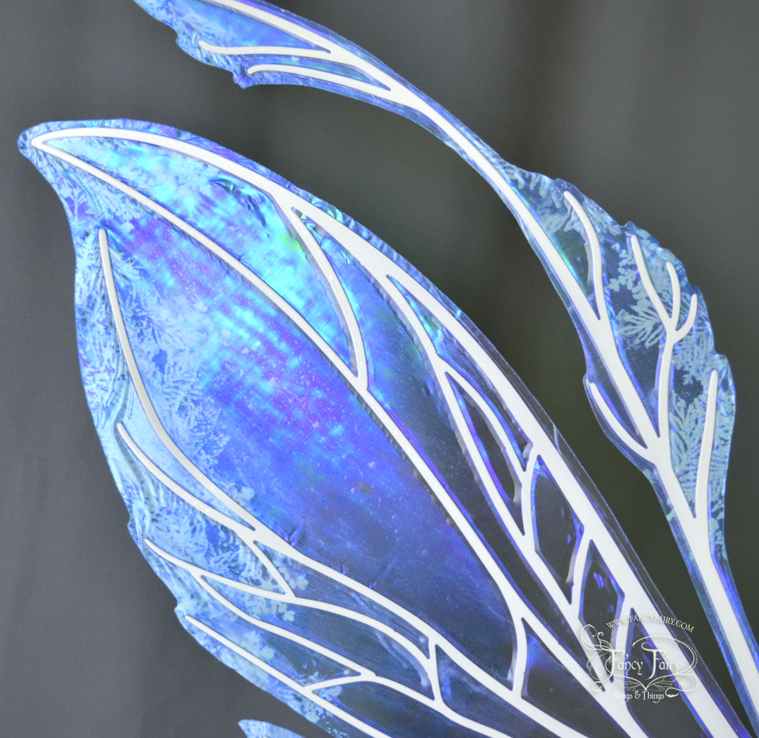 All Fancy Fairy wings are cut from a .040" thick lightweight yet sturdy aluminum sheet frame that's been powder coated and encased in iridescent film and vinyl laminate. They can be worn with the included clear elastic straps although ribbon or stronger elastic is recommended, or tucked into any snug bodice, bra strap or corset for even more comfort. They can be gently bent and posed to give them an even more life-like appearance!