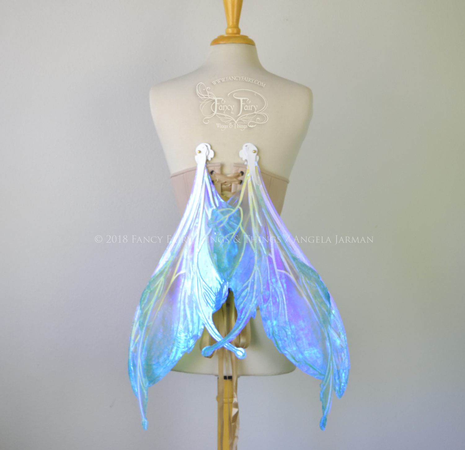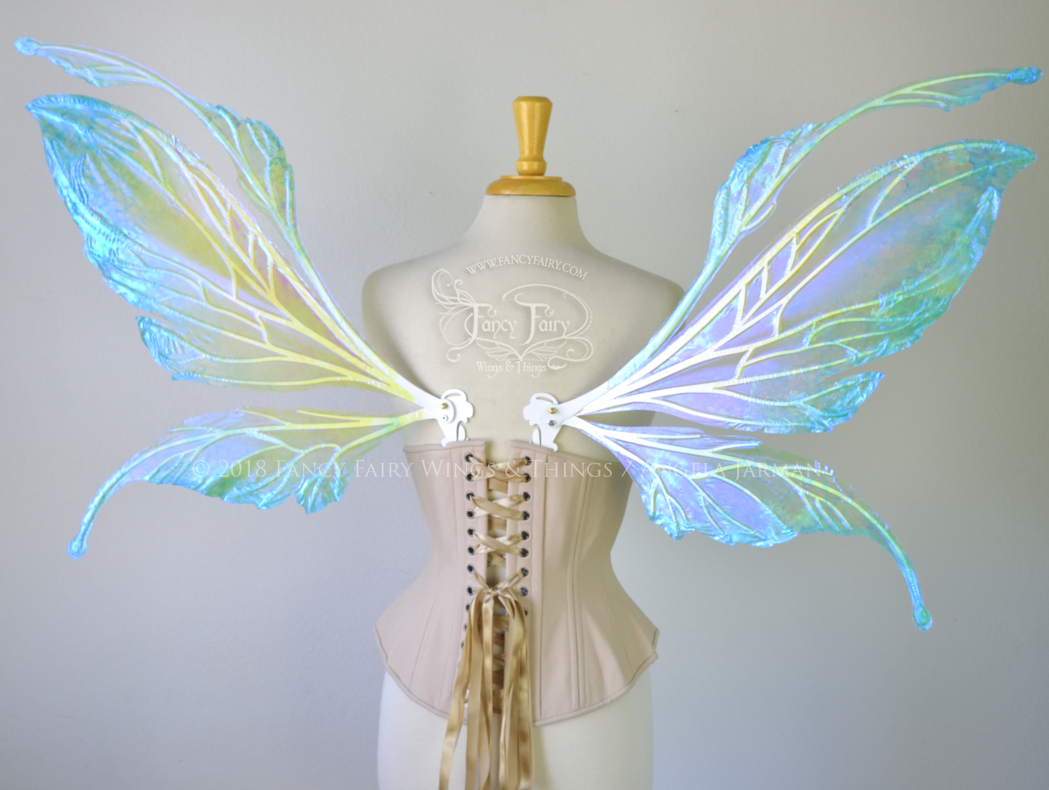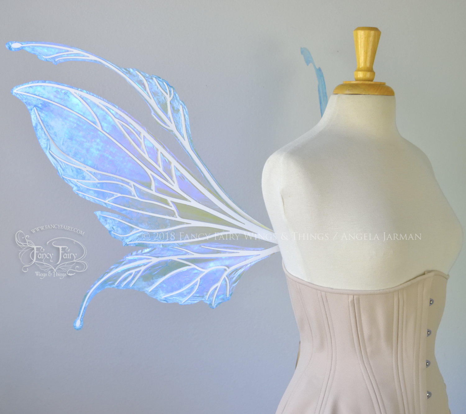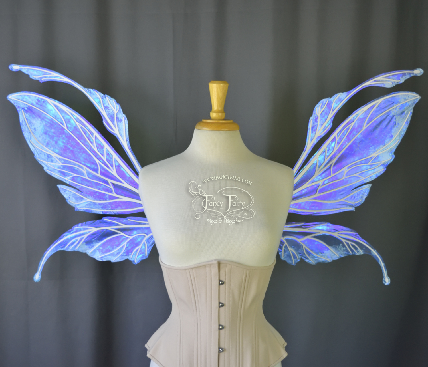 All Fancy Fairy wings are cut from a .040" thick lightweight yet sturdy aluminum sheet frame that's been powder coated and encased in iridescent film and vinyl laminate. They can be worn with the included clear elastic straps although ribbon or stronger elastic is recommended, or tucked into any snug bodice, bra strap or corset for even more comfort. They can be gently bent and posed to give them an even more life-like appearance!
