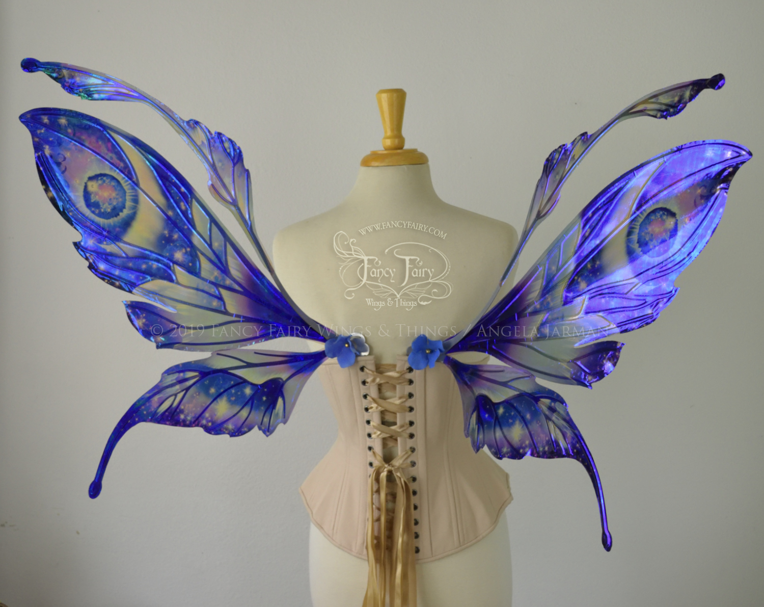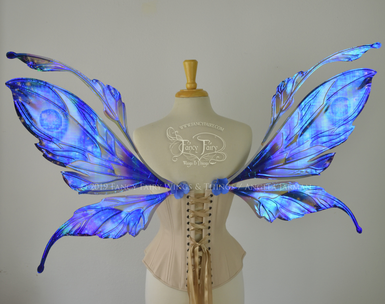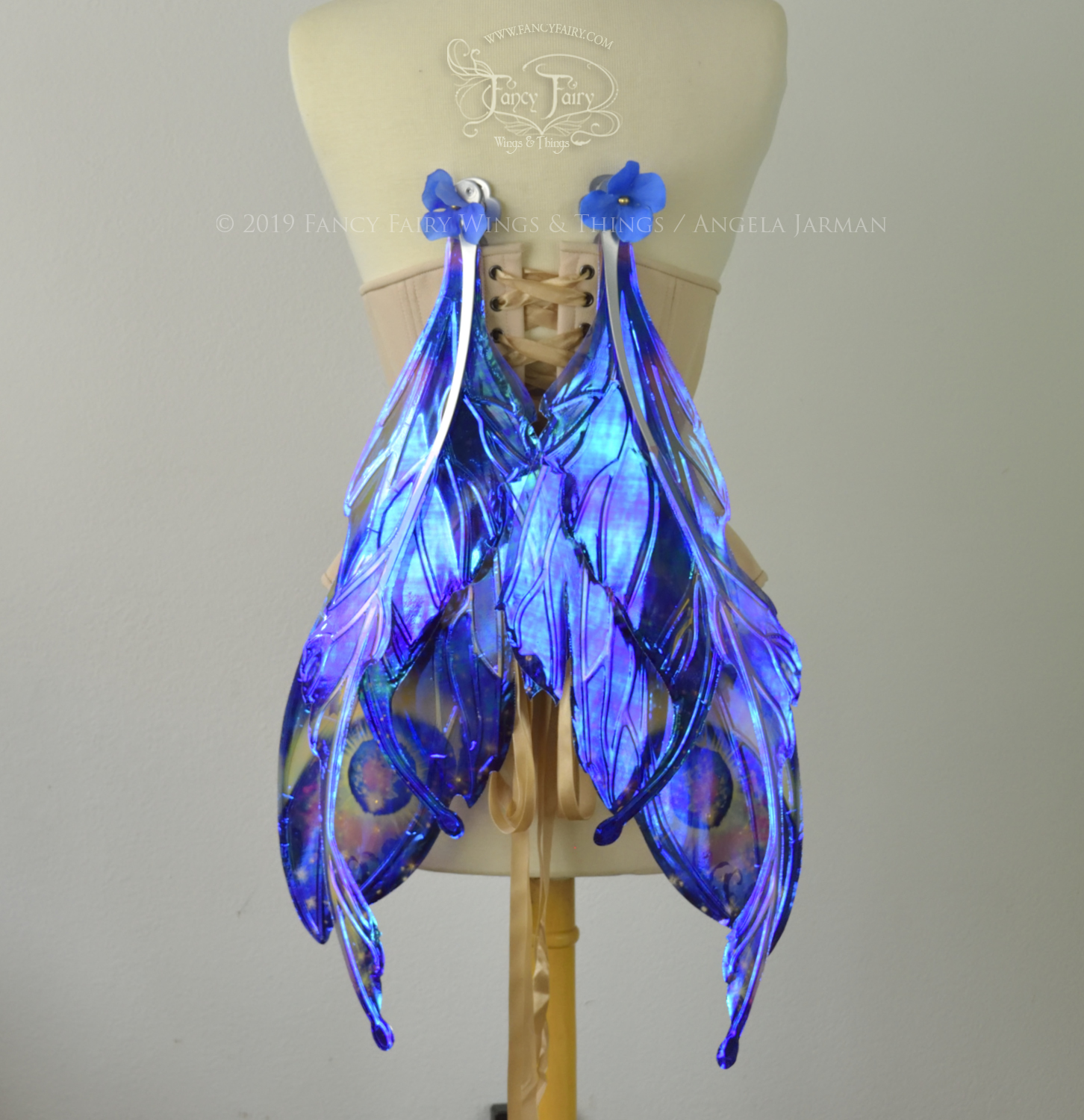 All Fancy Fairy wings are cut from a .040" thick lightweight yet sturdy aluminum sheet frame that's been powder coated and encased in iridescent film and vinyl laminate. They can be worn with the included clear elastic straps although ribbon or stronger elastic is recommended, or tucked into any snug bodice, bra strap or corset for even more comfort. They can be gently bent and posed to give them an even more life-like appearance!