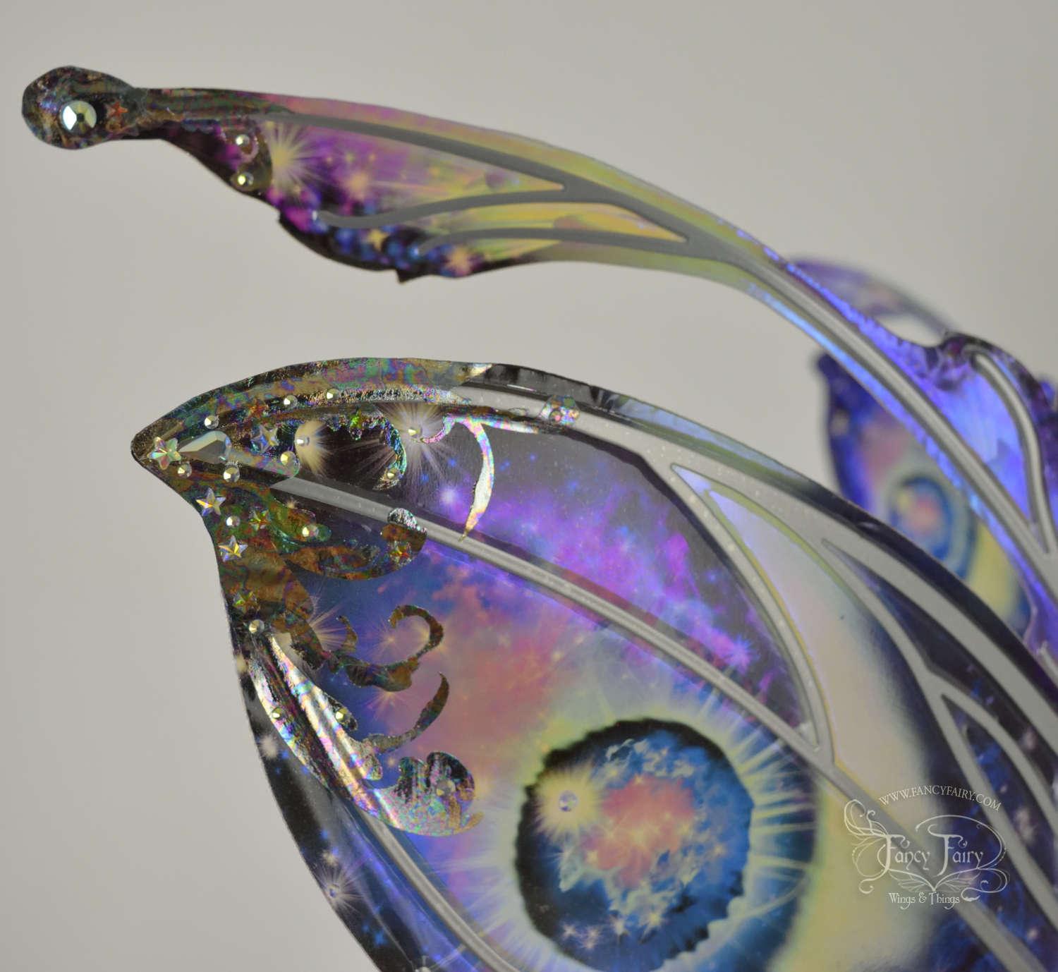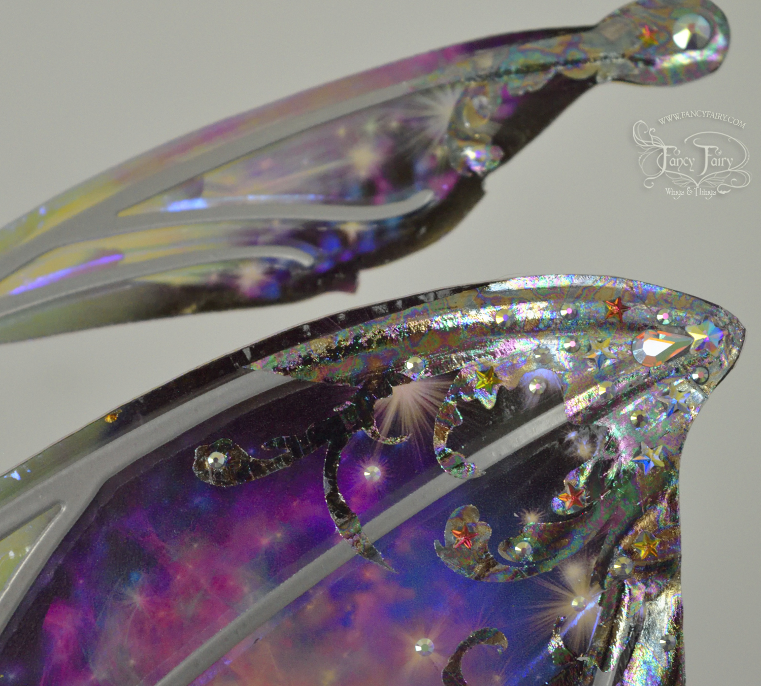 They are my original digitally hand painted celestial pattern on the Lilac iridescent film, silvery 'oil slick' colored metal leaf flourish designs embellishing the tips and edges and further decorated with Swarovski iridescent crystals - a mix of round ones, star shaped and pear shaped at the tip. The veins are in chrome silver.