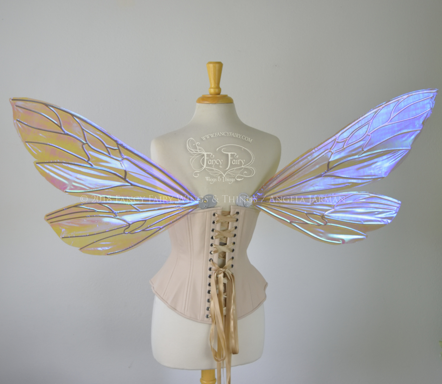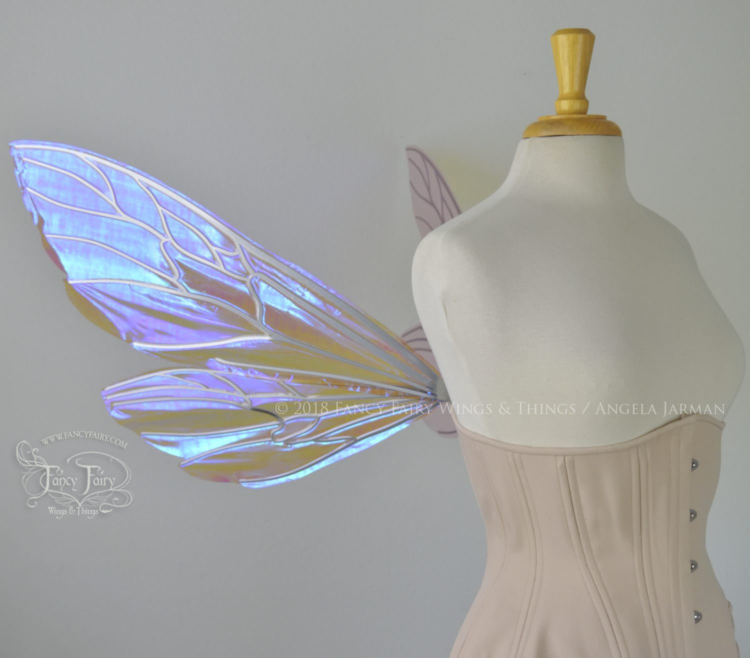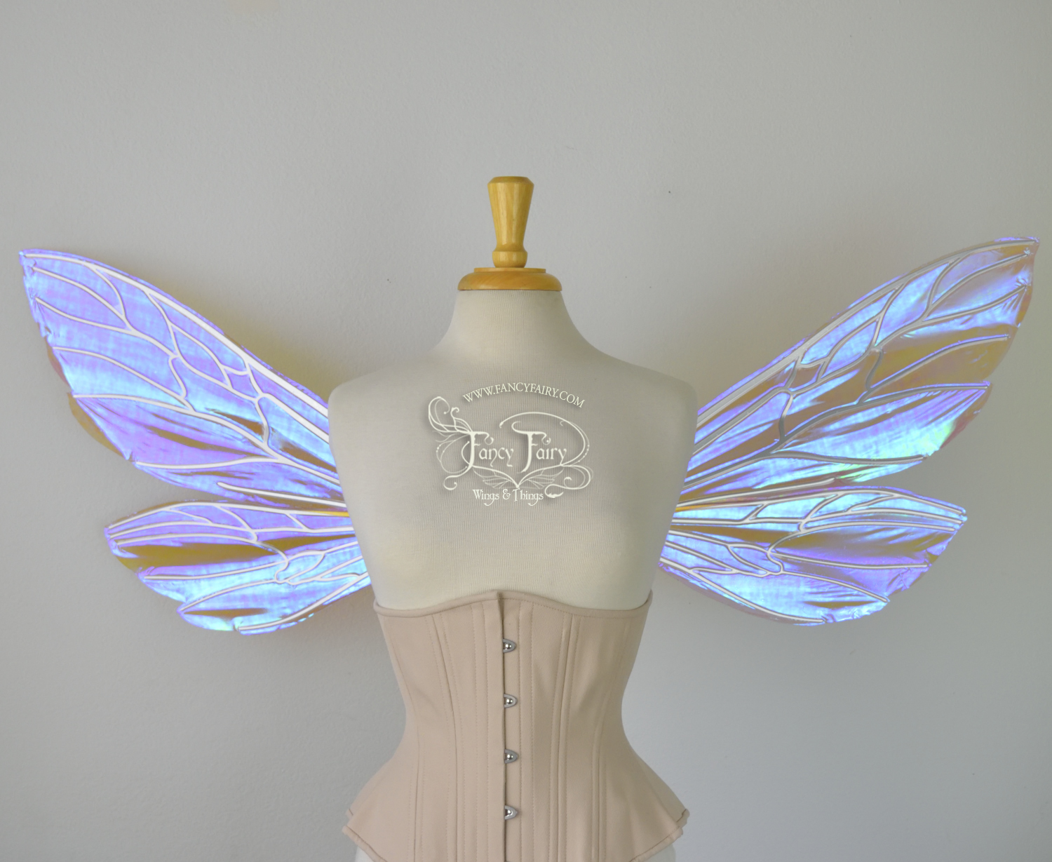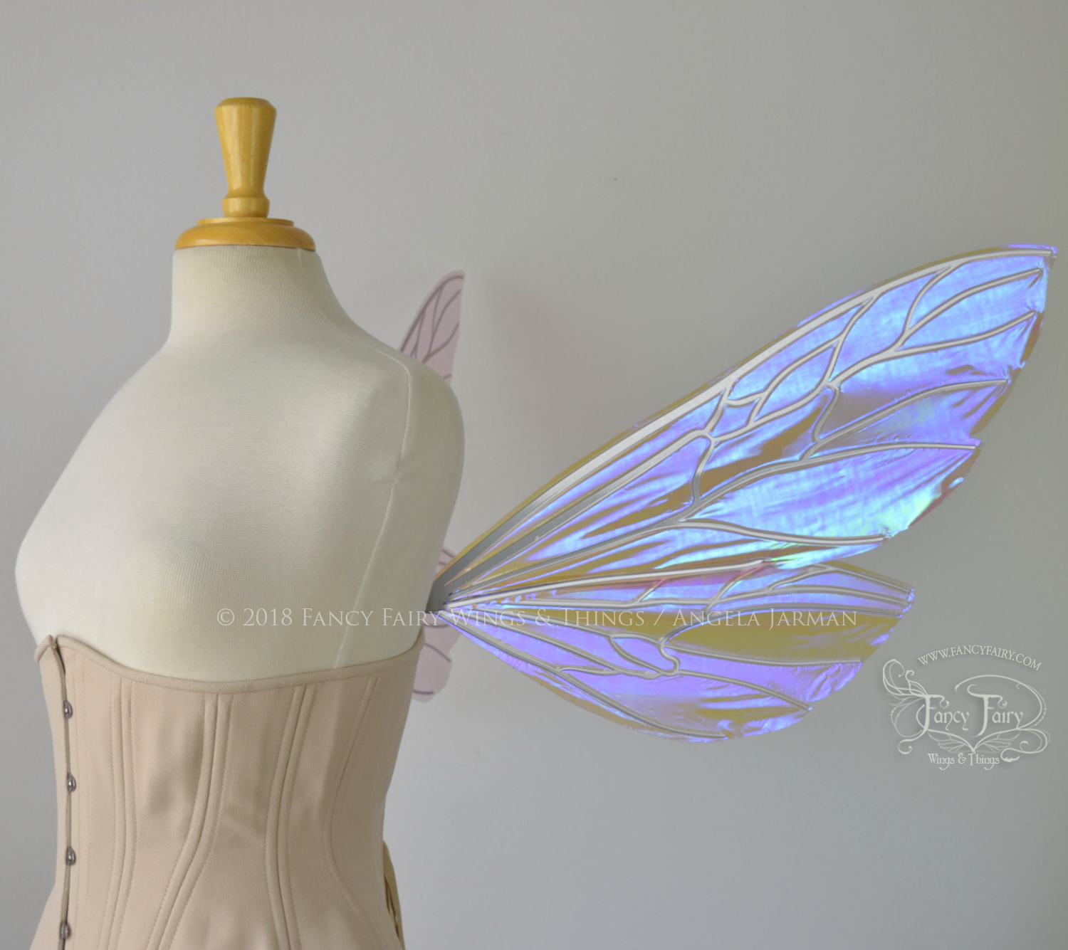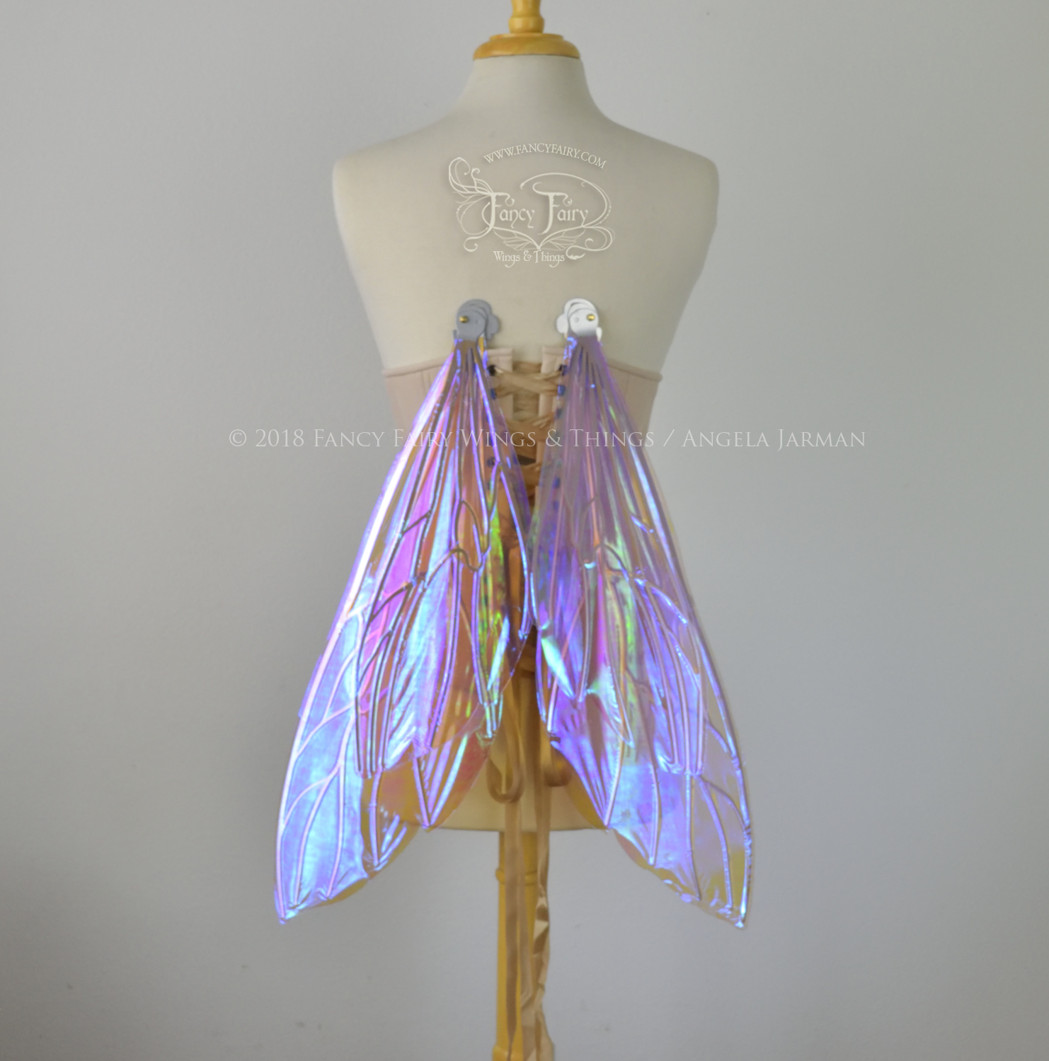 A new late style from the 2016 Summer Platinum Edition, the Ellette fairy wings have now been upgraded to convertible wings like the others in the 2018 Ethereal Collection. These have been done in the Lilac iridescent film with silver chrome veining, measuring 41 inches wide.