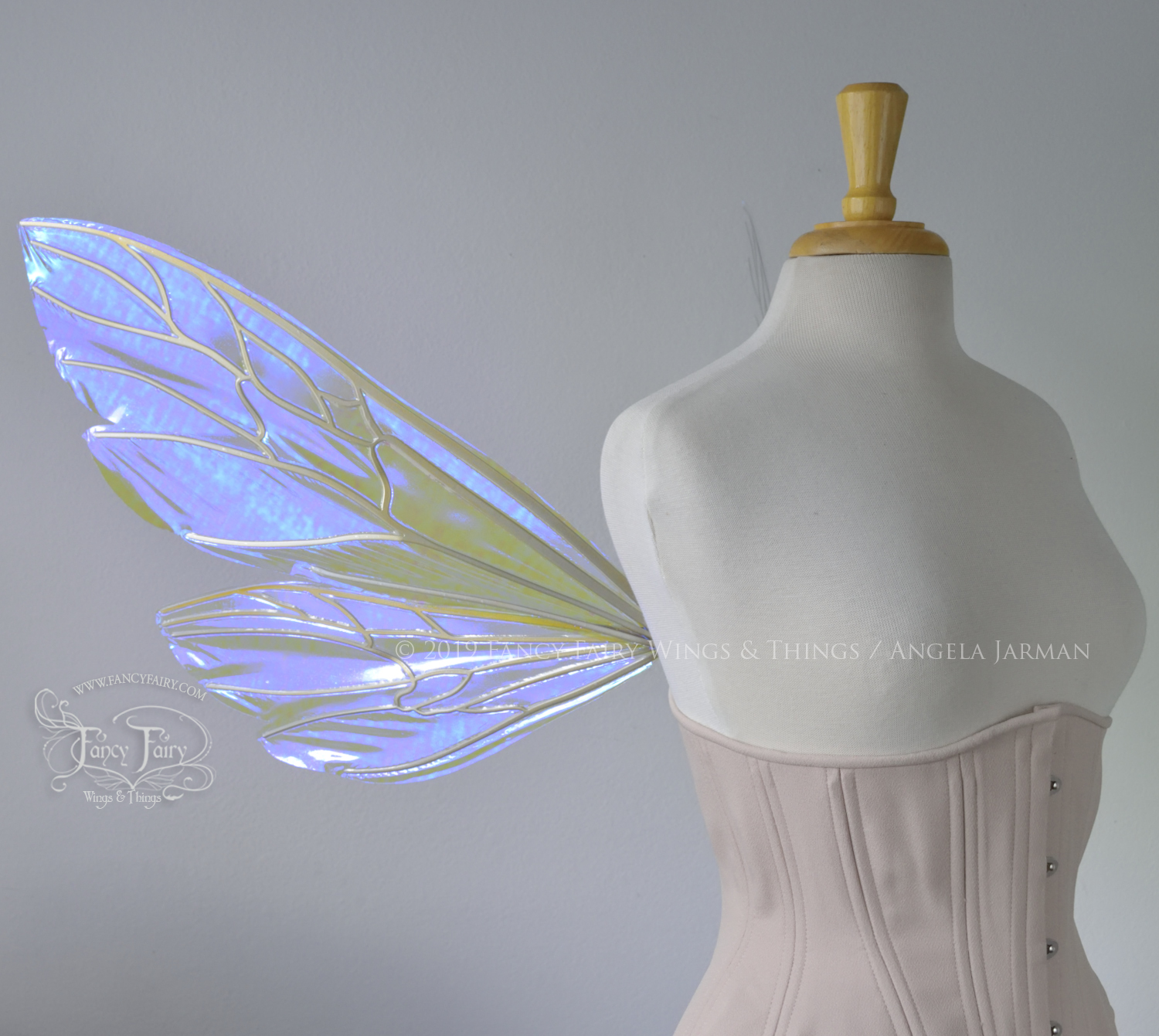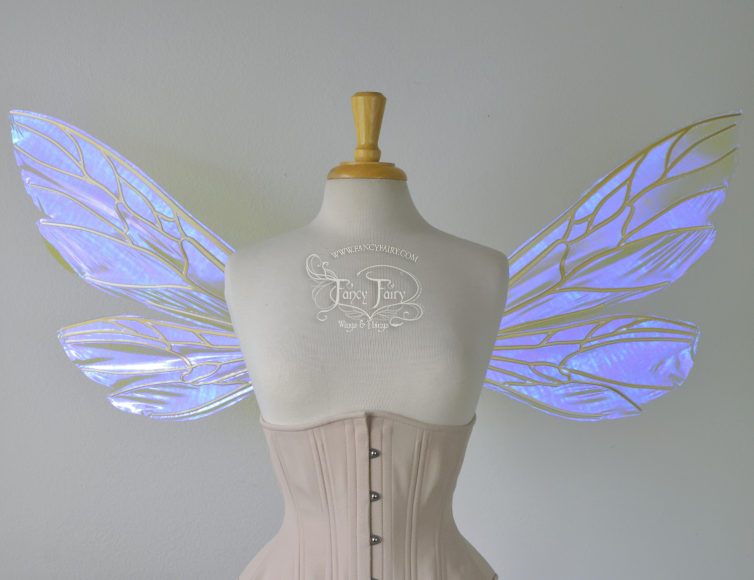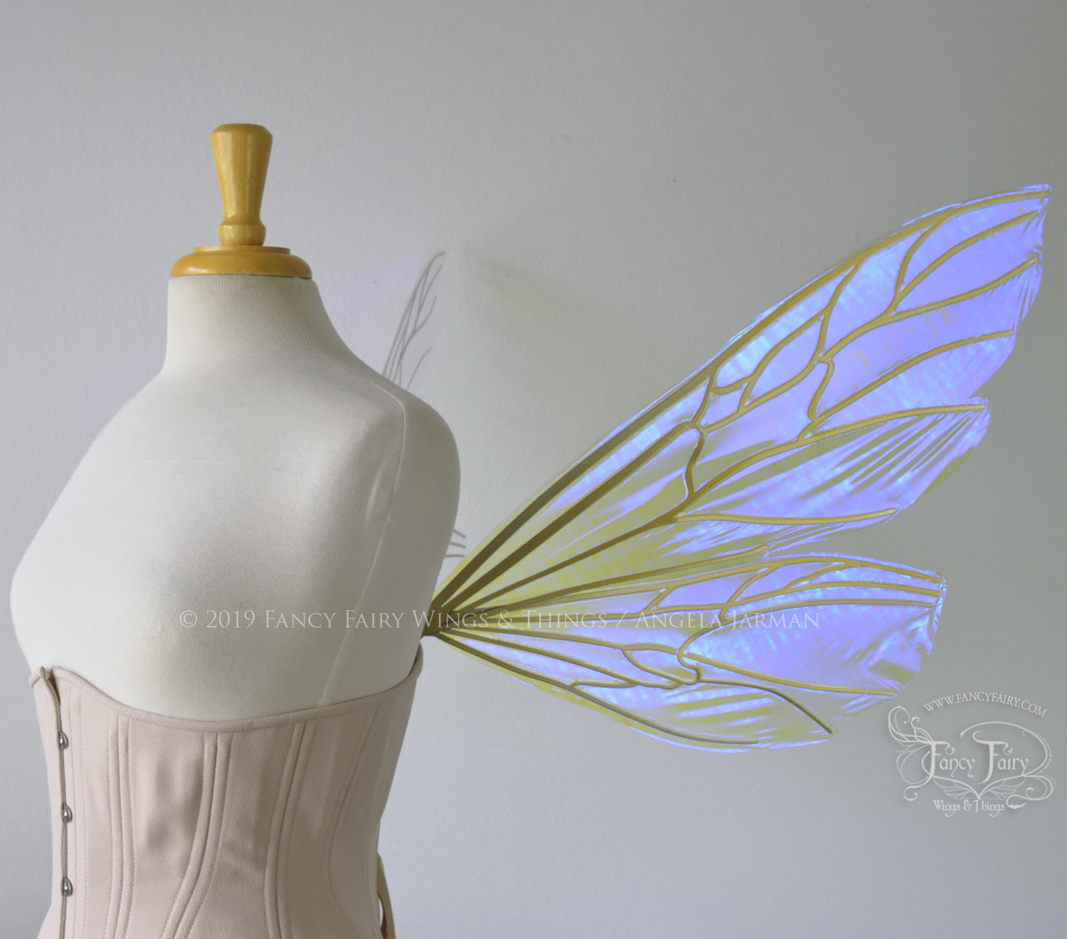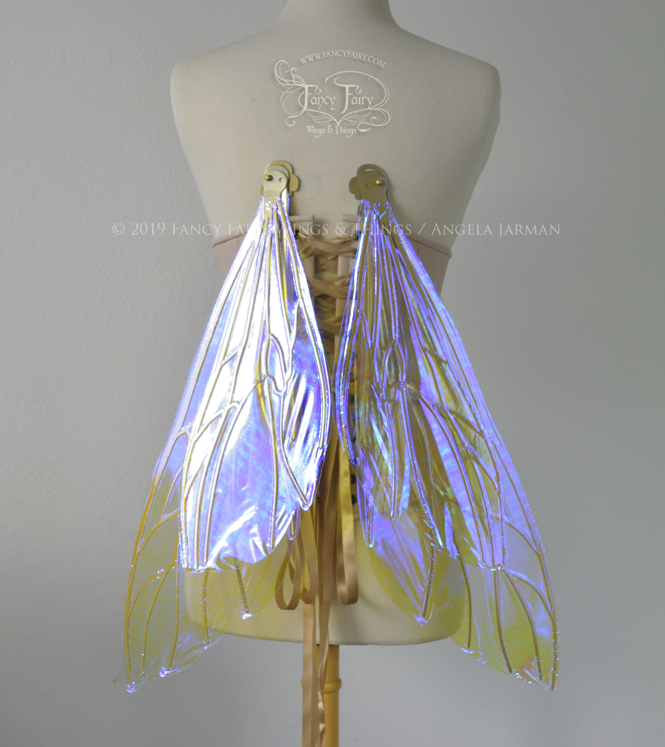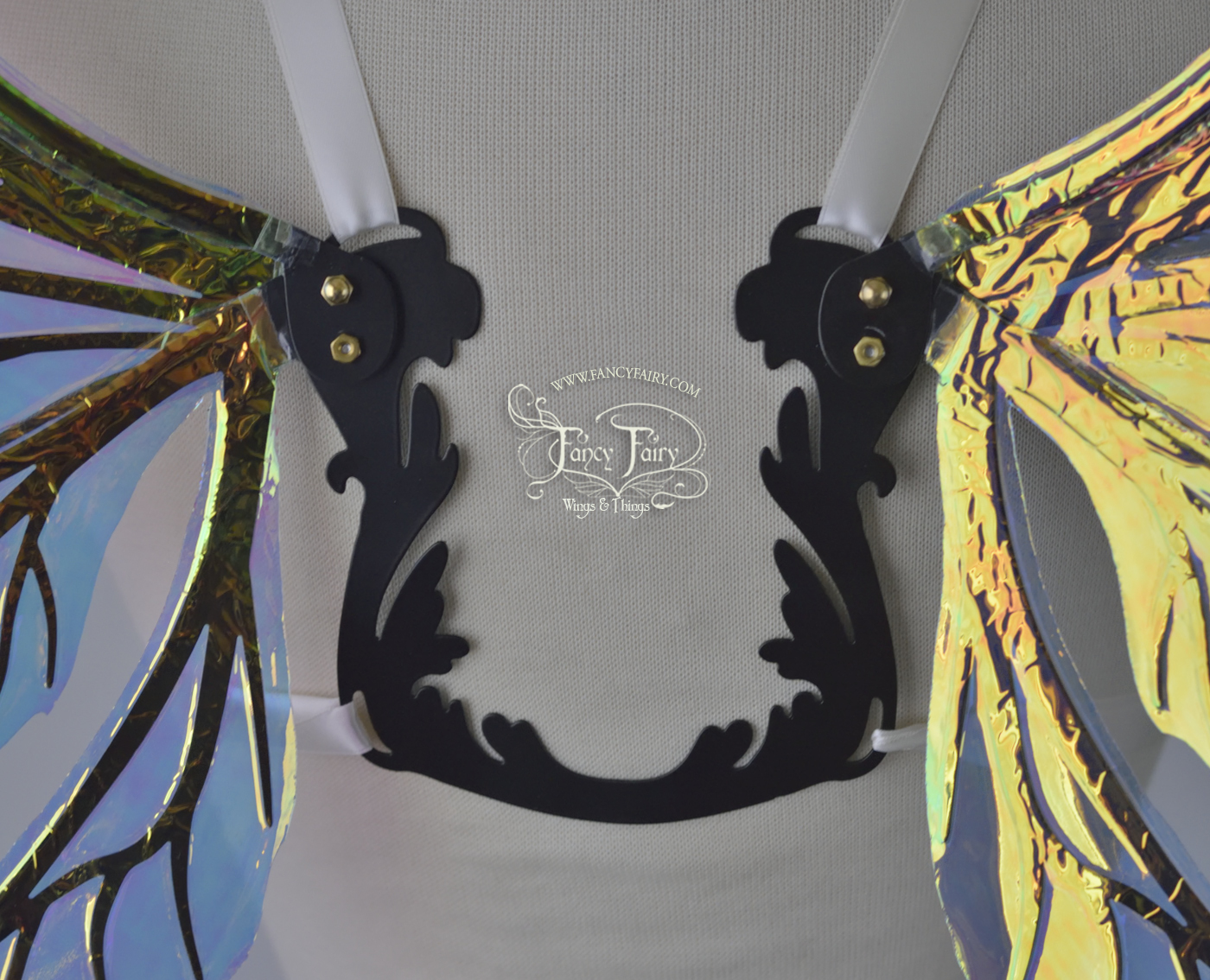 A new late style from the 2016 Summer Platinum Edition, the Ellette fairy wings have now been upgraded to convertible wings like the others in the 2018 Ethereal Collection. These have been done in the Ultraviolet iridescent film with Candy Gold veining, which is a paler gold over silver chrome with less yellow than the other standard gold. They measure 41 inches across.