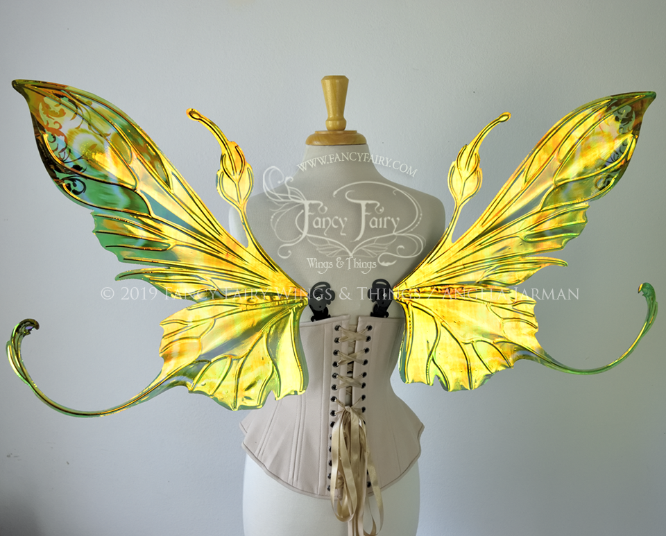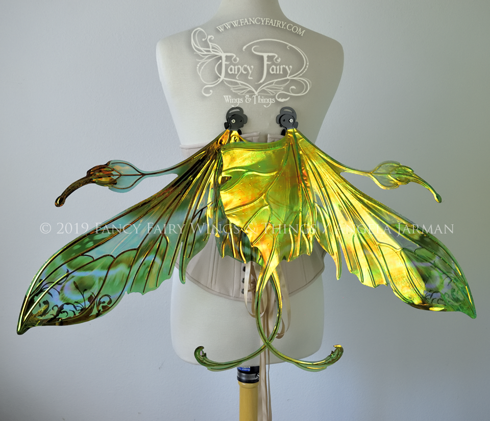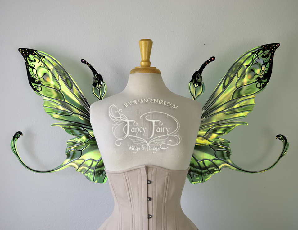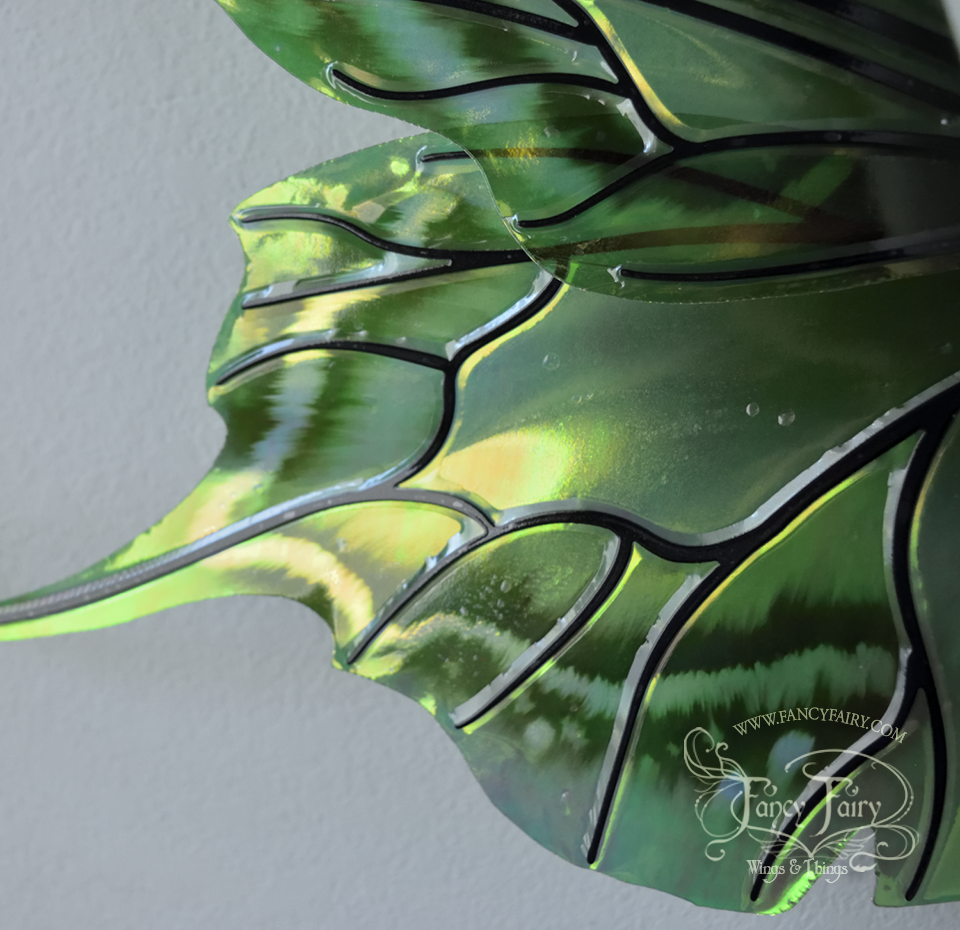All Fancy Fairy wings are cut from a .040" thick lightweight yet sturdy aluminum sheet frame that's been powder coated and encased in iridescent film and vinyl laminate. They can be worn with the included clear elastic straps although ribbon or stronger elastic is recommended, or tucked into any snug bodice, bra strap or corset for even more comfort. They can be gently bent and posed to give them an even more life-like appearance!