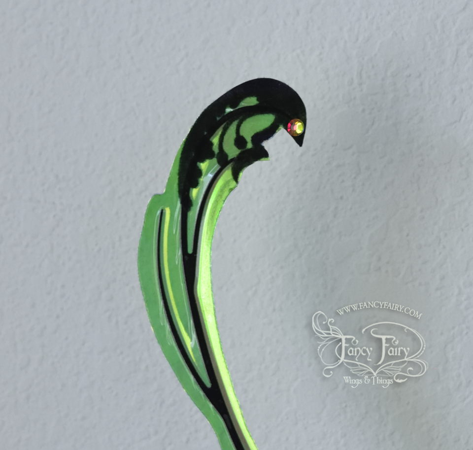 The Elvina design gets the extra fancy treatment with a digitally hand painted butterfly-esque pattern in greens on the iridescent Diamond Fire film, embellished further with a velvet black flocking design at the tips, and an assortment of aurora borealis crystals! Veins are black.