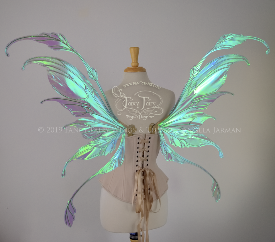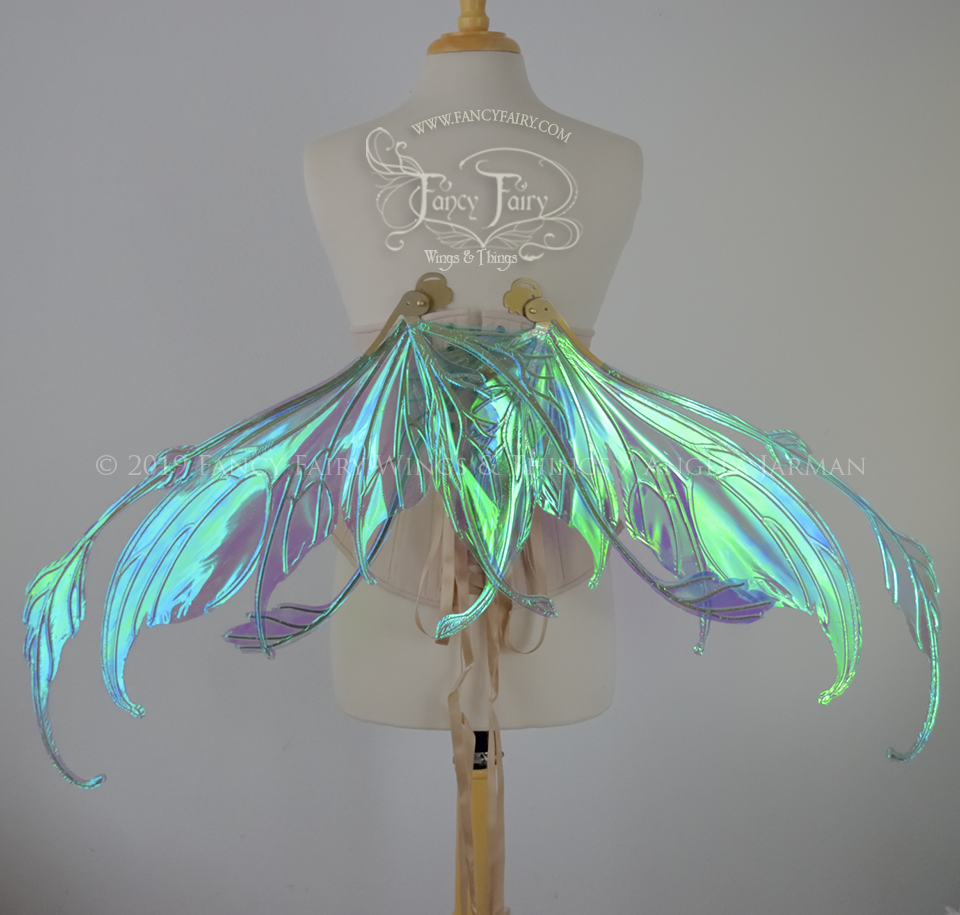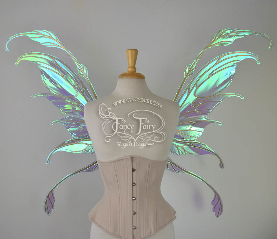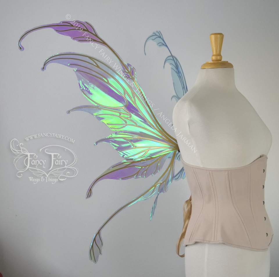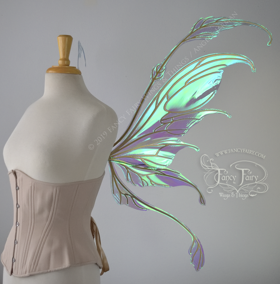 The Fauna design is from the new Ethereal Collection of convertible fairy wings that can be positioned in either an 'up' or a resting 'down' position without compromising the metal with harsh bending. These have been laminated in the Aquamarine iridescent film that has blue/purple undertones with a brilliant blue/green shine, and the metal veins are done in a Candy Coat Gold.