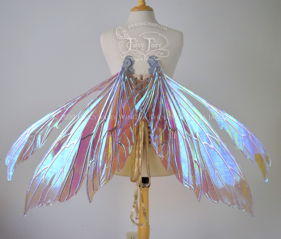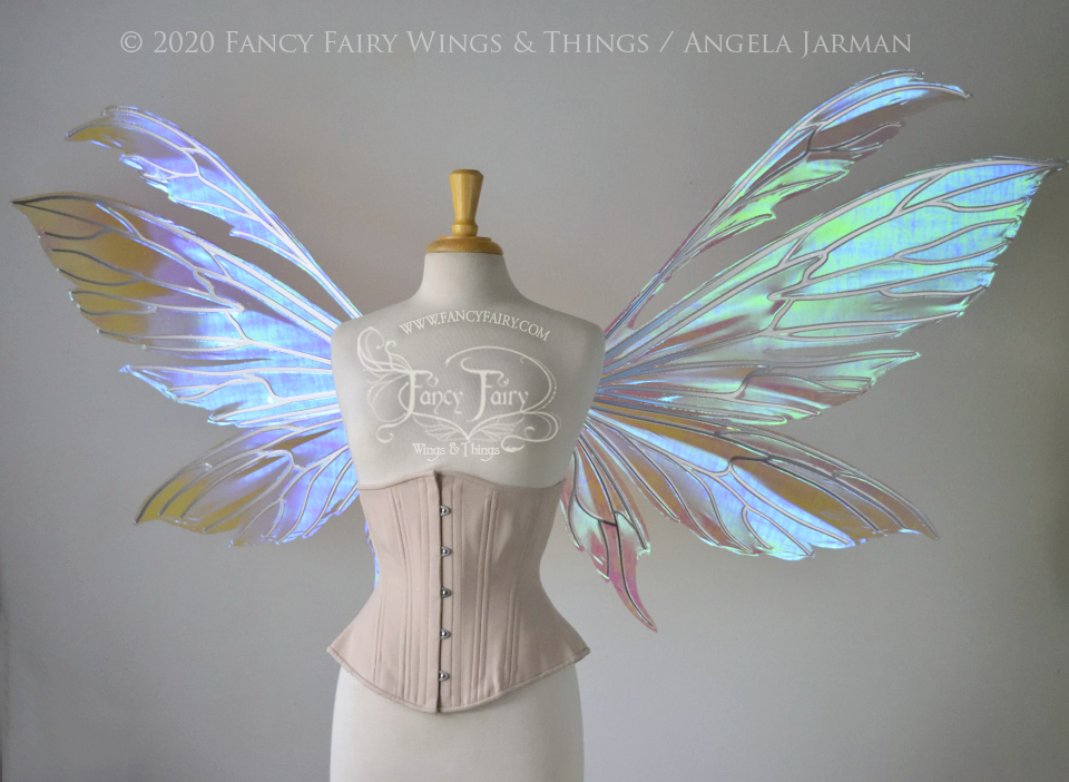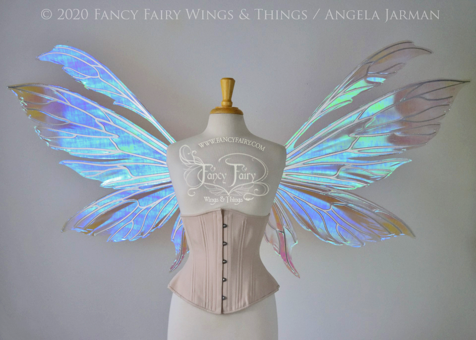 These wings are cut from a .050" thick lightweight yet sturdy aluminum sheet frame that's been powder coated and encased in iridescent film and vinyl laminate. They can be worn by looping ribbon through the slits in the brace (ribbon not included, I'll let you pick out whatever matches your costume) or tucked into any snug sturdy bodice or corset for even more comfort. They can be gently bent and posed to give them an even more life-like appearance!