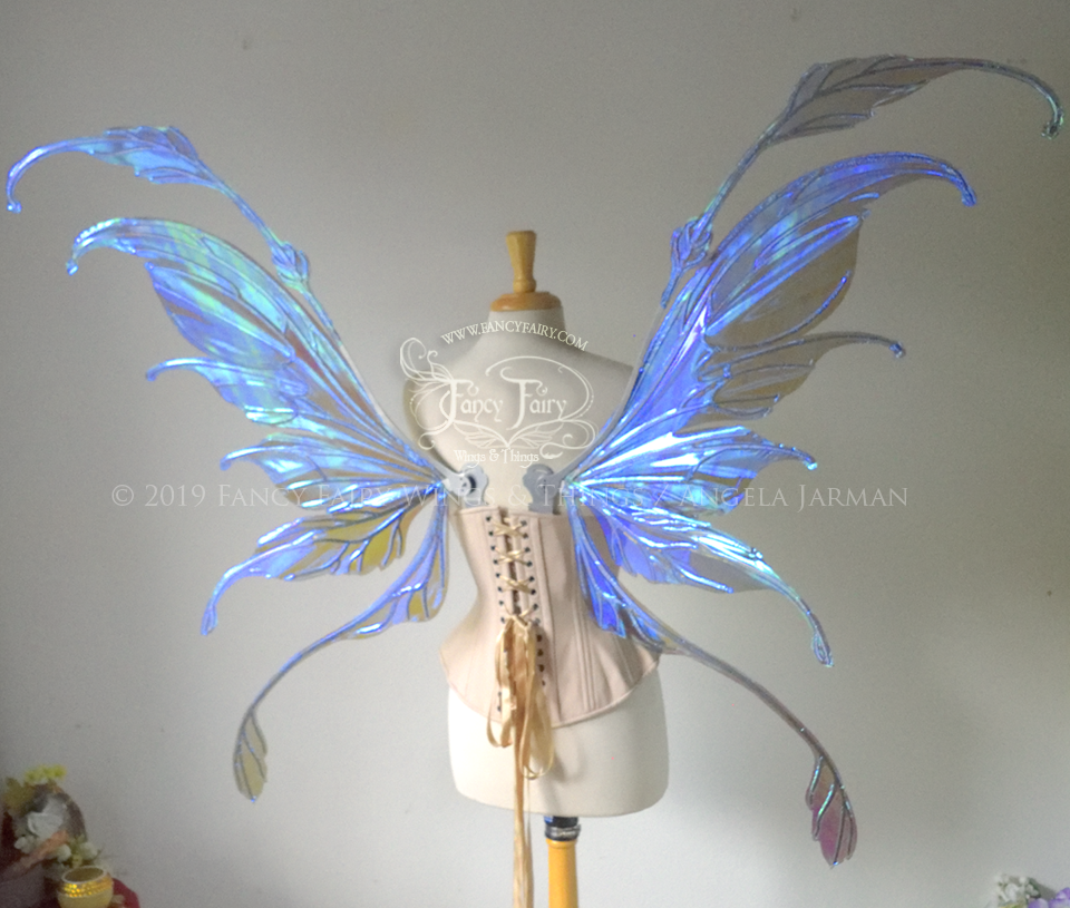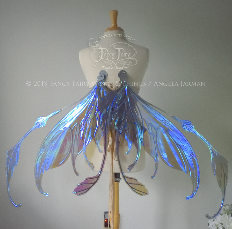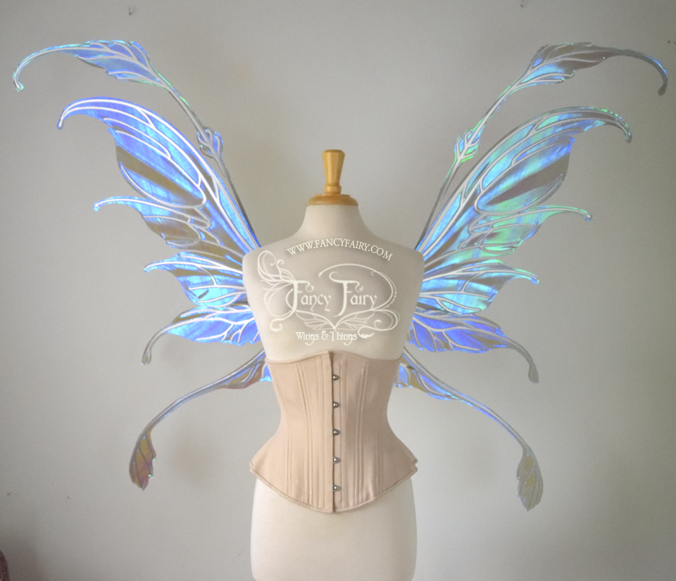 These wings are cut from a .050" thick lightweight yet sturdy aluminum sheet frame that's been powder coated and encased in iridescent film and vinyl laminate. They can be worn by looping ribbon through the slits in the brace (ribbon not included, I'll let you pick out whatever matches your costume) or tucked into any snug sturdy bodice or corset for even more comfort. They can be gently bent and posed to give them an even more life-like appearance!