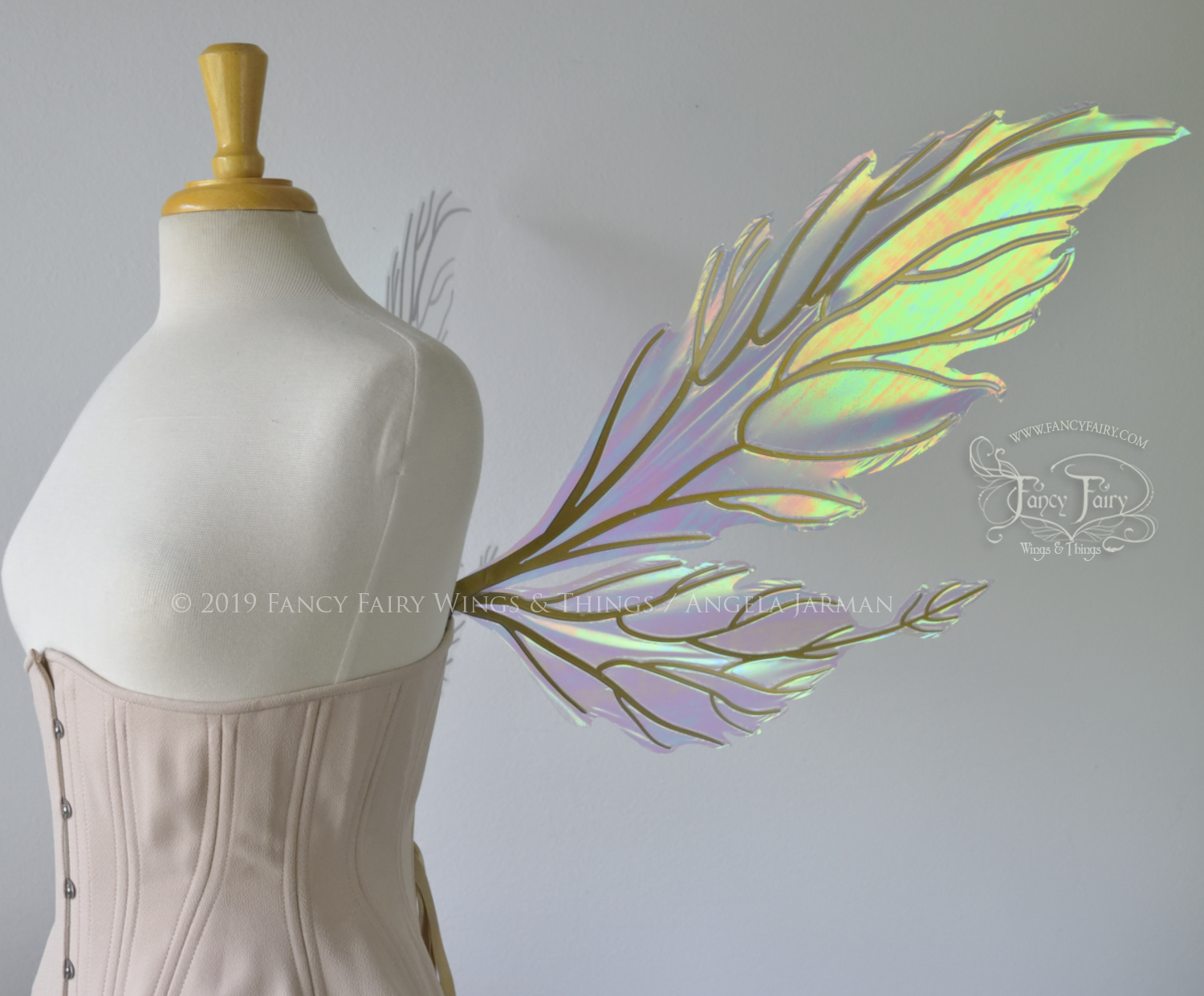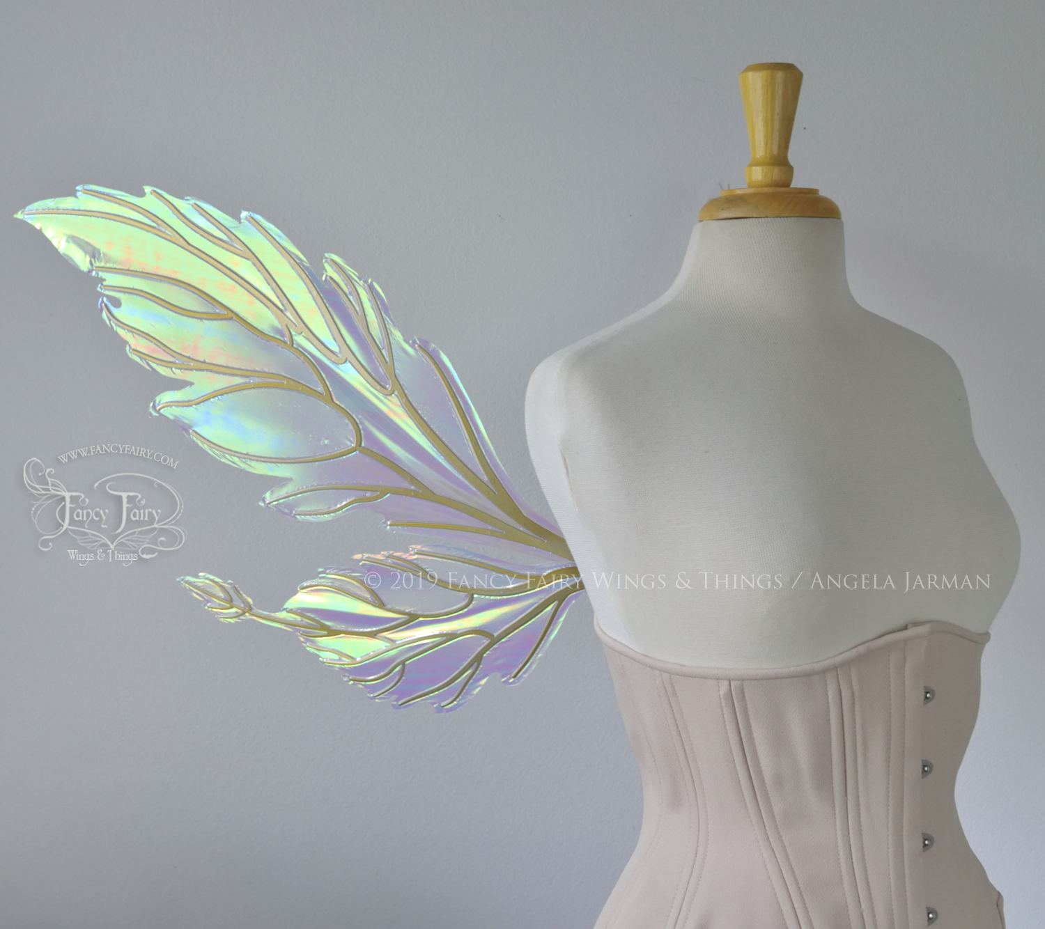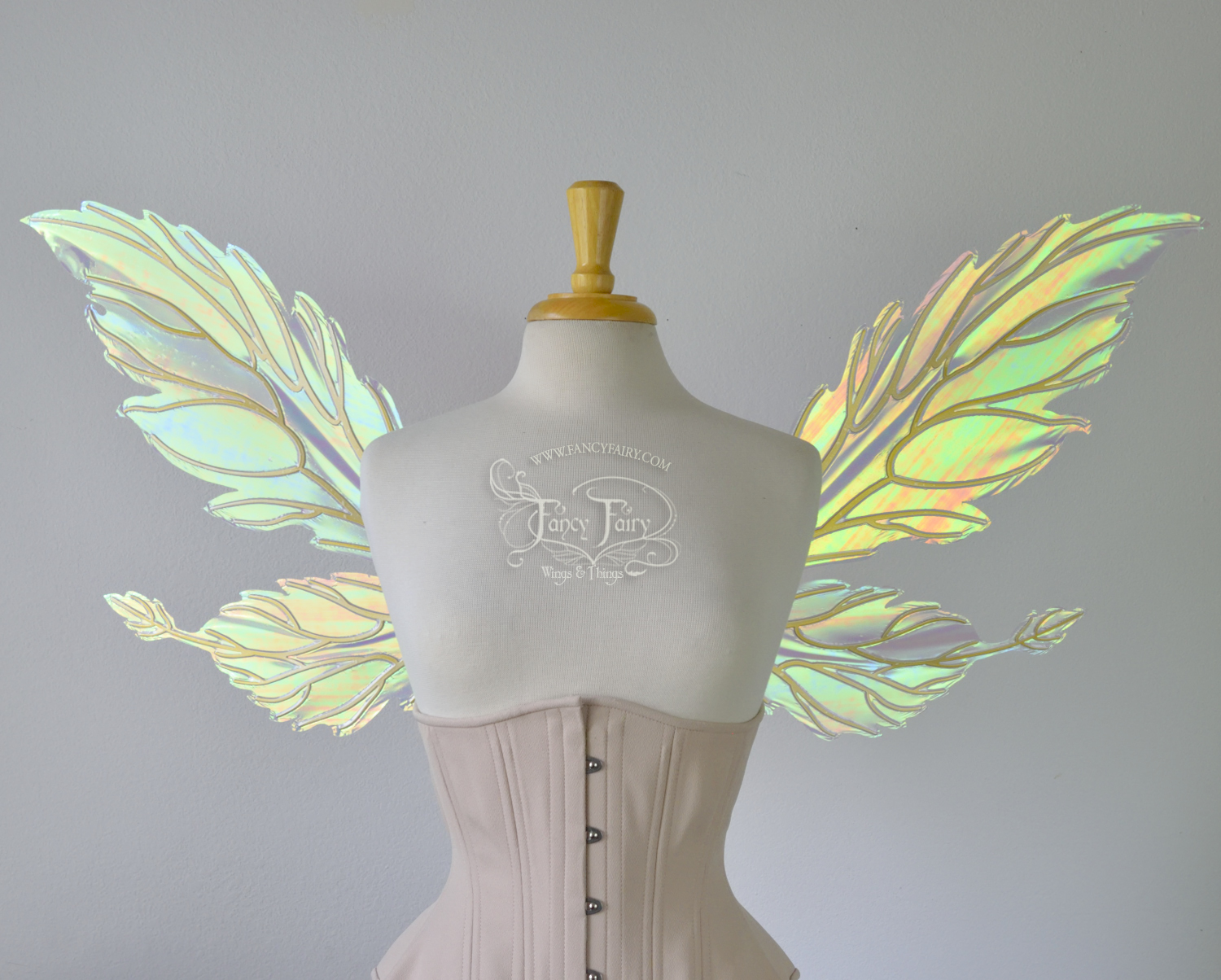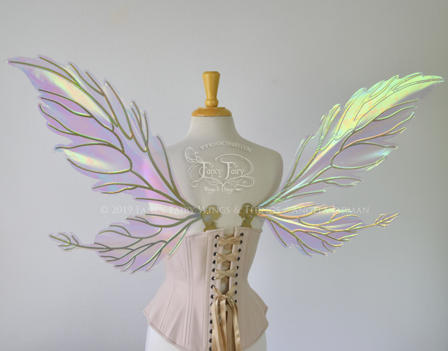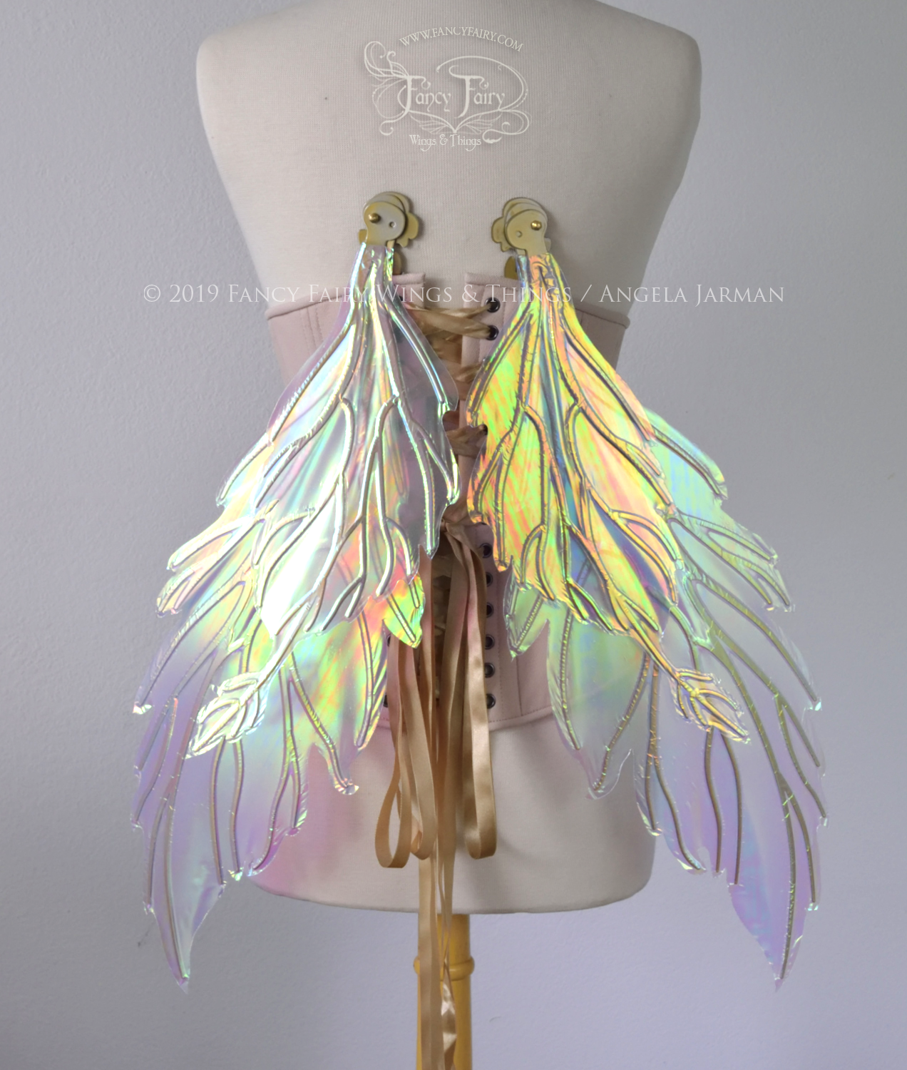 All Fancy Fairy wings are cut from a .040" thick lightweight yet sturdy aluminum sheet frame that's been powder coated and encased in iridescent film and vinyl laminate. They can be worn with the included clear elastic straps although ribbon or stronger elastic is recommended, or tucked into any snug bodice, bra strap or corset for even more comfort. They can be gently bent and posed to give them an even more life-like appearance!