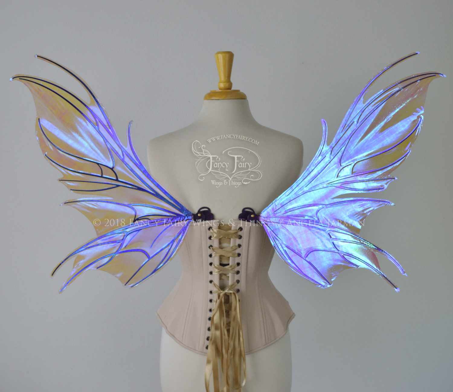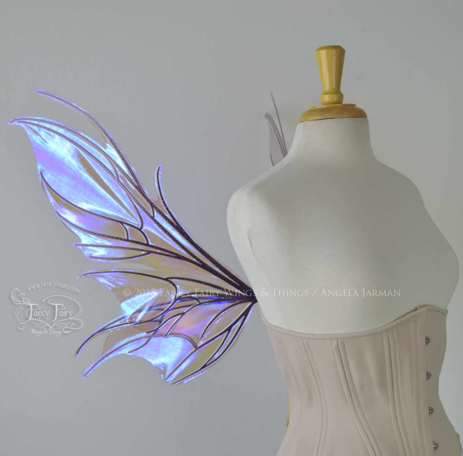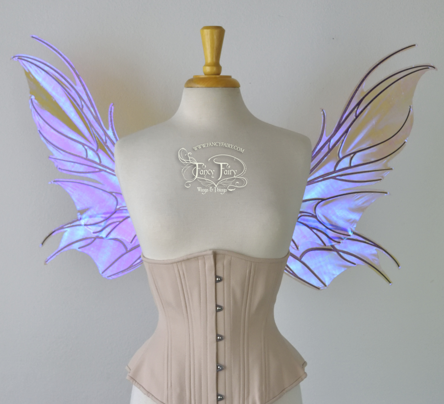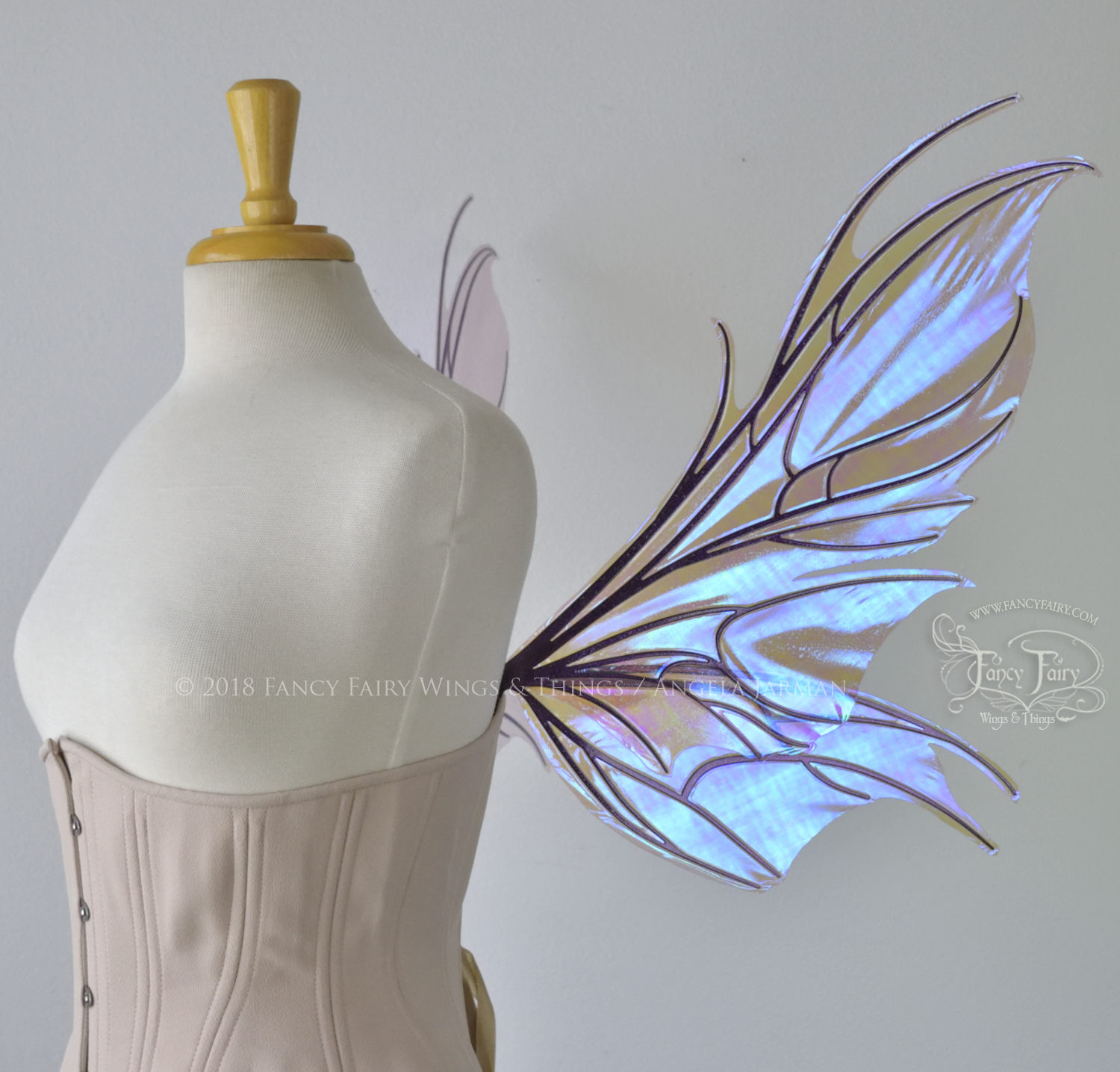 All Fancy Fairy wings are cut from a .040" thick lightweight yet sturdy aluminum sheet frame that's been powder coated and encased in iridescent film and vinyl laminate. They can be worn with the included clear elastic straps although ribbon or stronger elastic is recommended, or tucked into any snug bodice, bra strap or corset for even more comfort. They can be gently bent and posed to give them an even more life-like appearance!