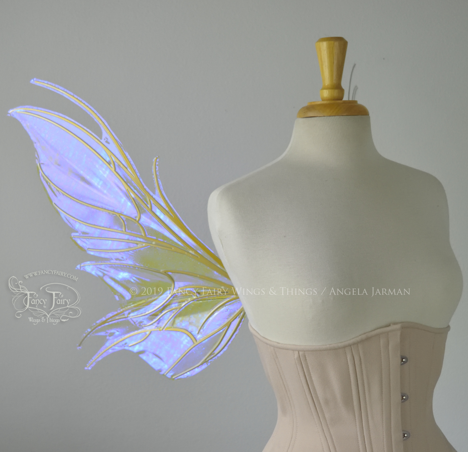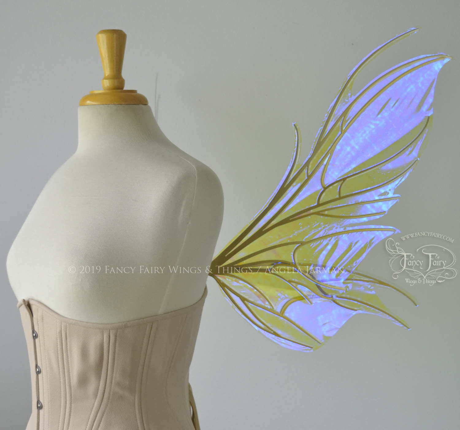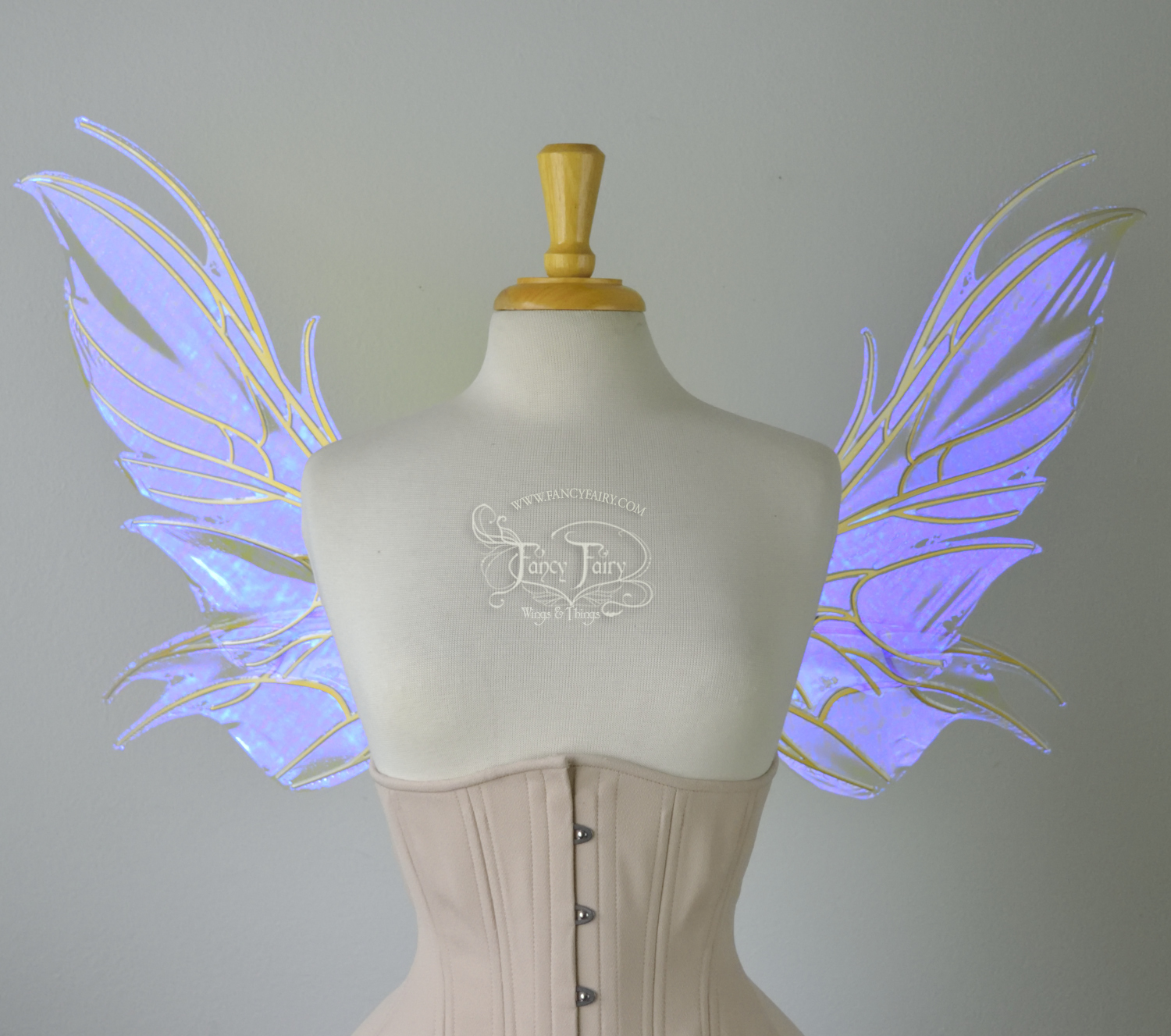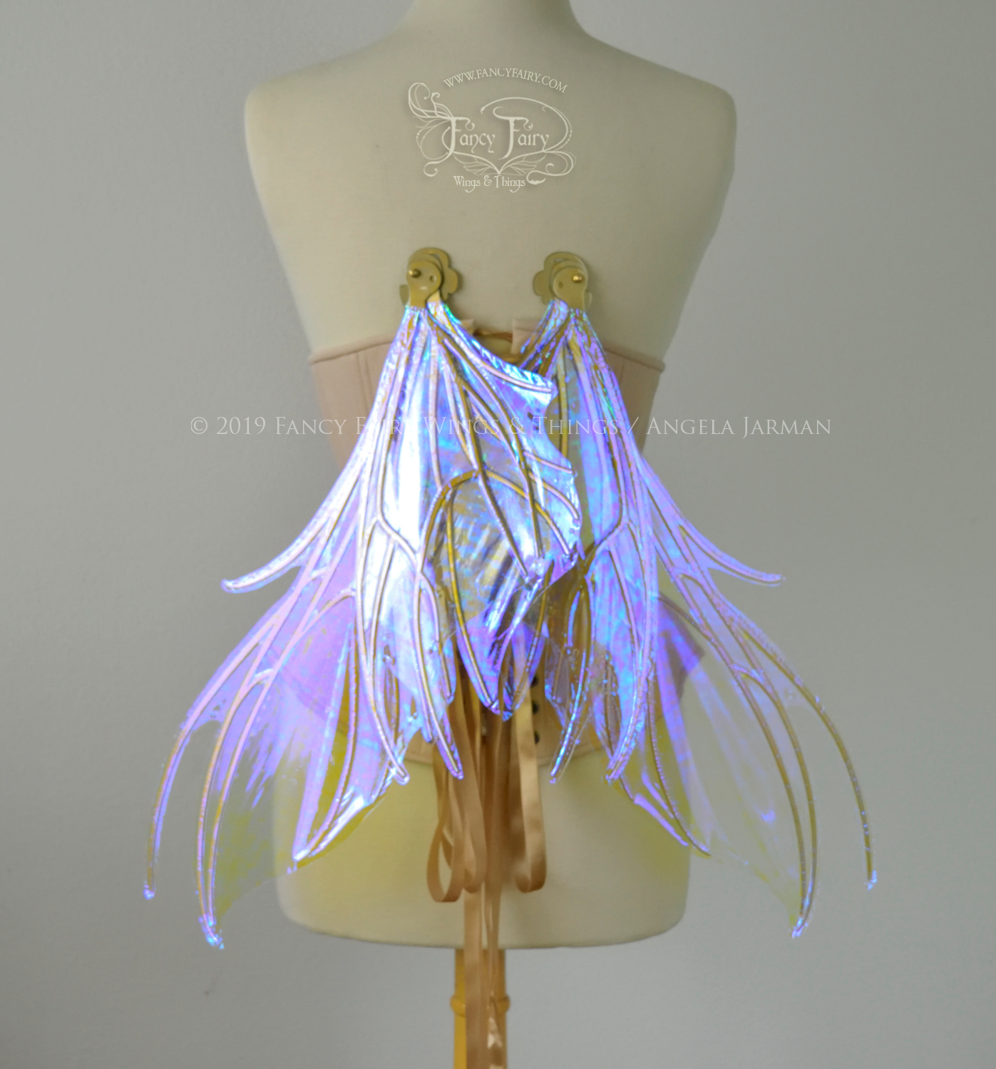 All Fancy Fairy wings are cut from a .040" thick lightweight yet sturdy aluminum sheet frame that's been powder coated and encased in iridescent film and vinyl laminate. They can be worn with the included clear elastic straps although ribbon or stronger elastic is recommended, or tucked into any snug bodice, bra strap or corset for even more comfort. They can be gently bent and posed to give them an even more life-like appearance!