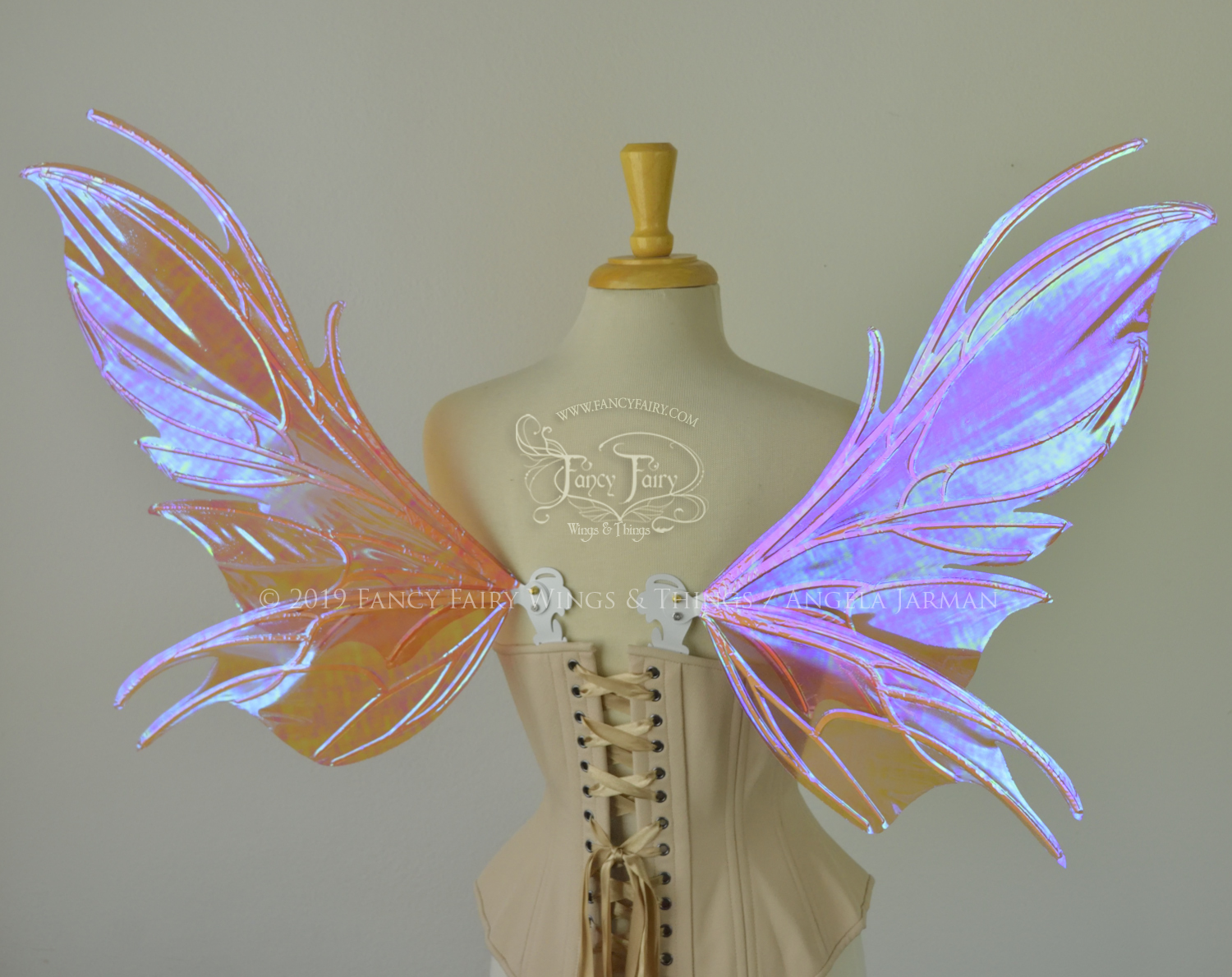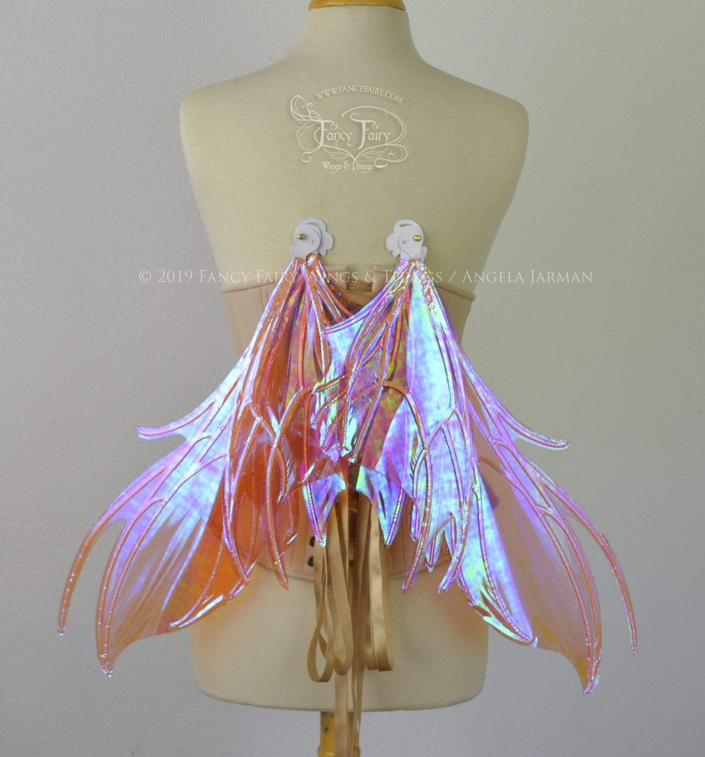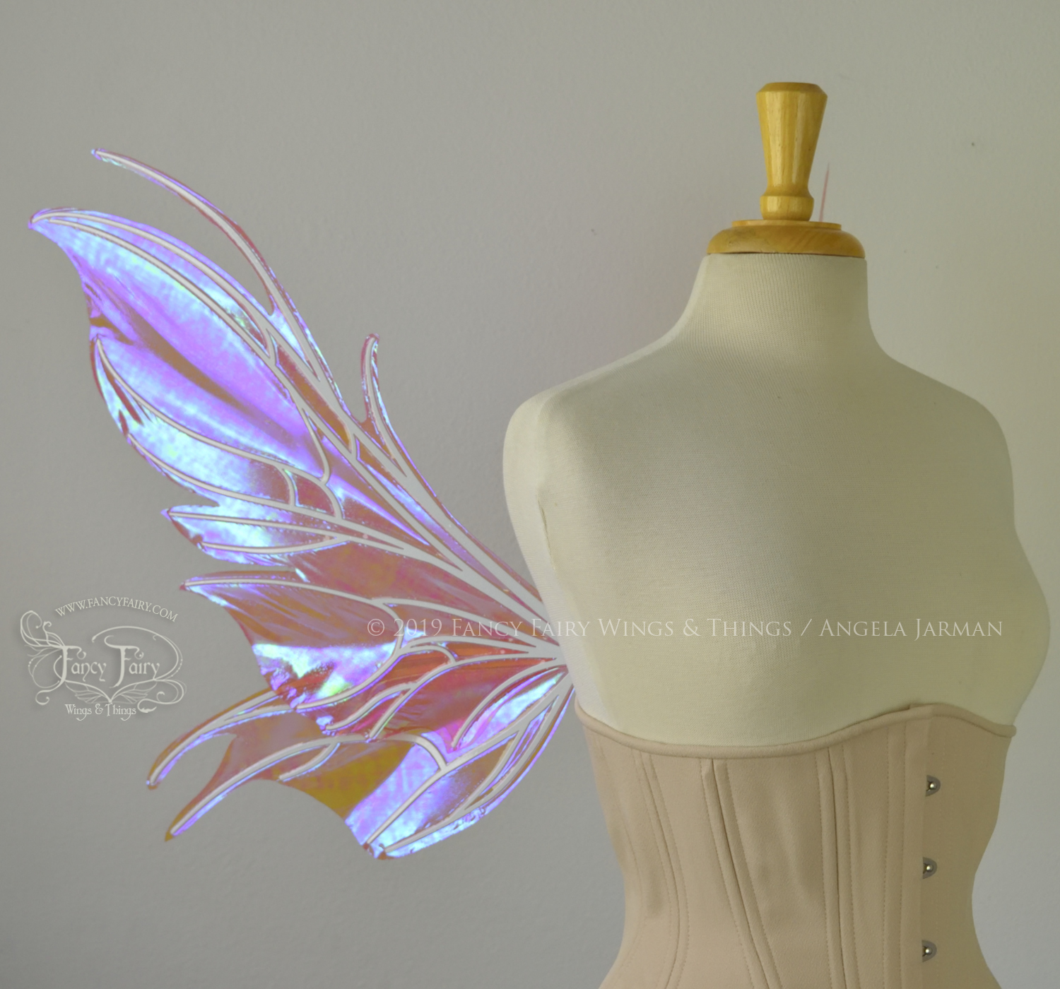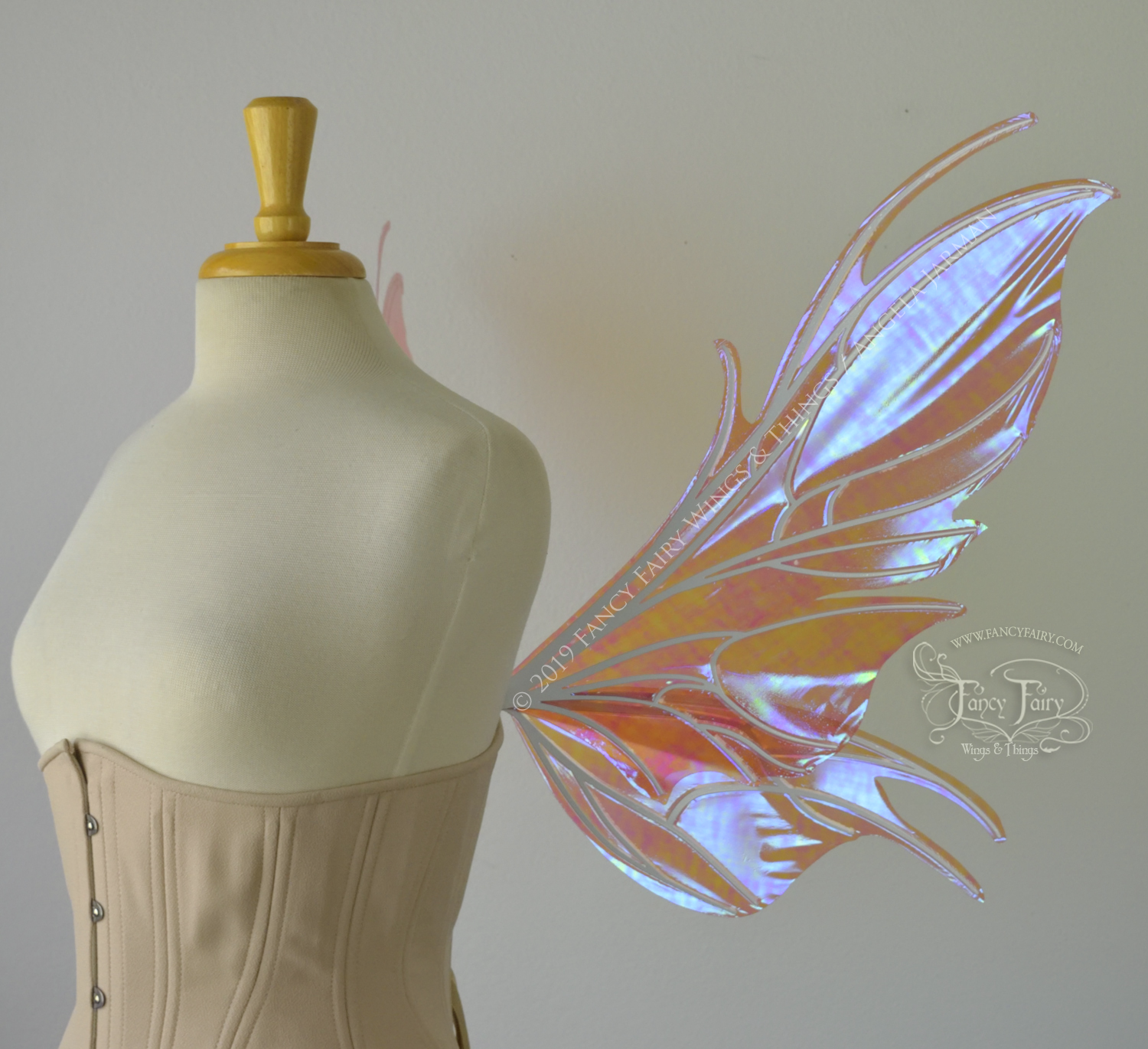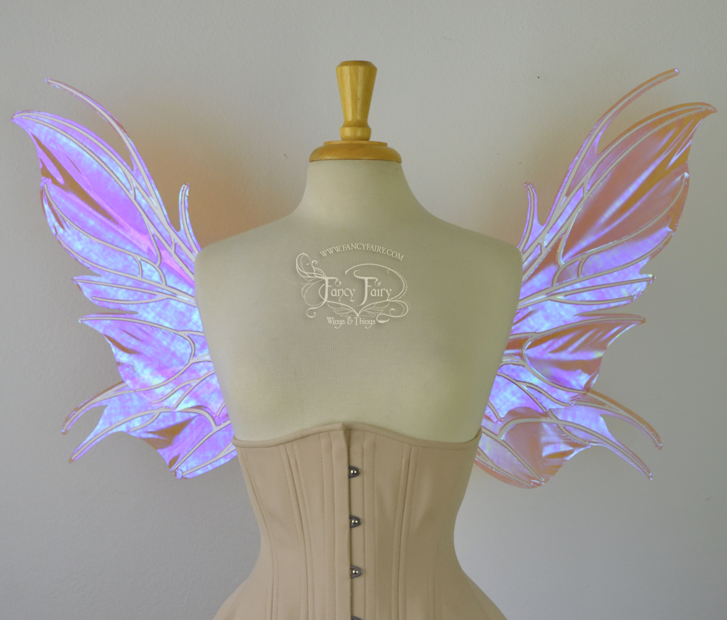 All Fancy Fairy wings are cut from a .040" thick lightweight yet sturdy aluminum sheet frame that's been powder coated and encased in iridescent film and vinyl laminate. They can be worn with the included clear elastic straps although ribbon or stronger elastic is recommended, or tucked into any snug bodice, bra strap or corset for even more comfort. They can be gently bent and posed to give them an even more life-like appearance!