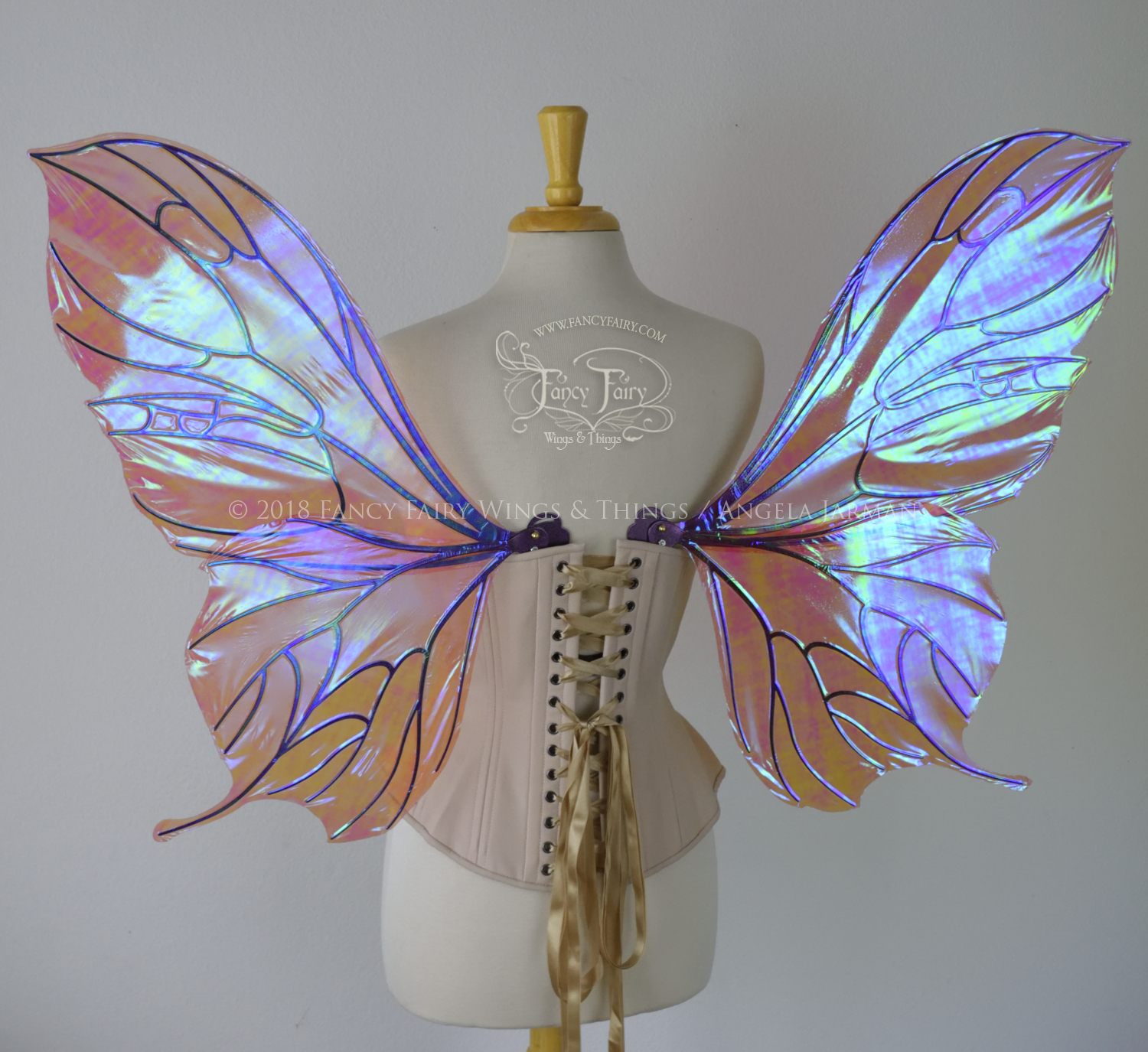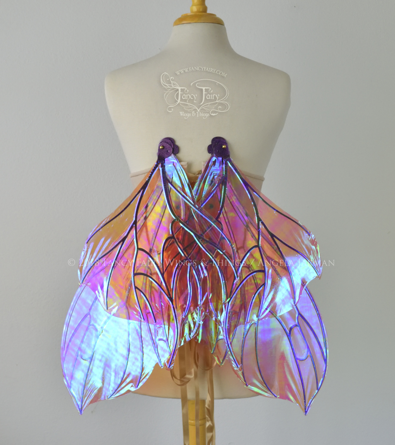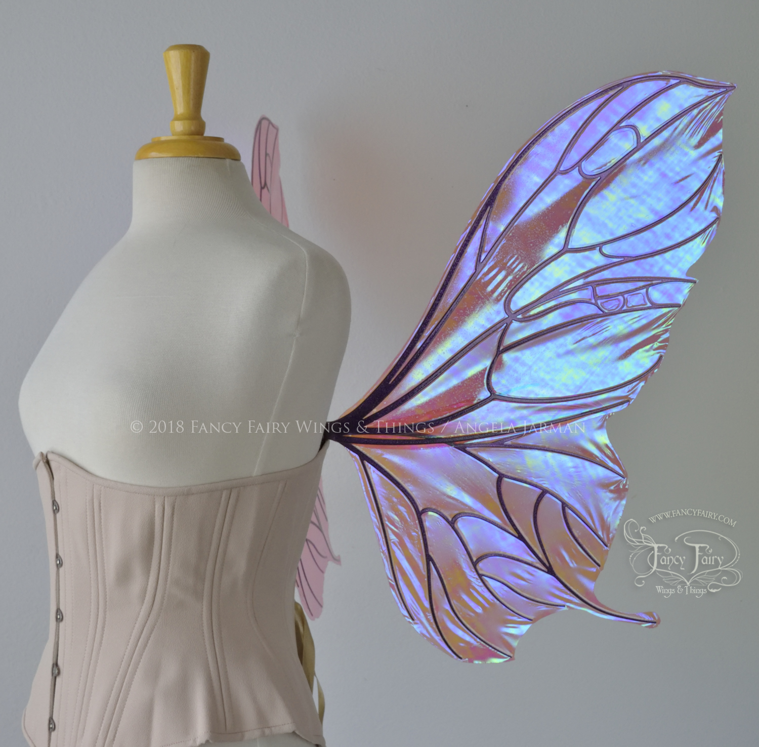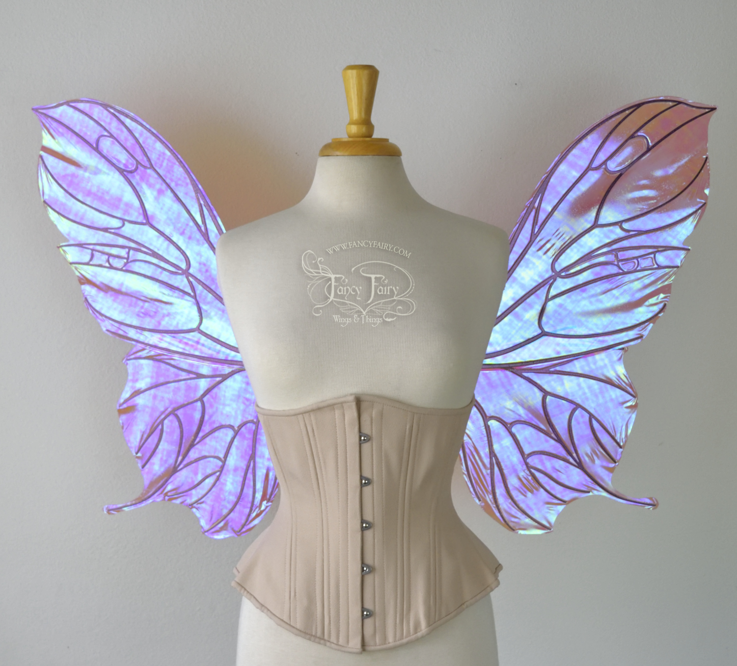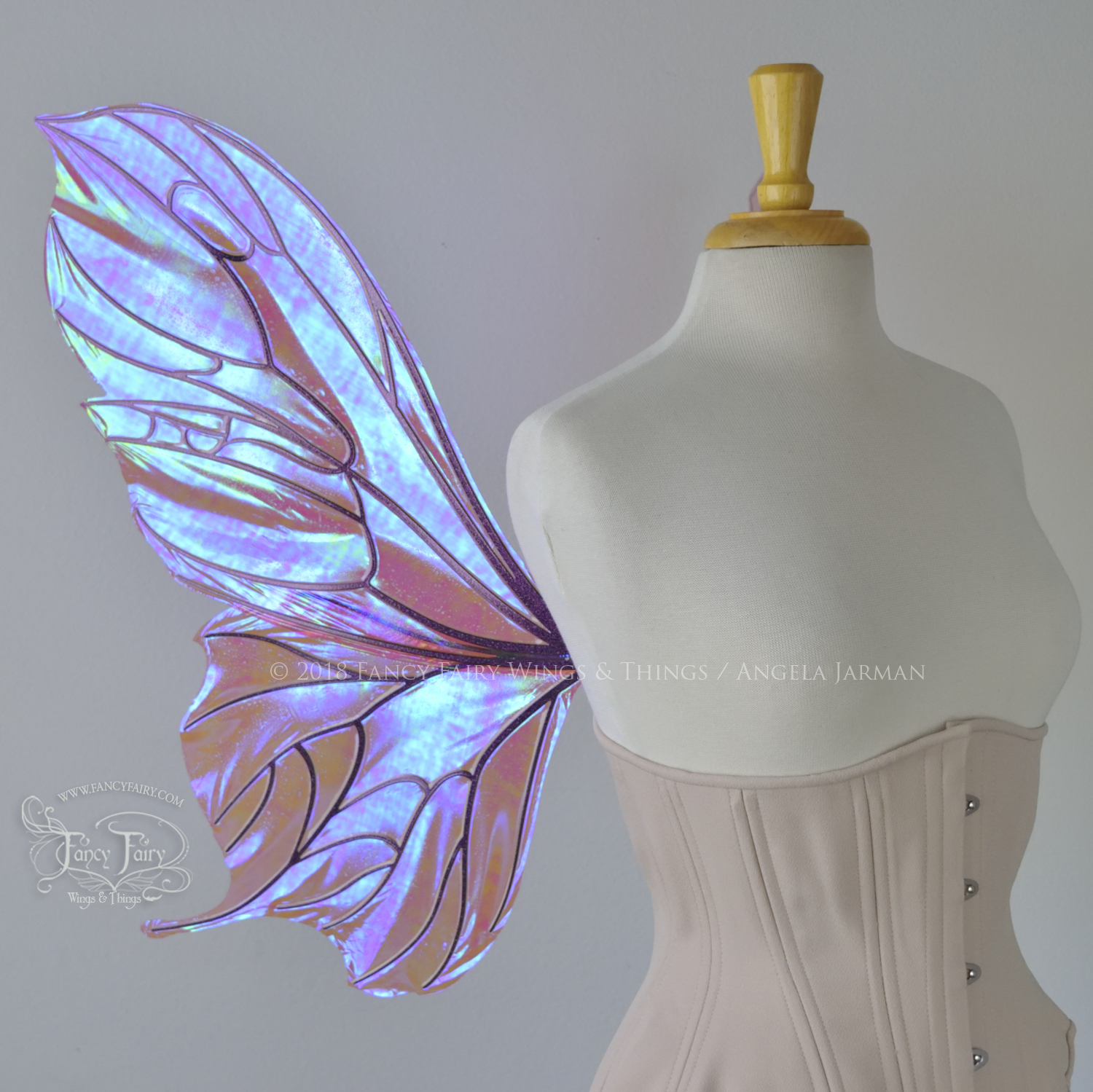 All Fancy Fairy wings are cut from a .040" thick lightweight yet sturdy aluminum sheet frame that's been powder coated and encased in iridescent film and vinyl laminate. They can be worn with the included clear elastic straps although ribbon or stronger elastic is recommended, or tucked into any snug bodice, bra strap or corset for even more comfort. They can be gently bent and posed to give them an even more life-like appearance!