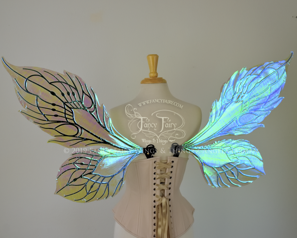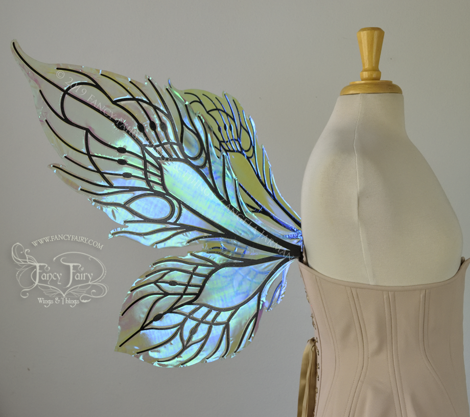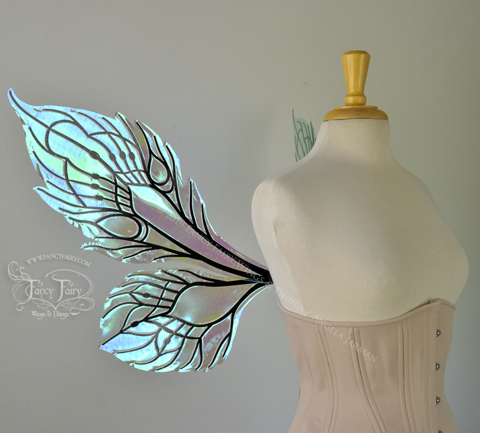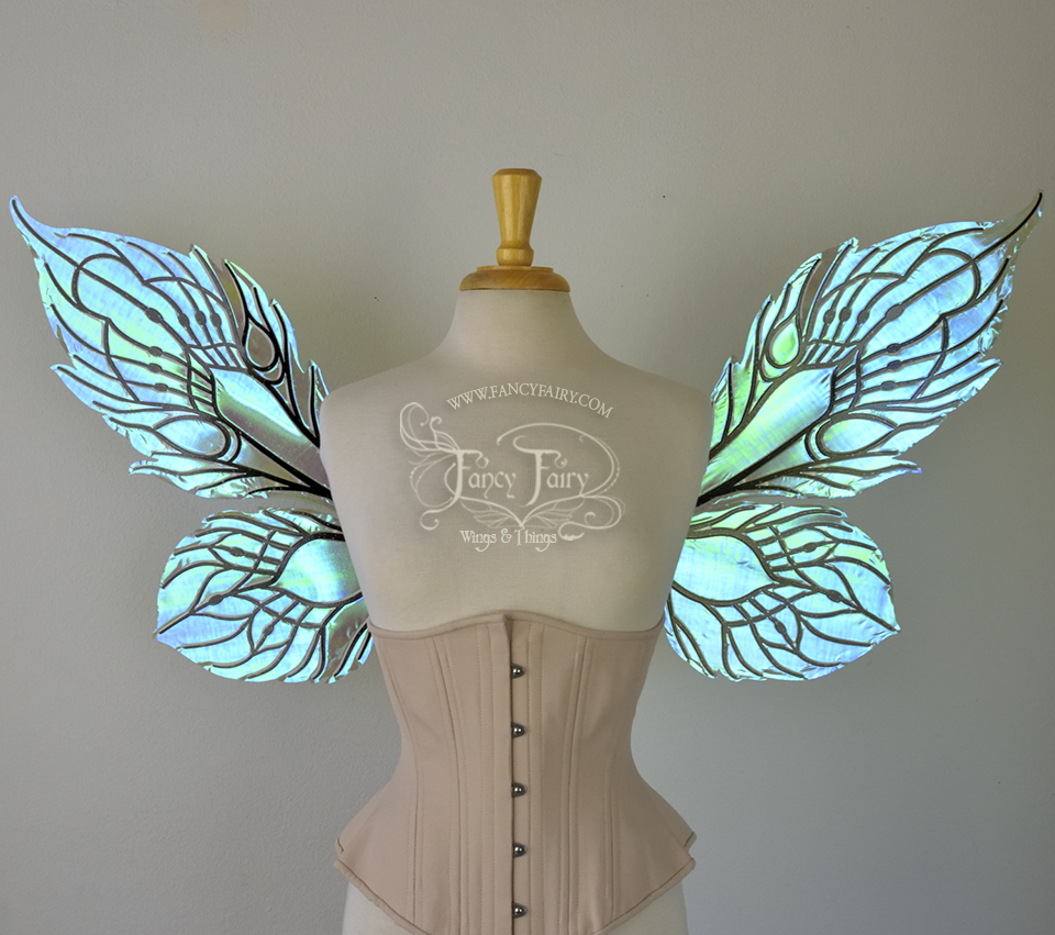 All Fancy Fairy wings are cut from a .040" thick lightweight yet sturdy aluminum sheet frame that's been powder coated and encased in iridescent film and vinyl laminate. They can be worn with the included clear elastic straps although ribbon or stronger elastic is recommended, or tucked into any snug bodice or corset for even more comfort. They can be gently bent and posed to give them an even more life-like appearance!