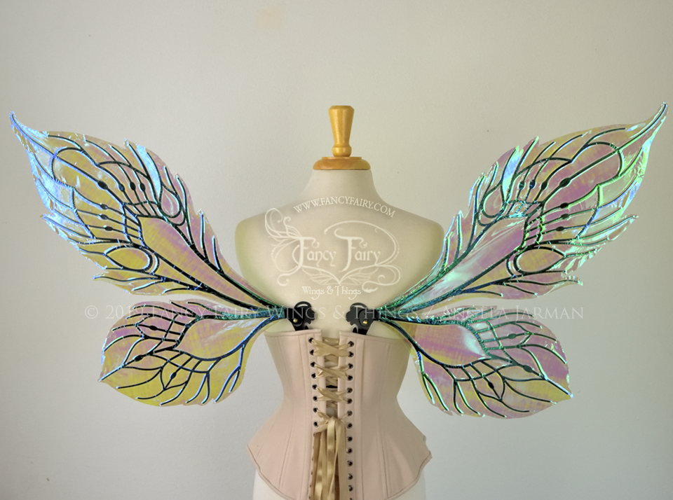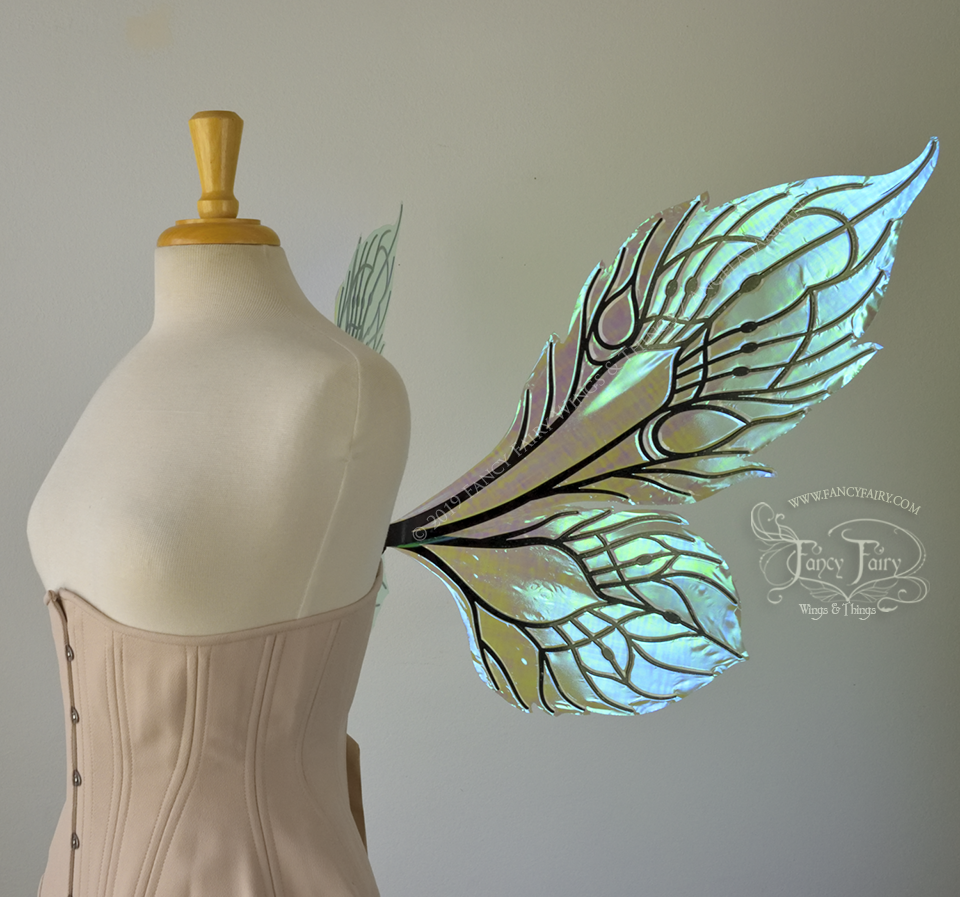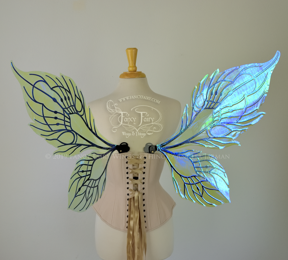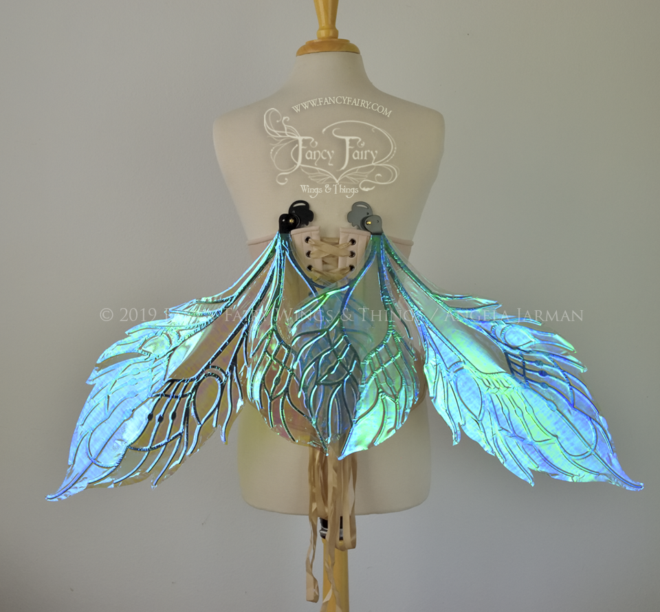 The Sintra design is from the new Ethereal Collection of convertible fairy wings, now they can be positioned in either an 'up' or a resting 'down' position without compromising the metal with harsh bending. These have been laminated in the new Absinthe premium iridescent film, and the metal veins are black.