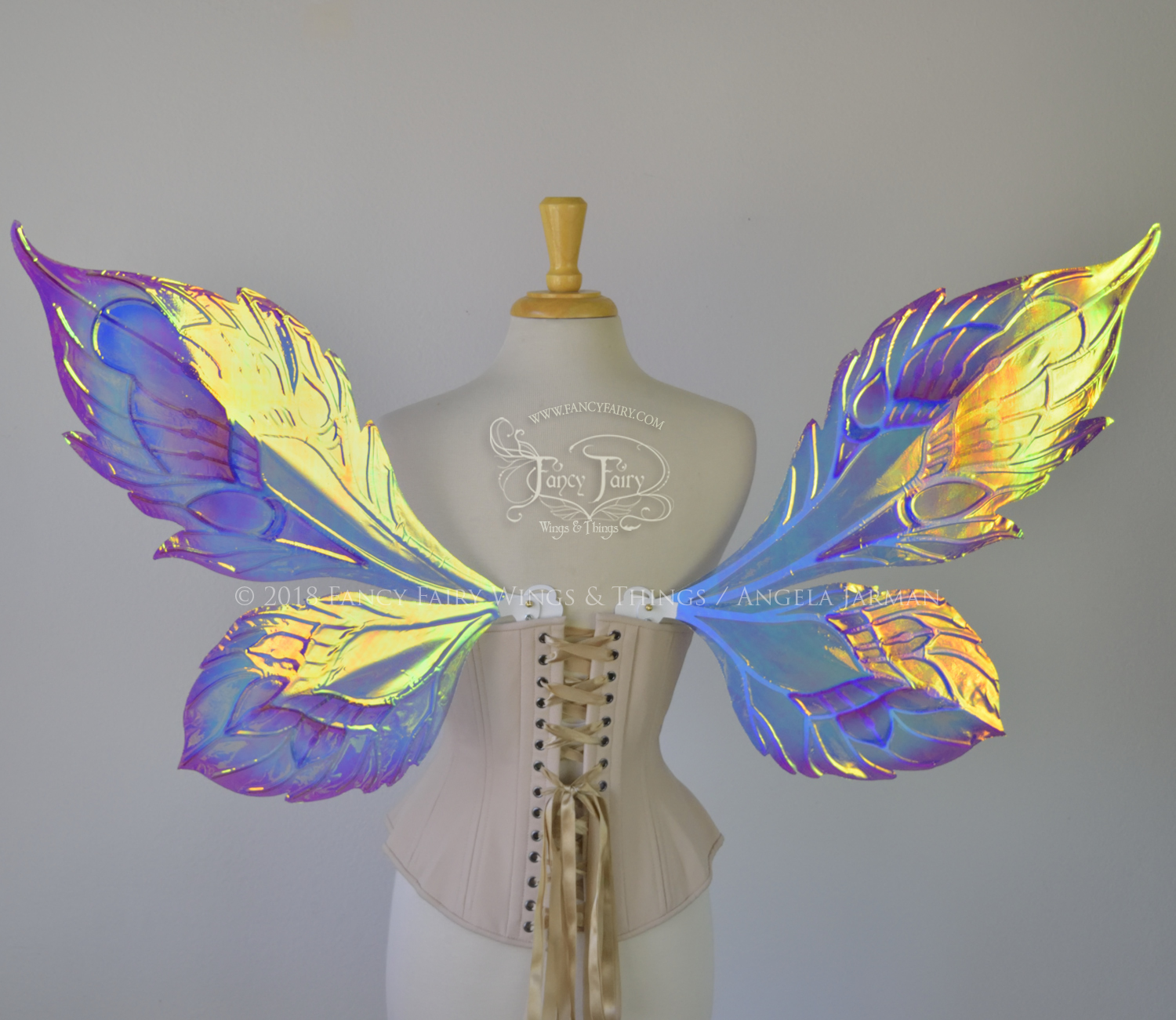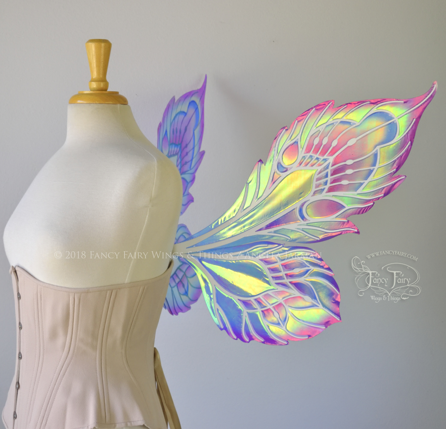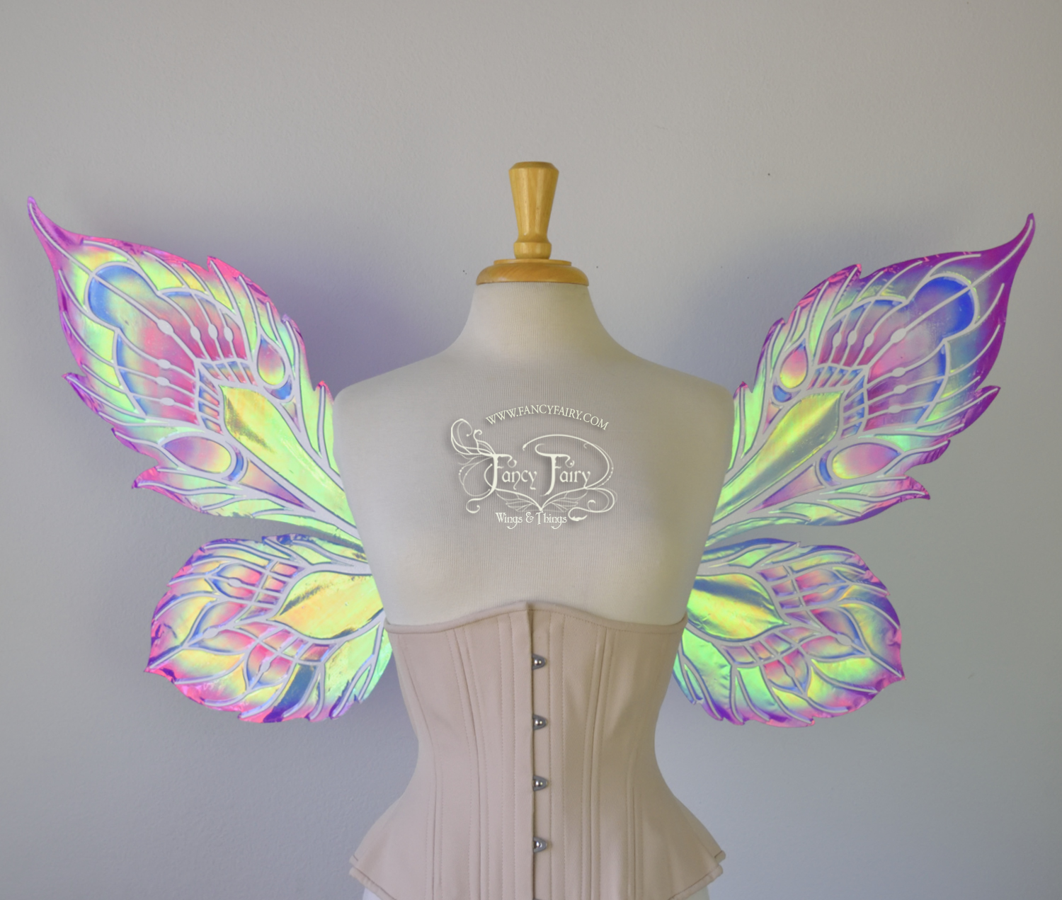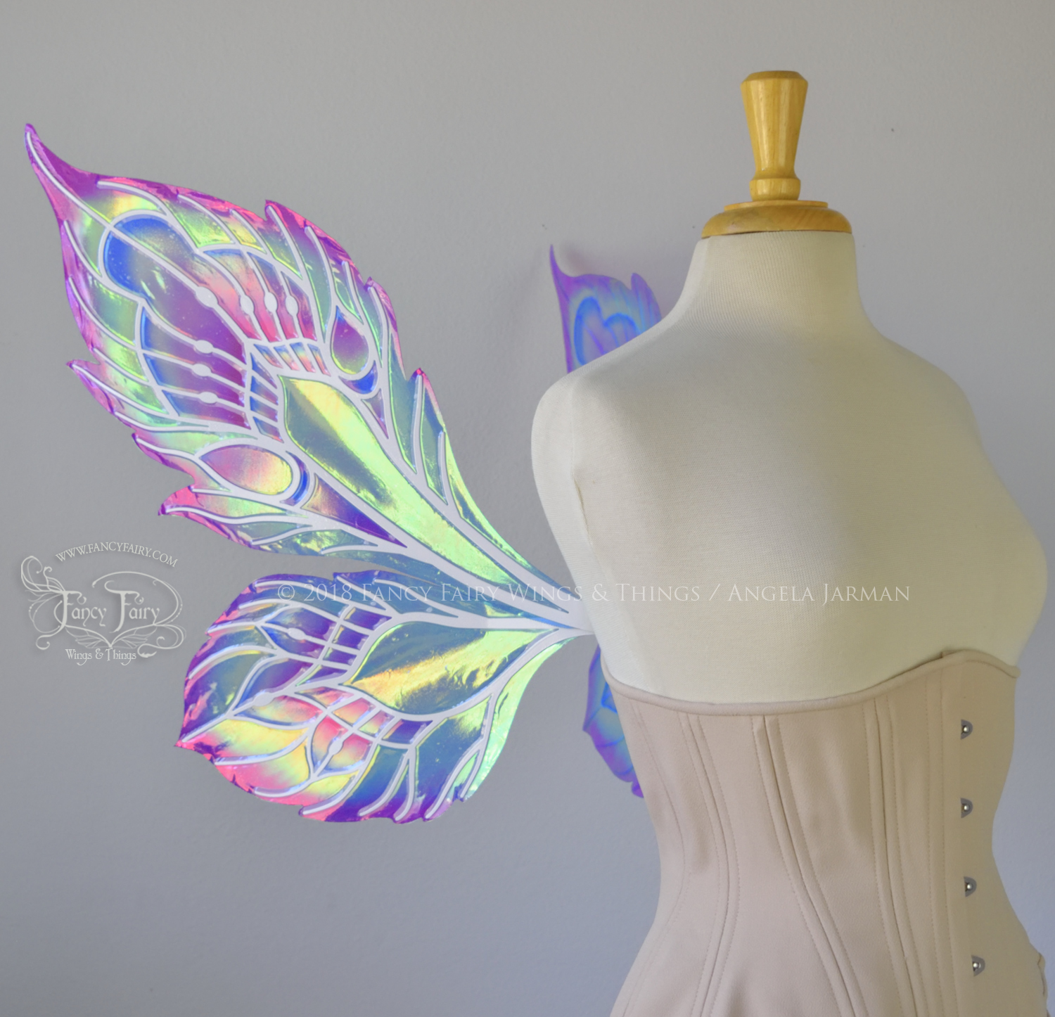 All Fancy Fairy wings are cut from a .040" thick lightweight yet sturdy aluminum sheet frame that's been powder coated and encased in iridescent film and vinyl laminate. They can be worn with the included clear elastic straps although ribbon or stronger elastic is recommended, or tucked into any snug bodice, bra strap or corset for even more comfort. They can be gently bent and posed to give them an even more life-like appearance!