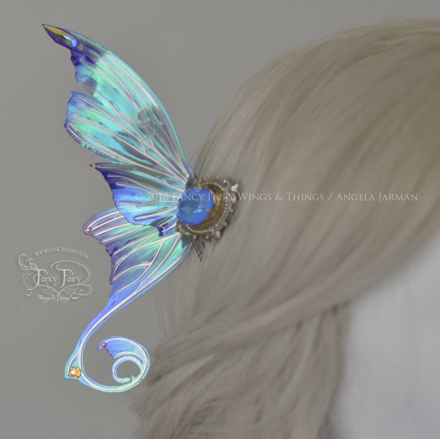 These have been painted with a teal color near the base fading to indigo at the edges on iridescent Aquamarine film, the veined frame is made of nickel silver that is .010" thick. Swarovski crystals accent the wings and the silver setting on the comb base.