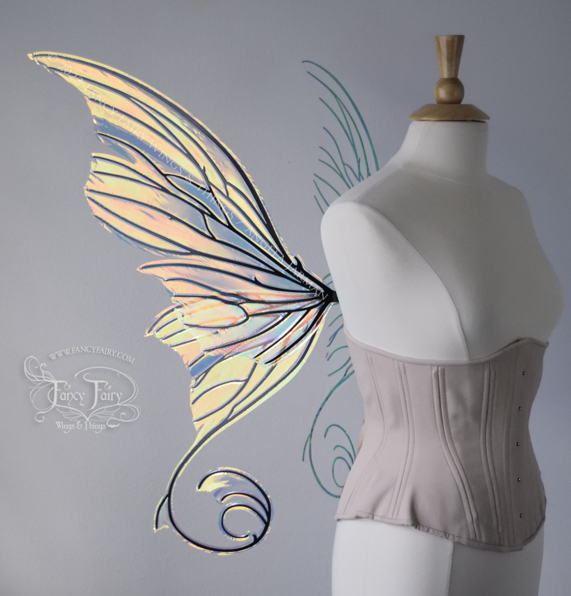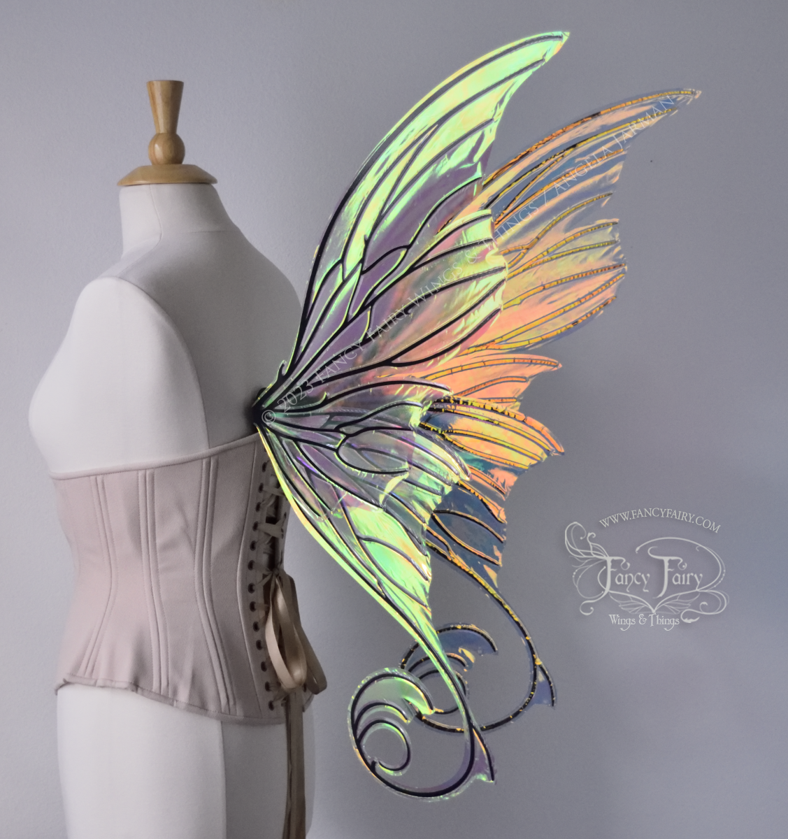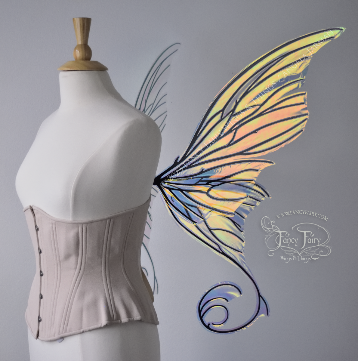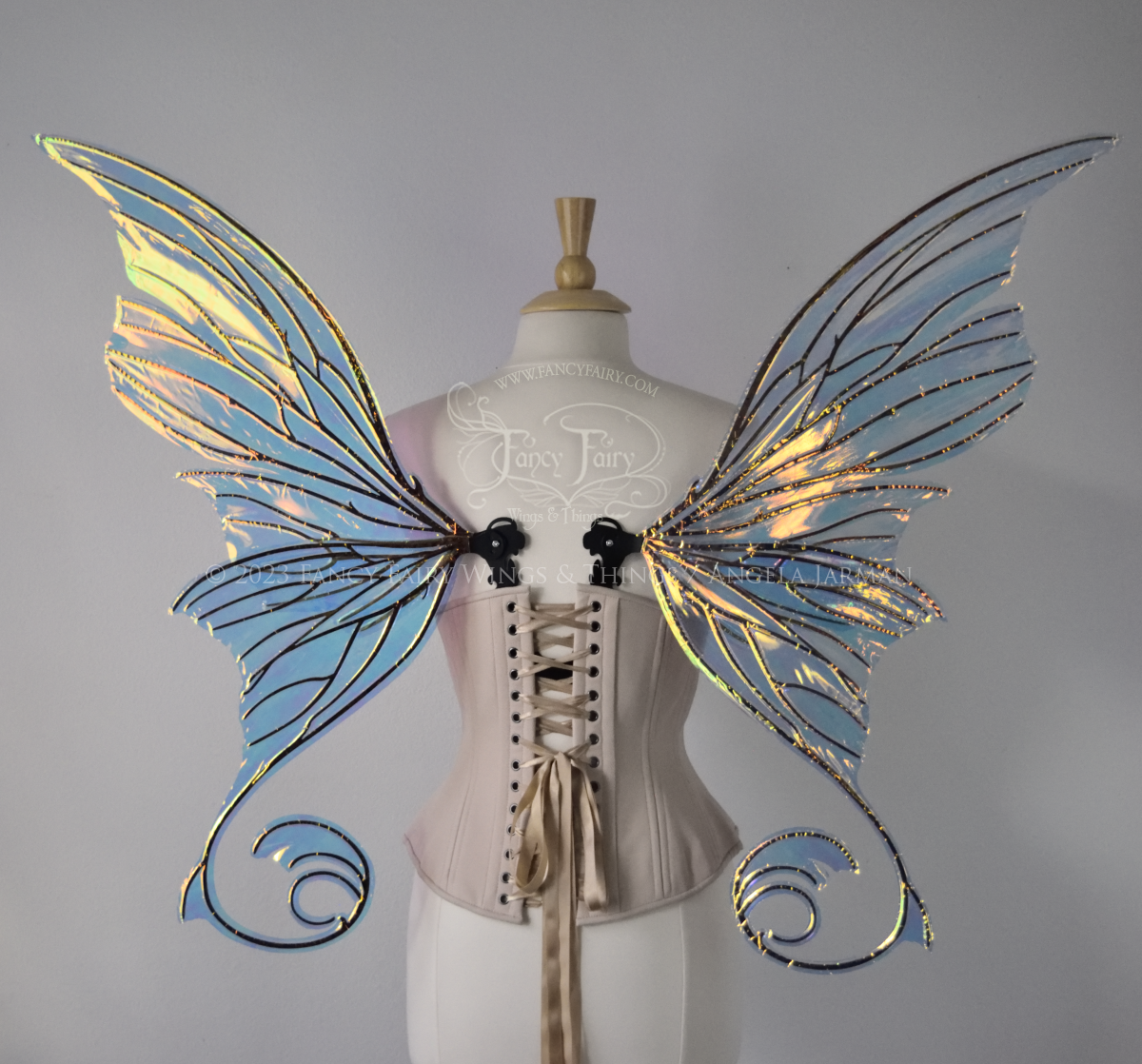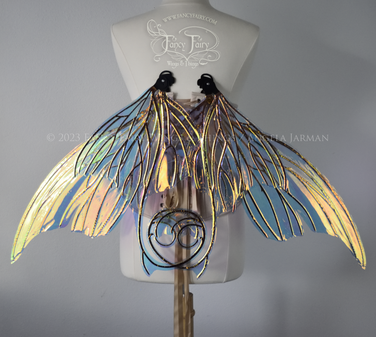 Aphrodite Iridescent Fairy Wings in Clear Diamond Fire with Black Veins, Ready to Ship