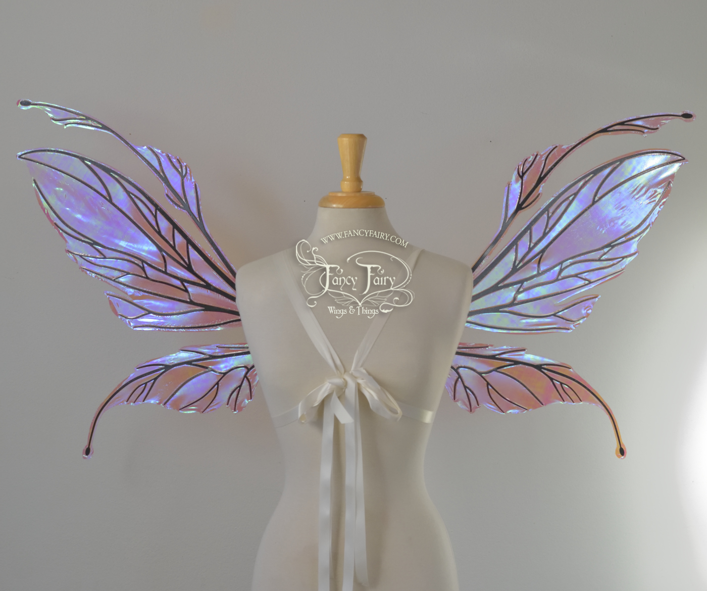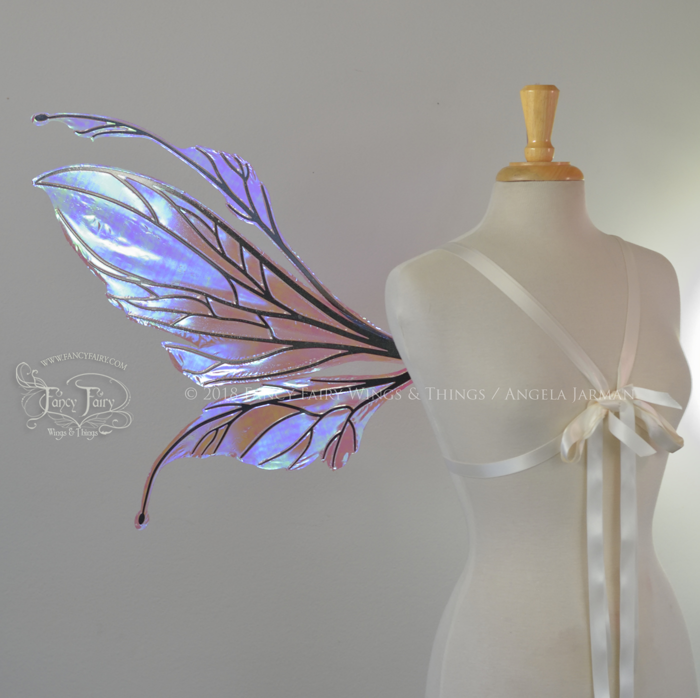 All Fancy Fairy wings are cut from a .040" thick lightweight yet sturdy aluminum sheet frame that's been powder coated and encased in iridescent film and vinyl laminate. They can be worn with the included clear elastic straps although ribbon or stronger elastic is recommended, or tucked into any snug bodice, bra strap or corset for even more comfort. They can be gently bent and posed to give them an even more life-like appearance!
