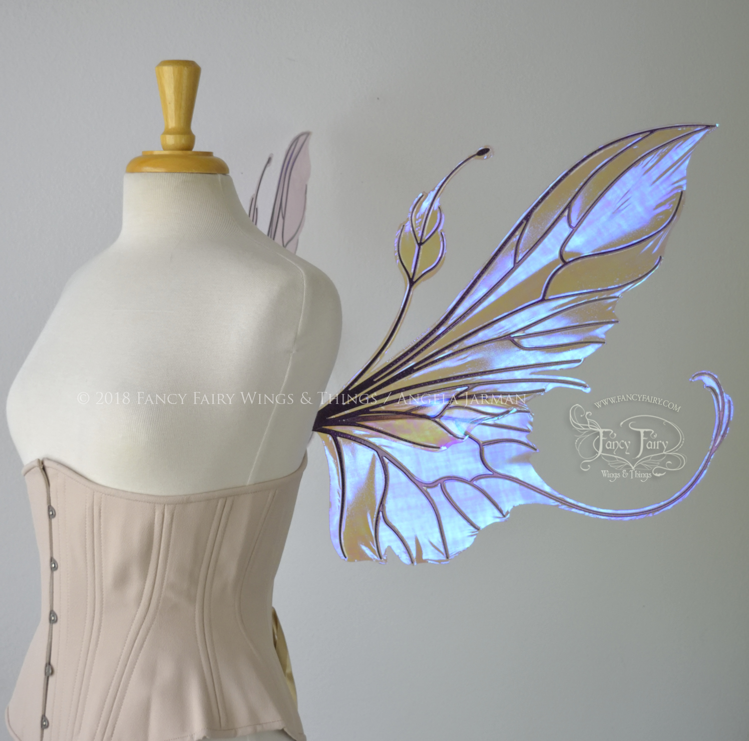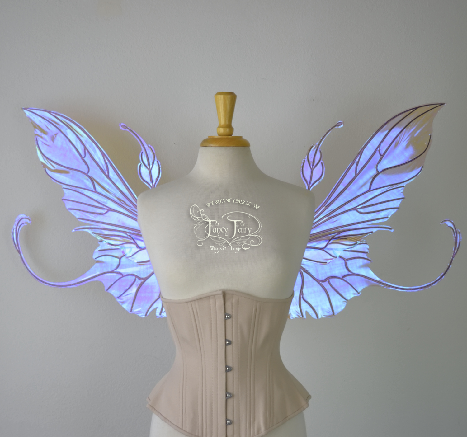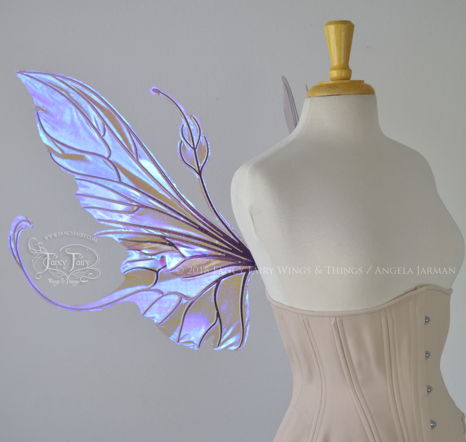 All Fancy Fairy wings are cut from a .040" thick lightweight yet sturdy aluminum sheet frame that's been powder coated and encased in iridescent film and vinyl laminate. They can be worn with the included clear elastic straps although ribbon or stronger elastic is recommended, or tucked into any snug bodice, bra strap or corset for even more comfort. They can be gently bent and posed to give them an even more life-like appearance!