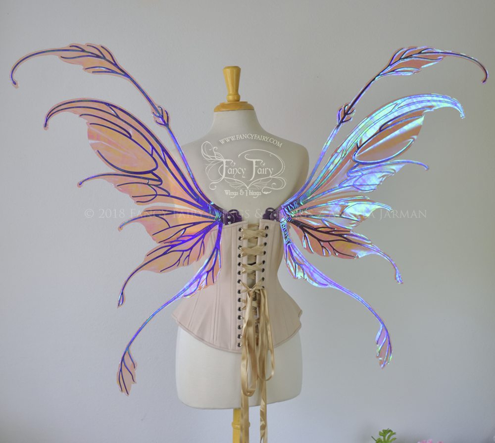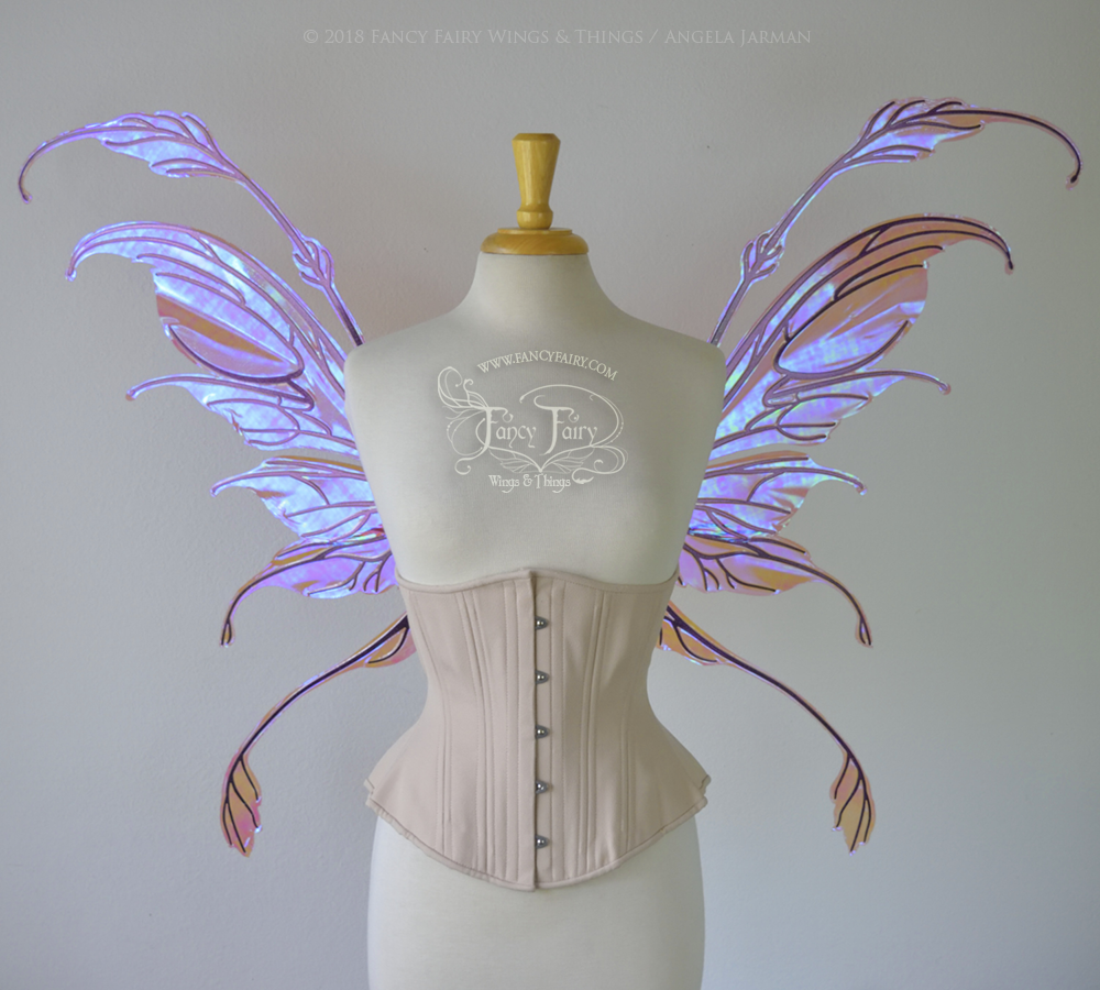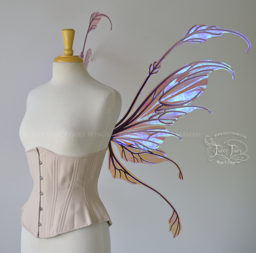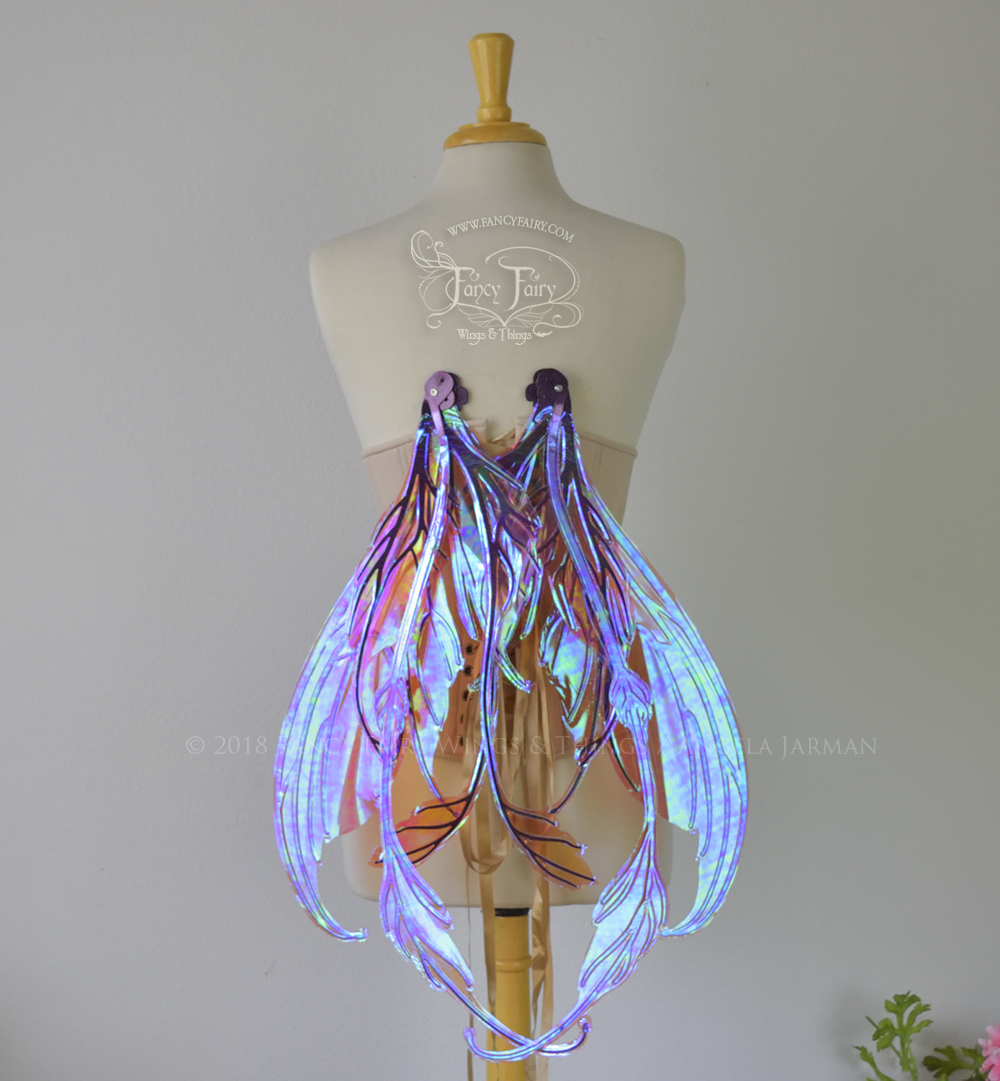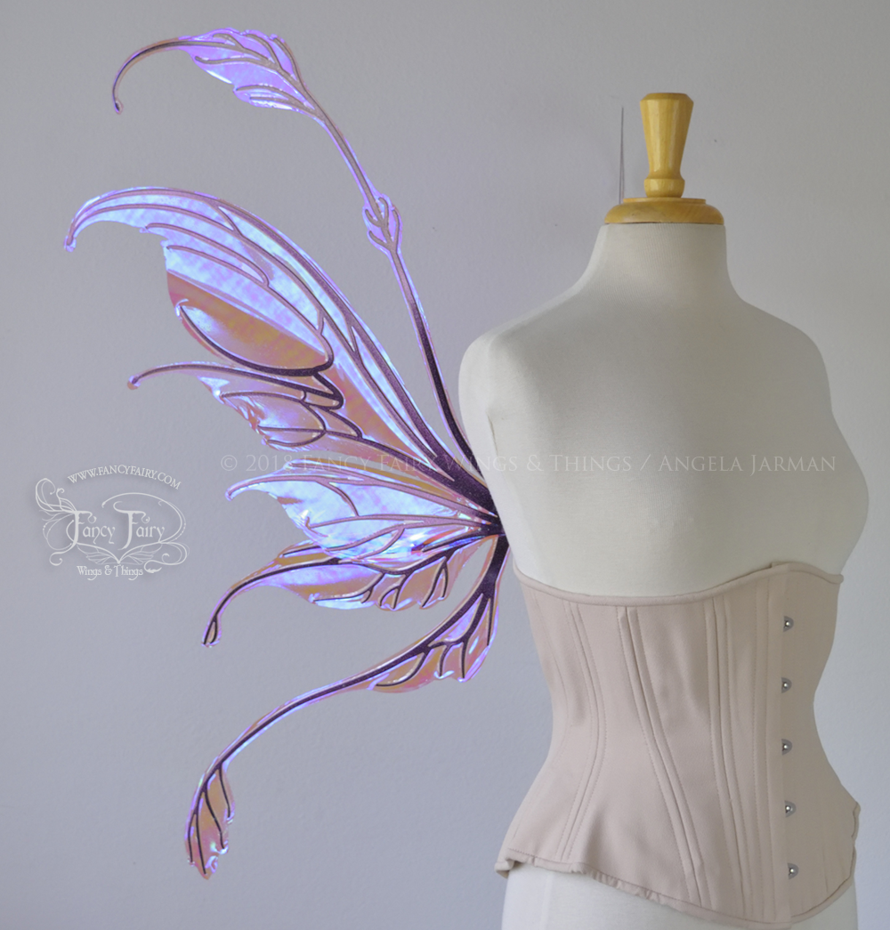 All Fancy Fairy wings are cut from a .040" thick lightweight yet sturdy aluminum sheet frame that's been powder coated and encased in iridescent film and vinyl laminate. They can be worn with the included clear elastic straps although ribbon or stronger elastic is recommended, or tucked into any snug bodice, bra strap or corset for even more comfort. They can be gently bent and posed to give them an even more life-like appearance!