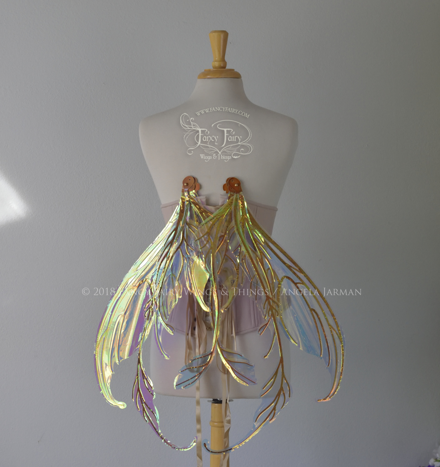 The Fauna design is from the new Ethereal Collection of convertible fairy wings that can be positioned in either an 'up' or a resting 'down' position without compromising the metal with harsh bending. These have been laminated in the clear Diamond Fire iridescent film, and the metal veins are done in copper.