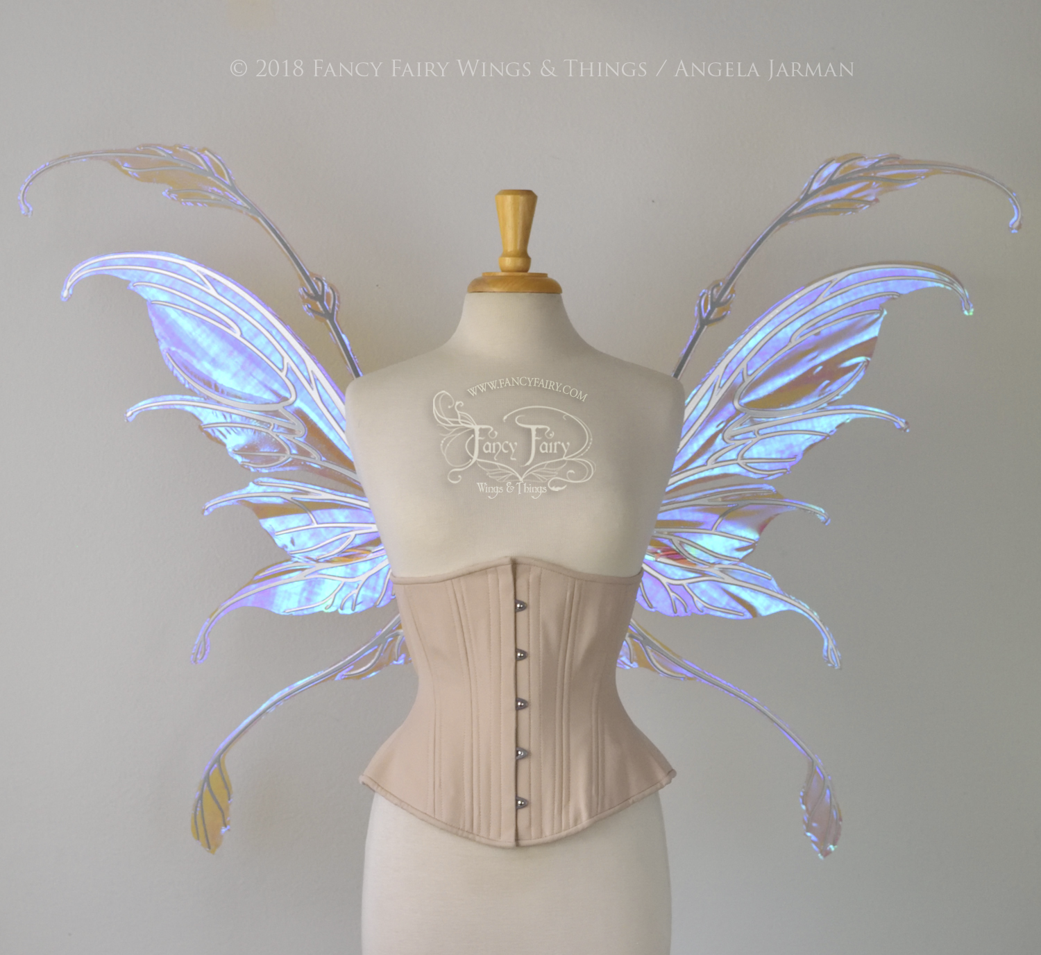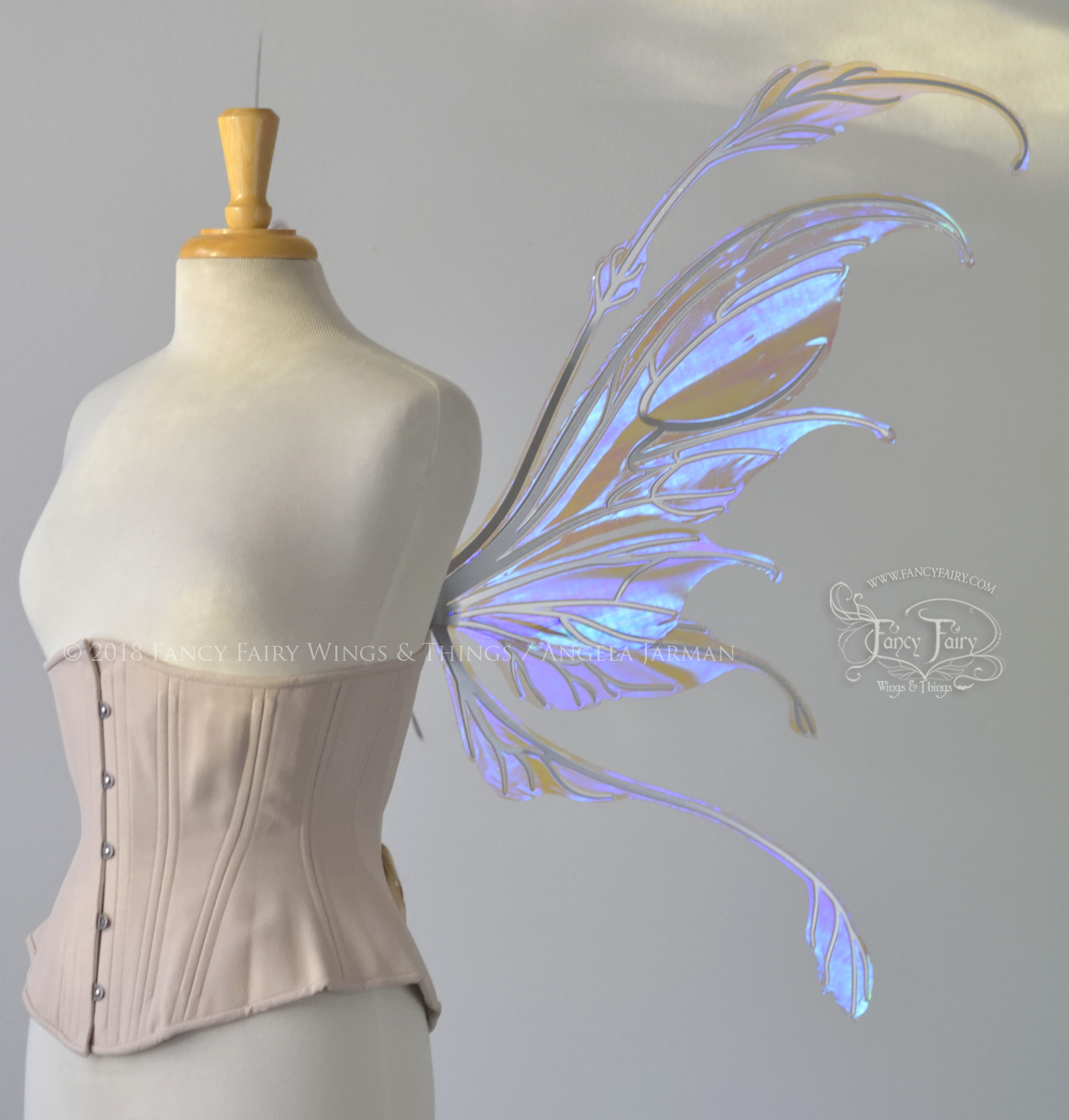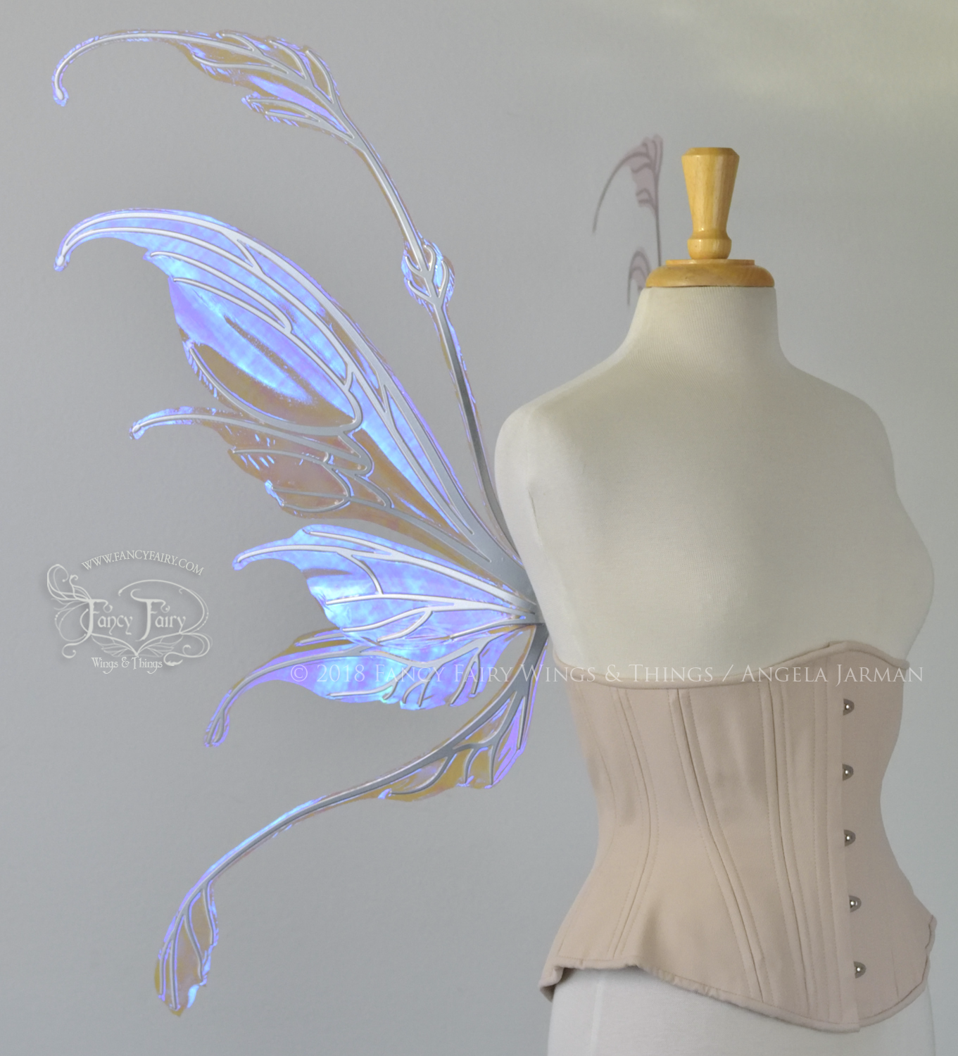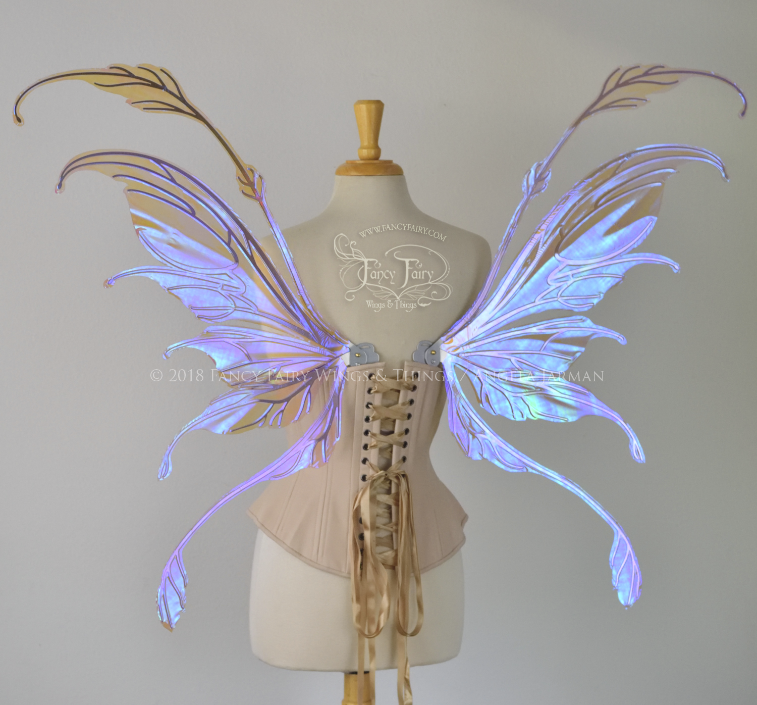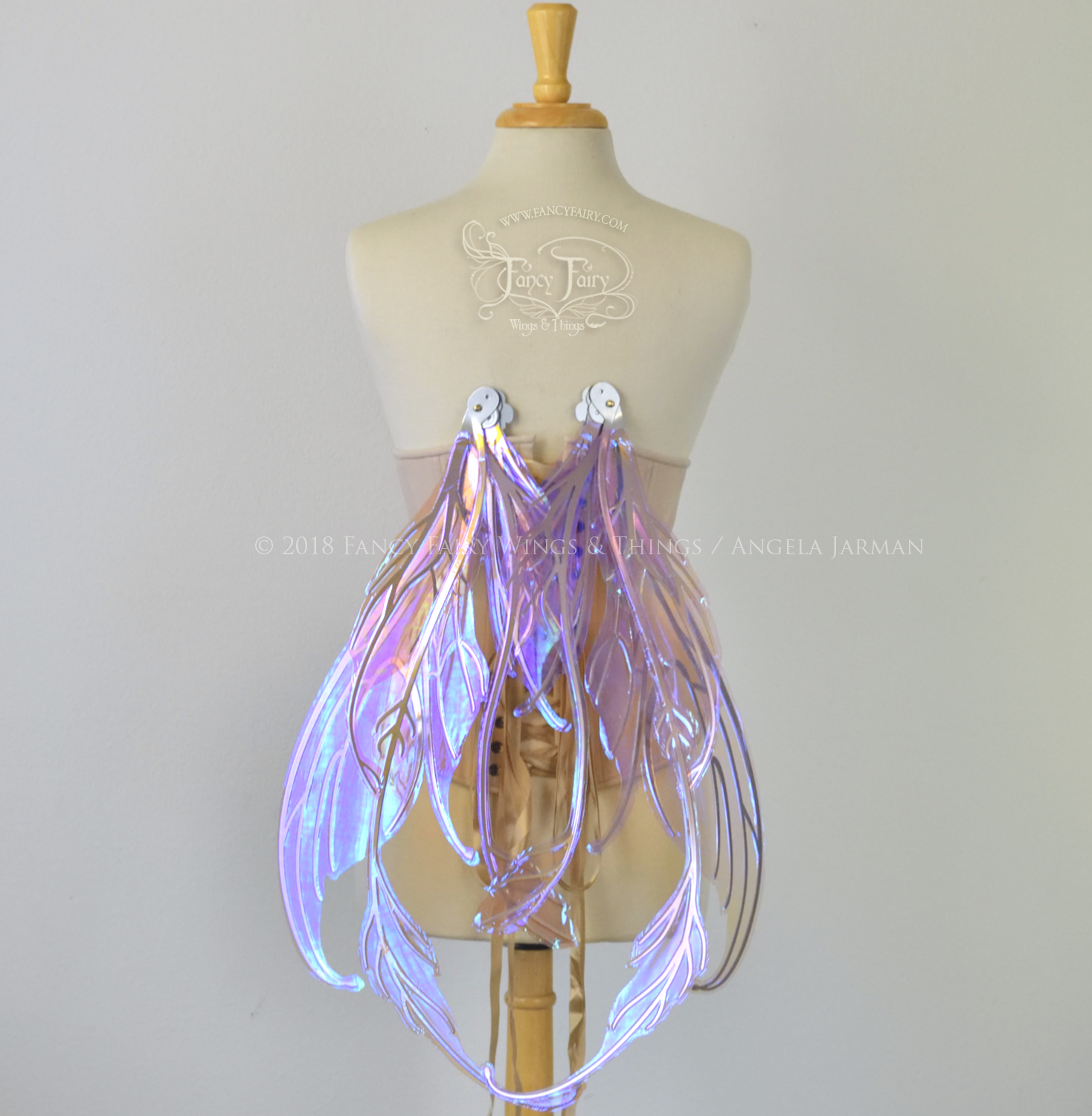 The Fauna design is from the 2018 Ethereal Collection of convertible fairy wings, which can be positioned in either an 'up' or a resting 'down' position without compromising the metal with harsh bending. These have been laminated in the Lilac iridescent film, and the metal veins are powder coated in silver chrome.