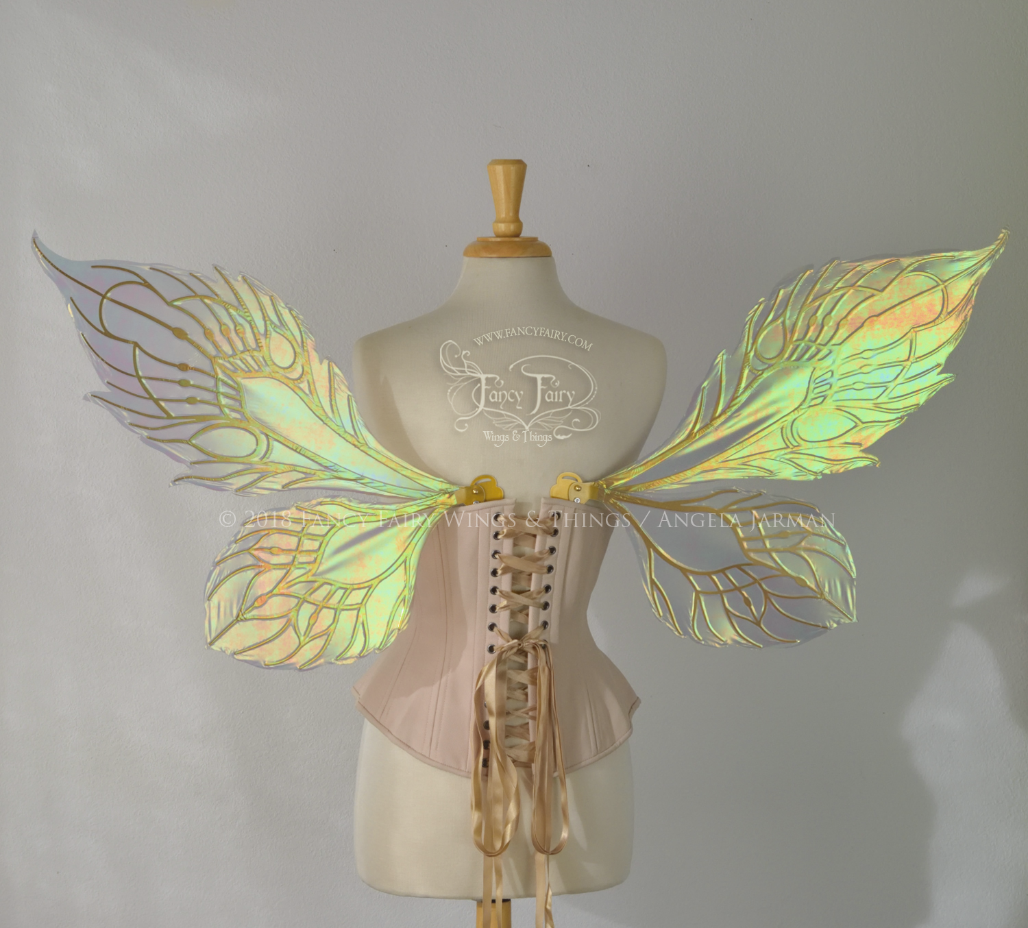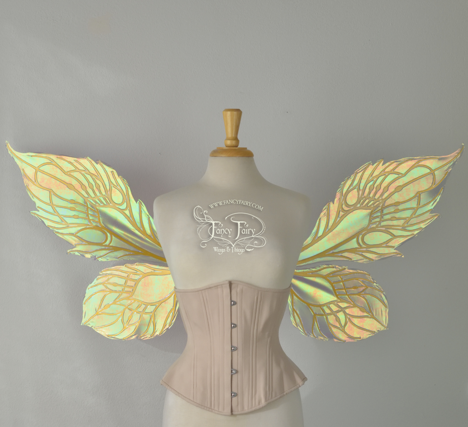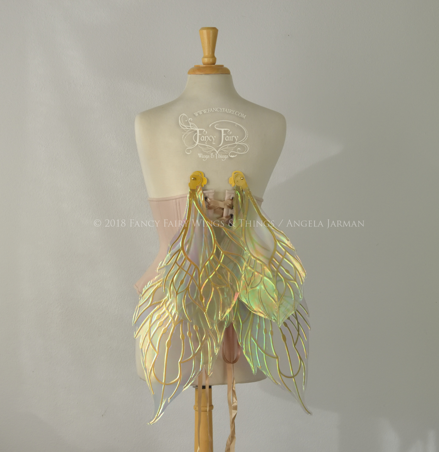 Introducing the Sintra design from the new Ethereal Collection of convertible fairy wings, now they can be positioned in either an 'up' or a resting 'down' position without compromising the metal with harsh bending. These have been laminated in the Patina Green iridescent film, and the metal veins are metallic gold.