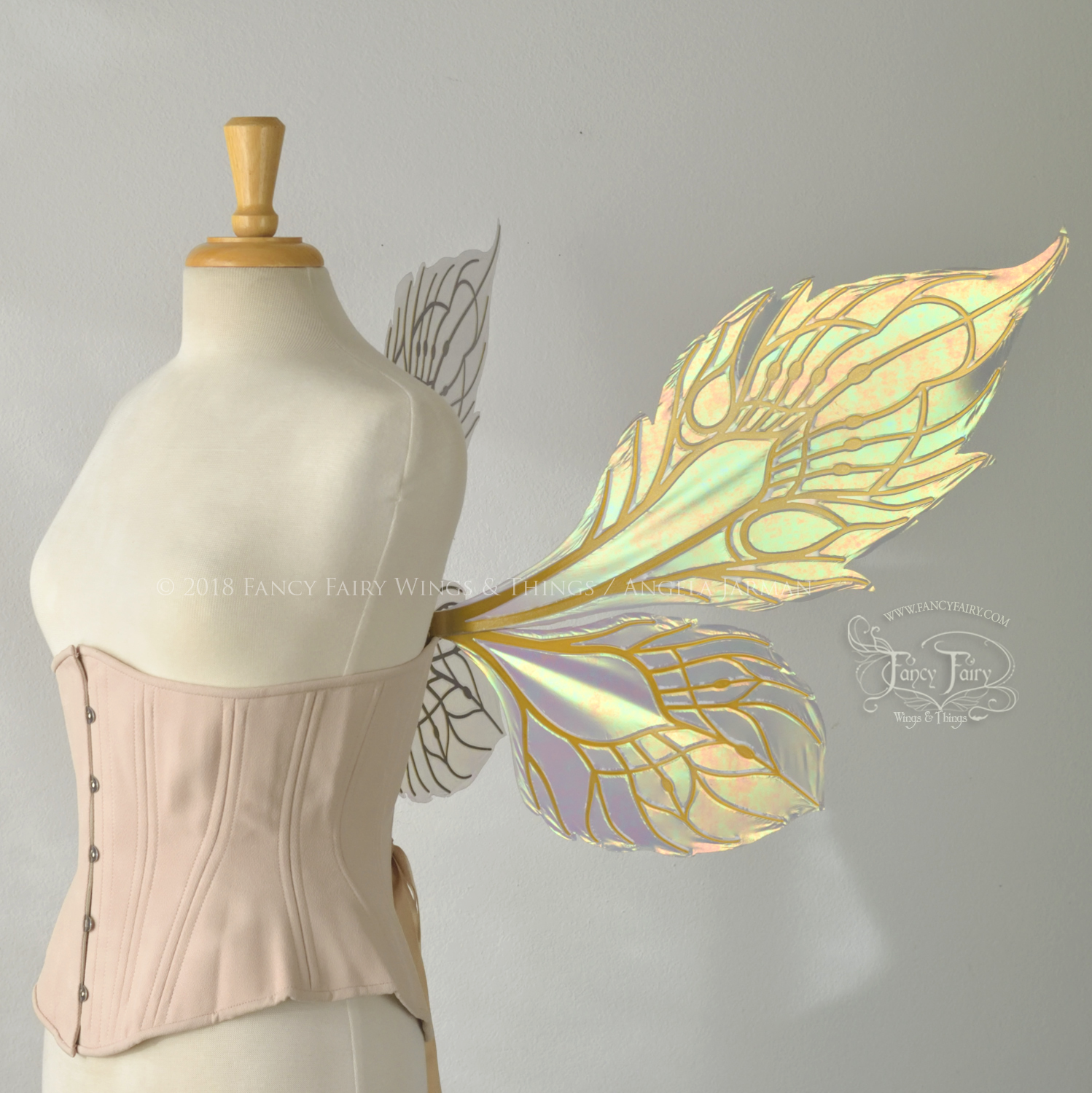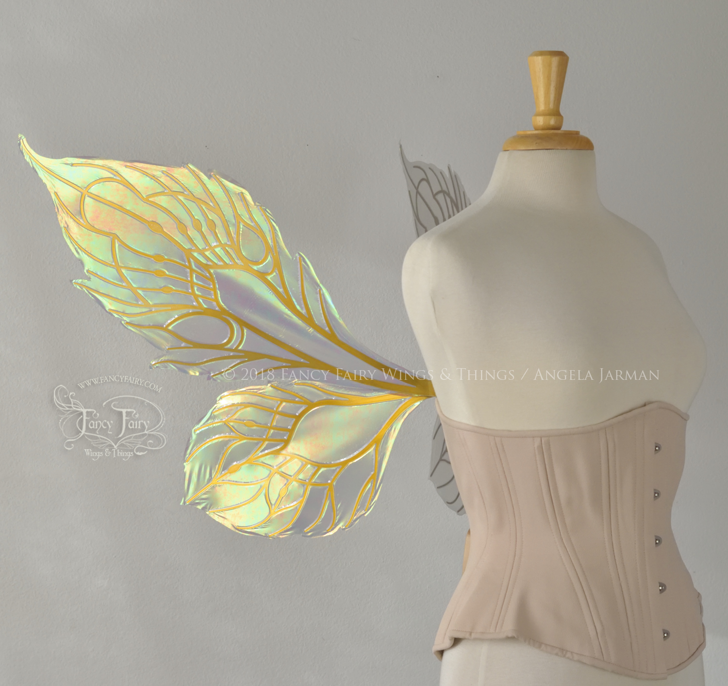 All Fancy Fairy wings are cut from a .040" thick lightweight yet sturdy aluminum sheet frame that's been powder coated and encased in iridescent film and vinyl laminate. They can be worn with the included clear elastic straps although ribbon or stronger elastic is recommended, or tucked into any snug bodice, bra strap or corset for even more comfort. They can be gently bent and posed to give them an even more life-like appearance!