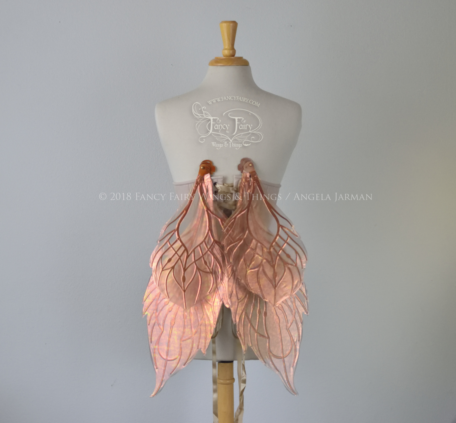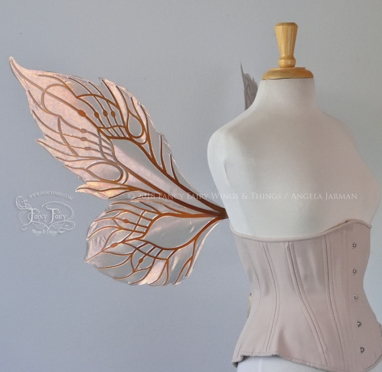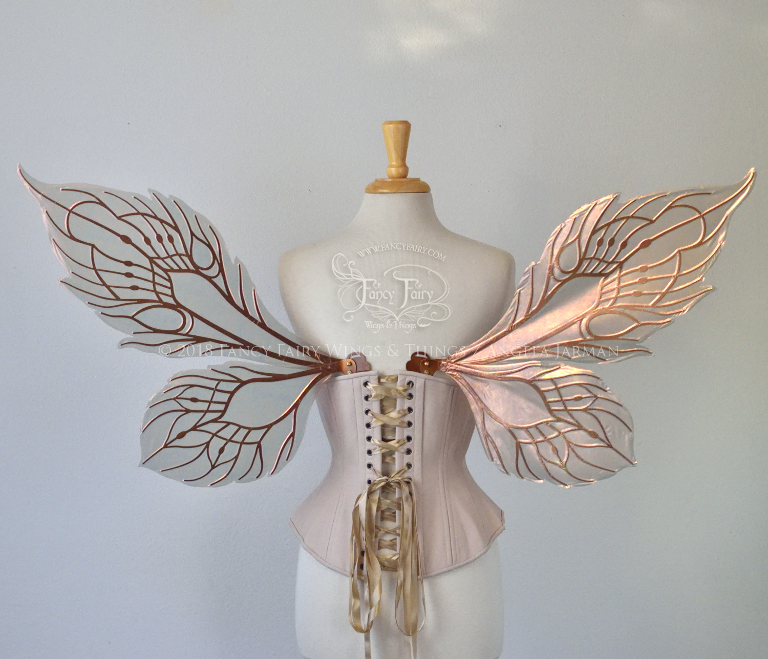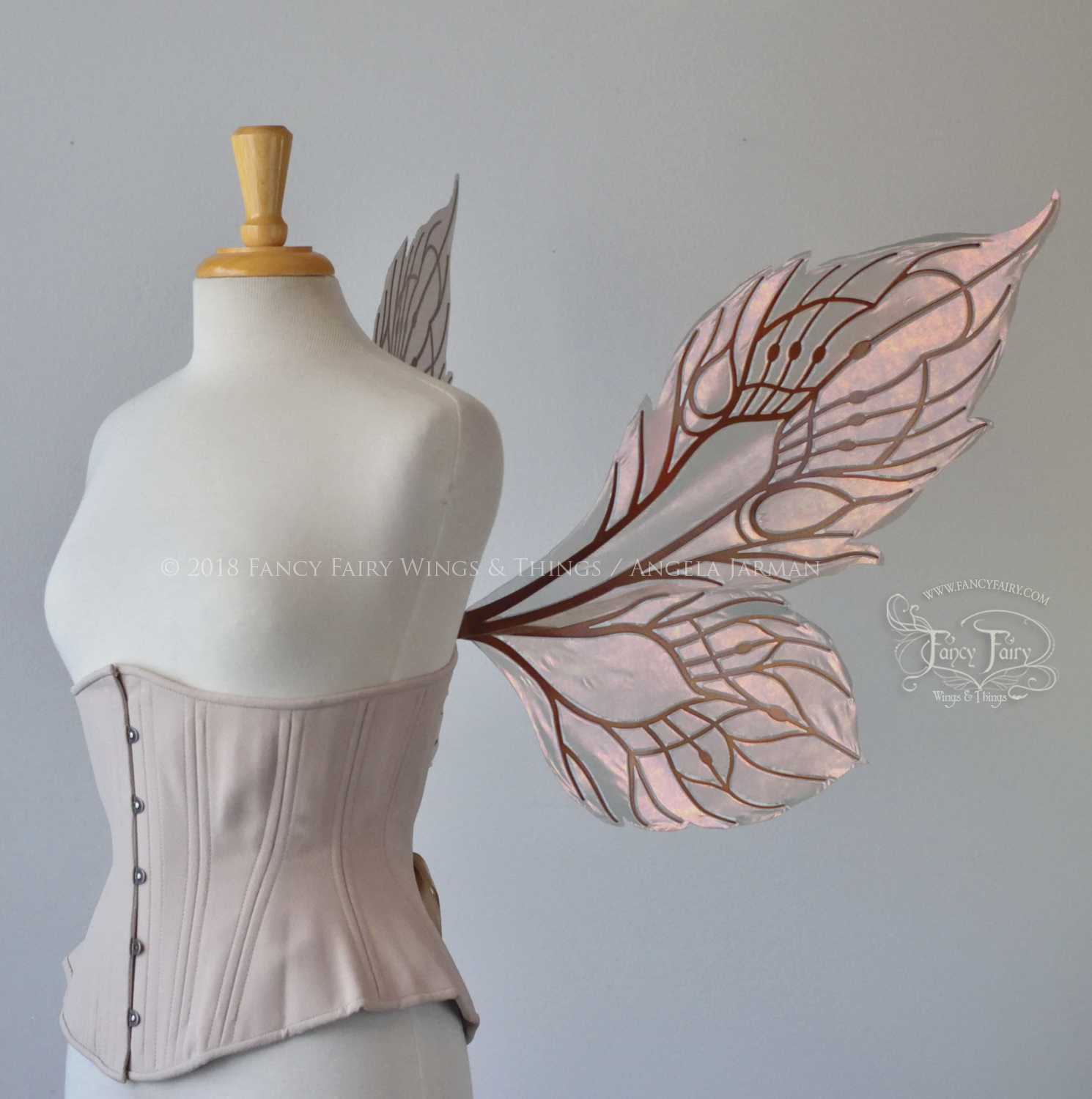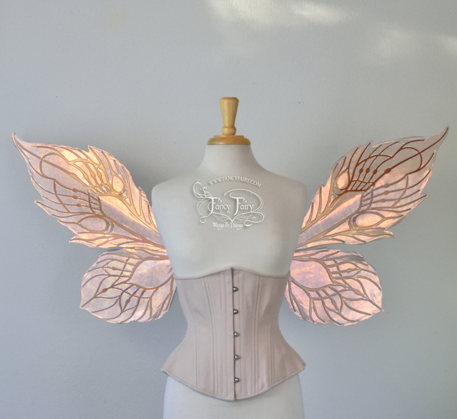 All Fancy Fairy wings are cut from a .040" thick lightweight yet sturdy aluminum sheet frame that's been powder coated and encased in iridescent film and vinyl laminate. They can be worn with the included clear elastic straps although ribbon or stronger elastic is recommended, or tucked into any snug bodice or corset for even more comfort. They can be gently bent and posed to give them an even more life-like appearance!