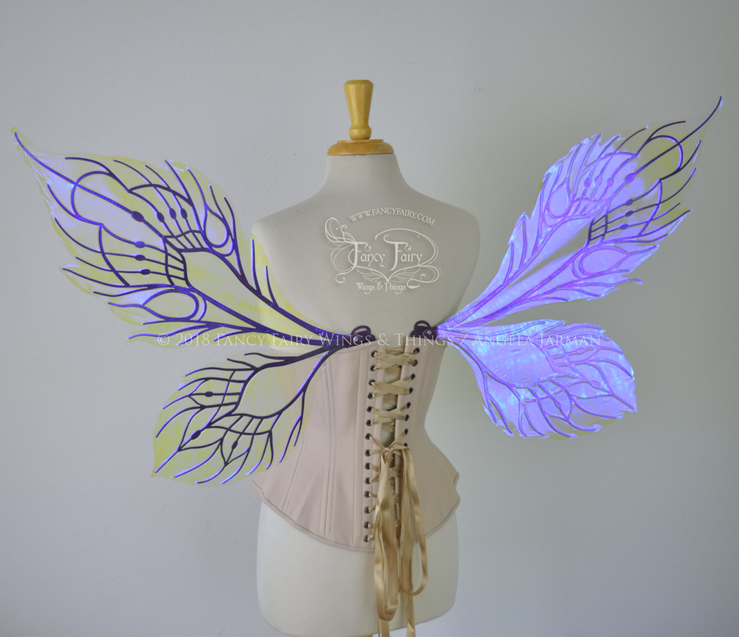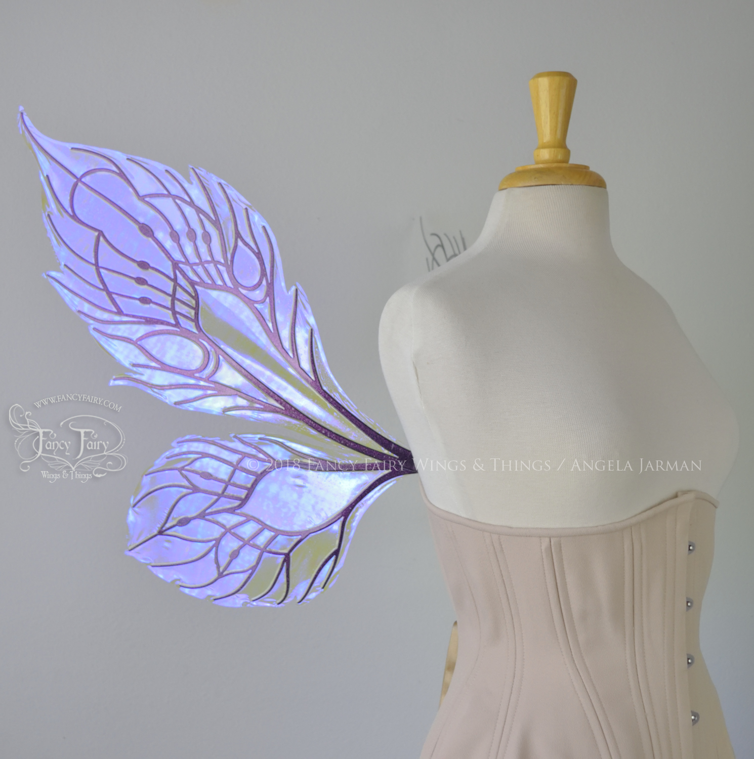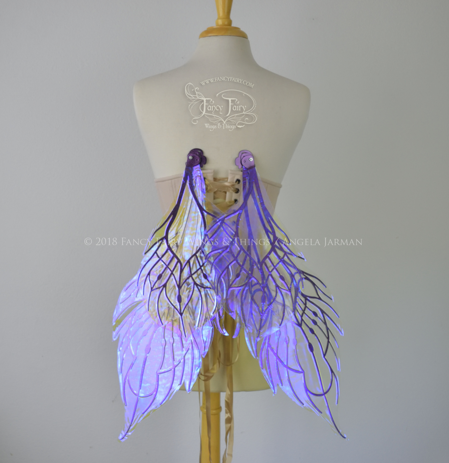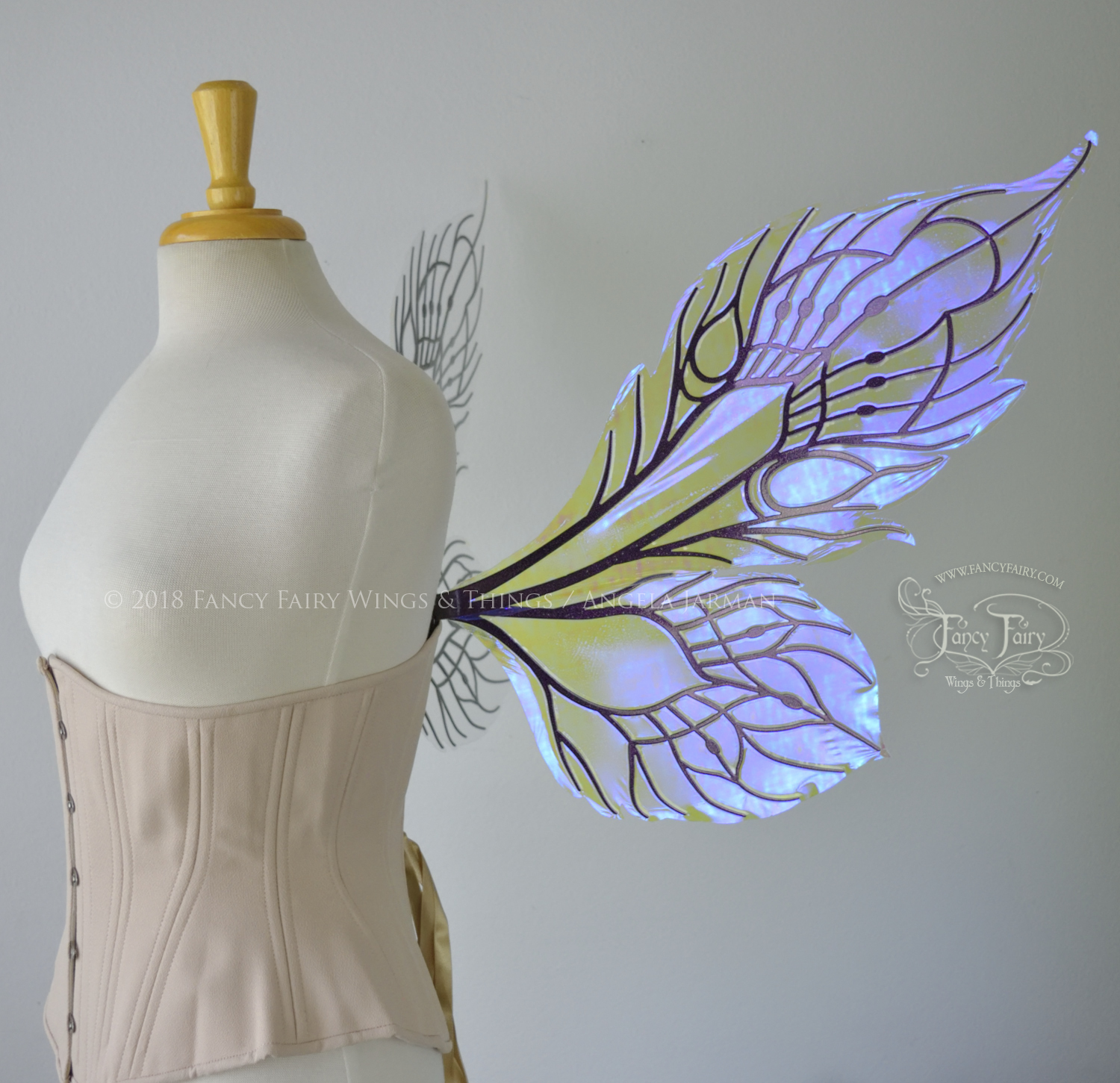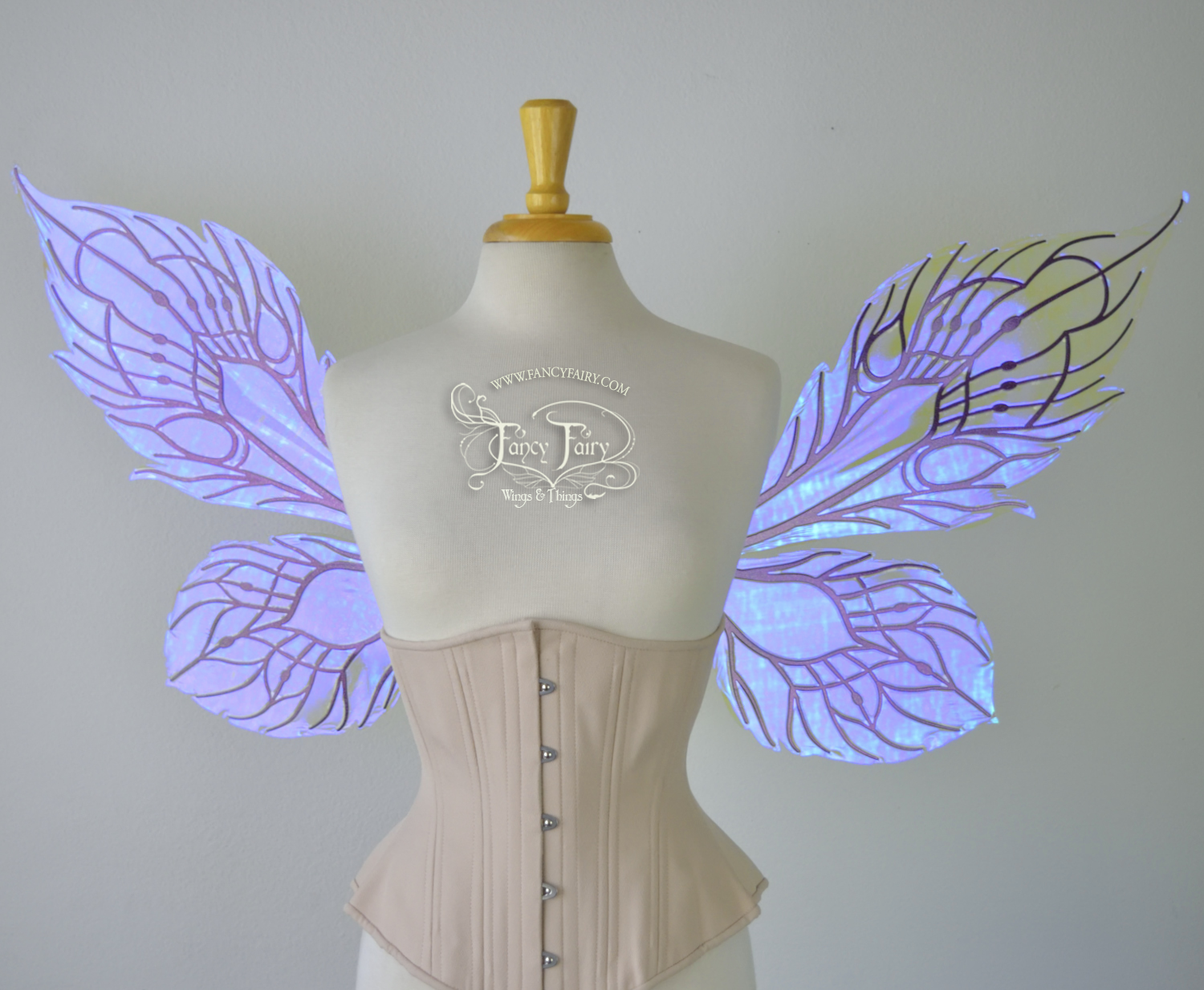 All Fancy Fairy wings are cut from a .040" thick lightweight yet sturdy aluminum sheet frame that's been powder coated and encased in iridescent film and vinyl laminate. They can be worn with the included clear elastic straps although ribbon or stronger elastic is recommended, or tucked into any snug bodice, bra strap or corset for even more comfort. They can be gently bent and posed to give them an even more life-like appearance!