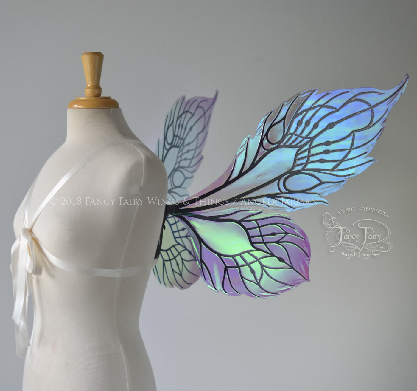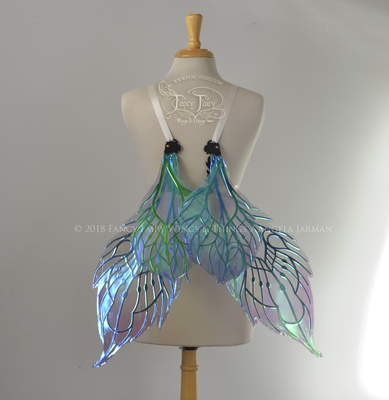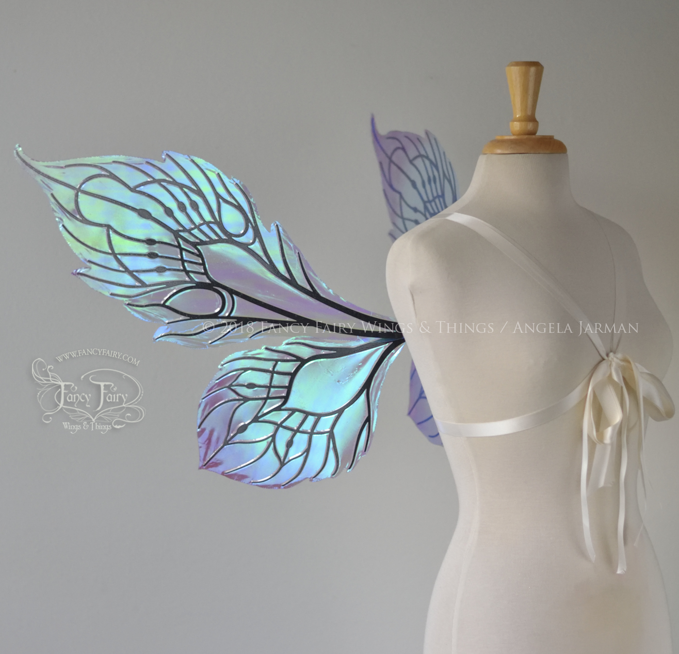 All Fancy Fairy wings are cut from a .040" thick lightweight yet sturdy aluminum sheet frame that's been powder coated and encased in iridescent film and vinyl laminate. They can be worn with the included clear elastic straps although ribbon or stronger elastic is recommended, or tucked into any snug bodice, bra strap or corset for even more comfort. They can be gently bent and posed to give them an even more life-like appearance!